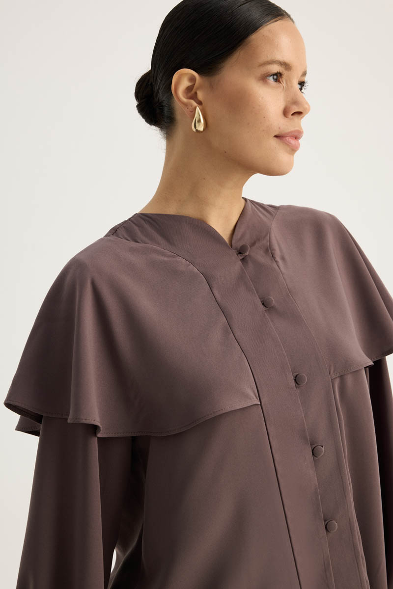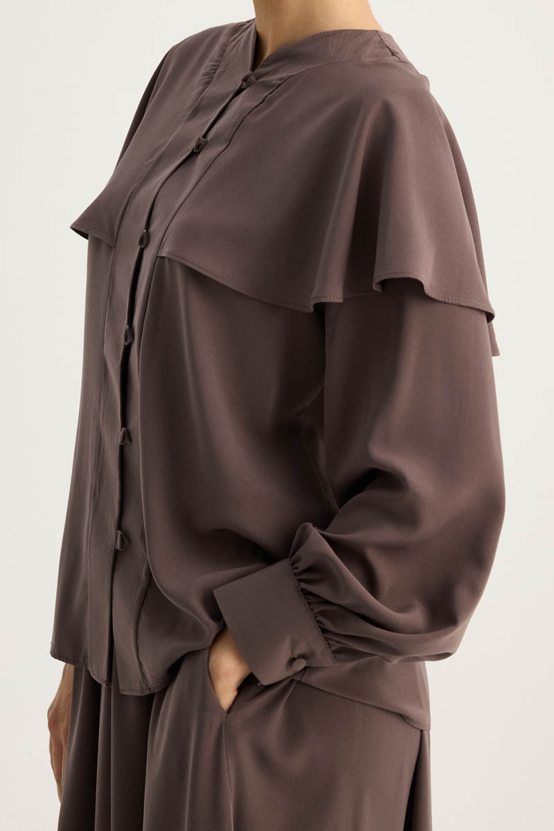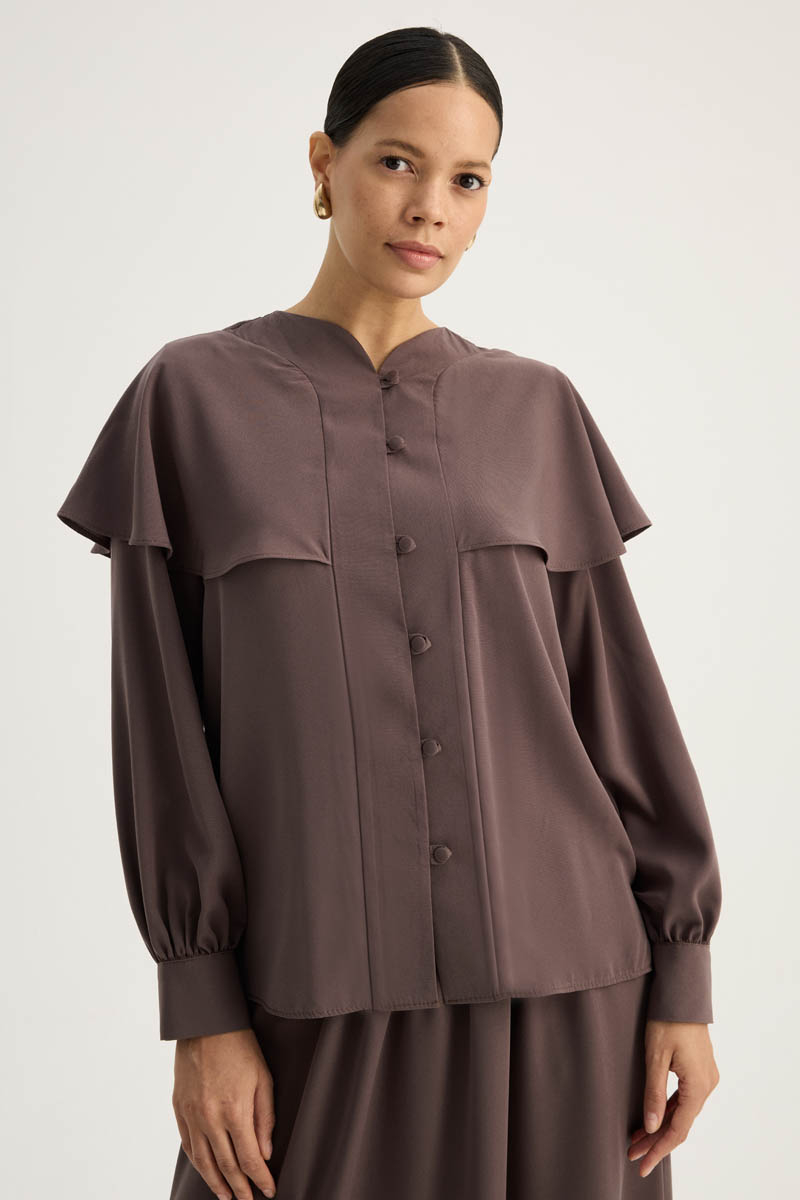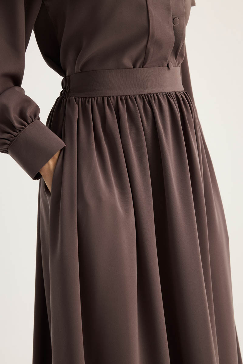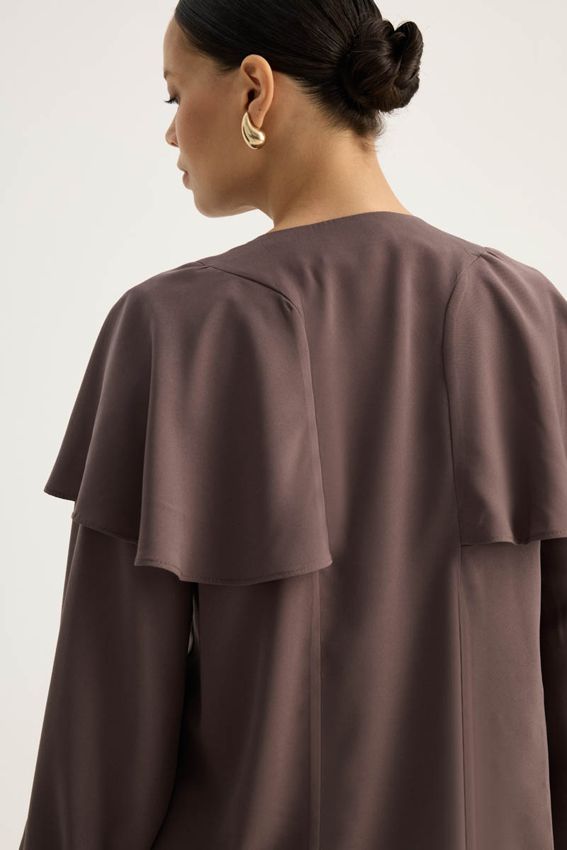 Efil Etek Takım Kahverengi. V yakadır, önden biye düğmelidir, omuzları volanlıdır, bilekten büzgü detaylı ve manşetlidir, etek arkadan lastiklidir, önden düzdür, yandan fermuarlıdır, etek yandan ceplidir, etek kloş kalıptır.