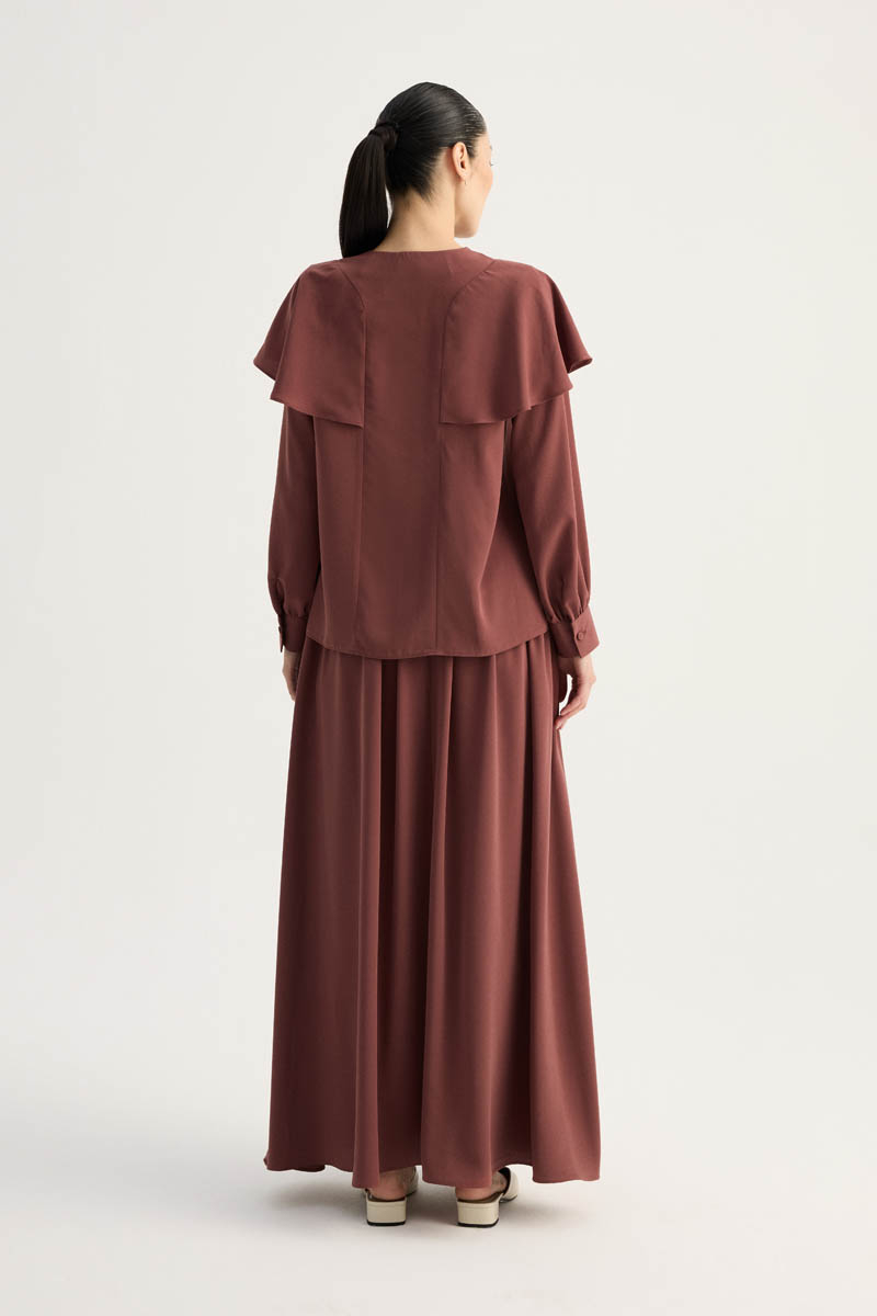 Efil Etek Takım Koyu Somon. V yakadır, önden biye düğmelidir, omuzları volanlıdır, bilekten büzgü detaylı ve manşetlidir, etek arkadan lastiklidir, önden düzdür, yandan fermuarlıdır, etek yandan ceplidir, etek kloş kalıptır.