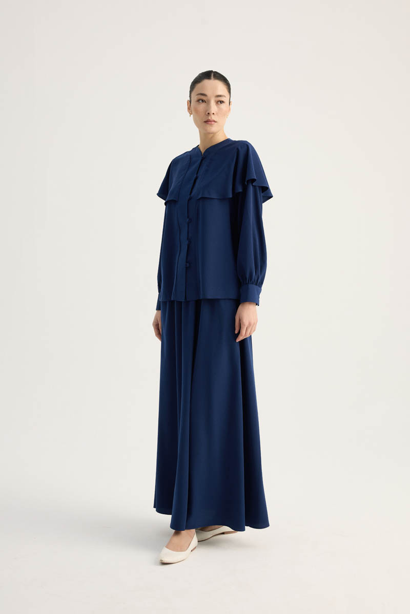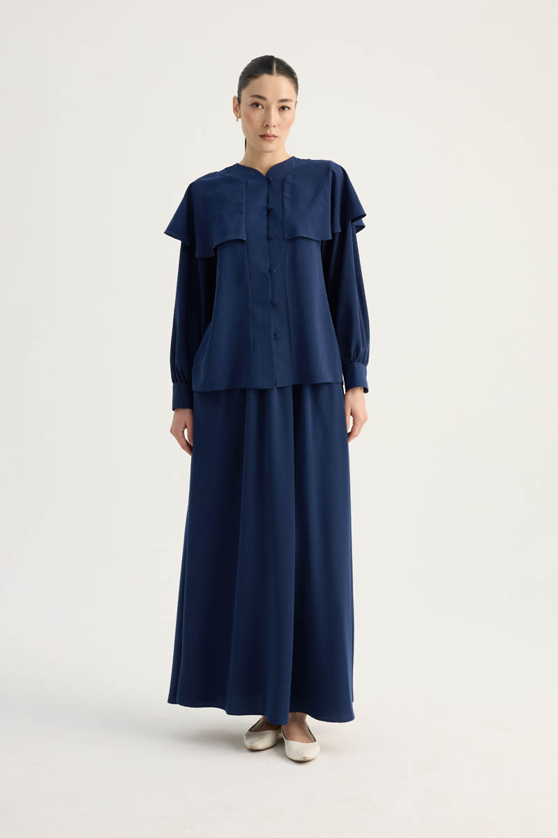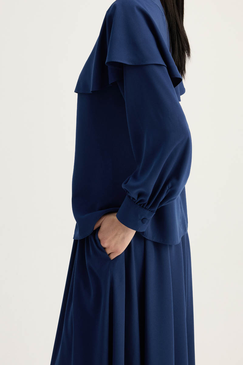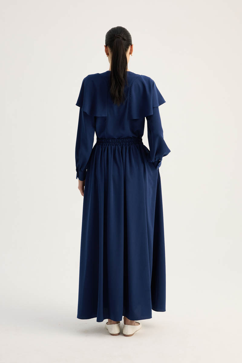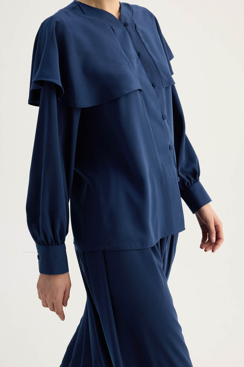 Efil Etek Takım Lacivert. V yakadır, önden biye düğmelidir, omuzları volanlıdır, bilekten büzgü detaylı ve manşetlidir, etek arkadan lastiklidir, önden düzdür, yandan fermuarlıdır, etek yandan ceplidir, etek kloş kalıptır.