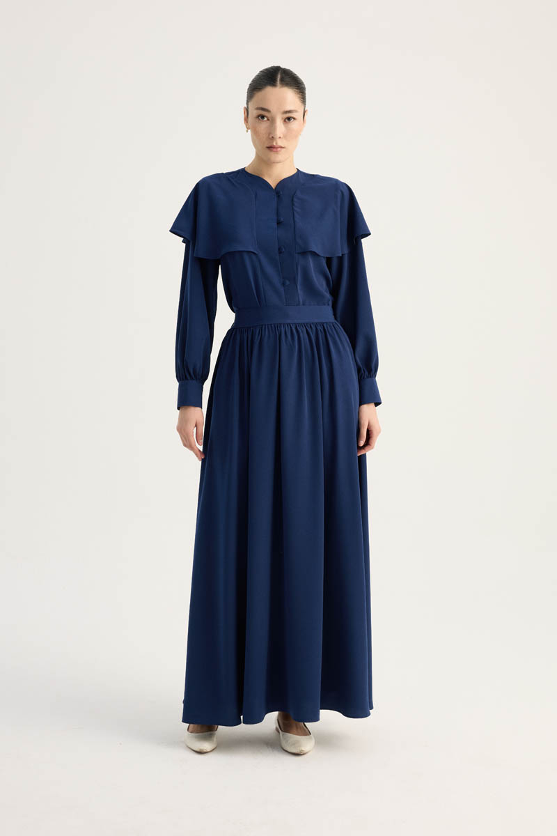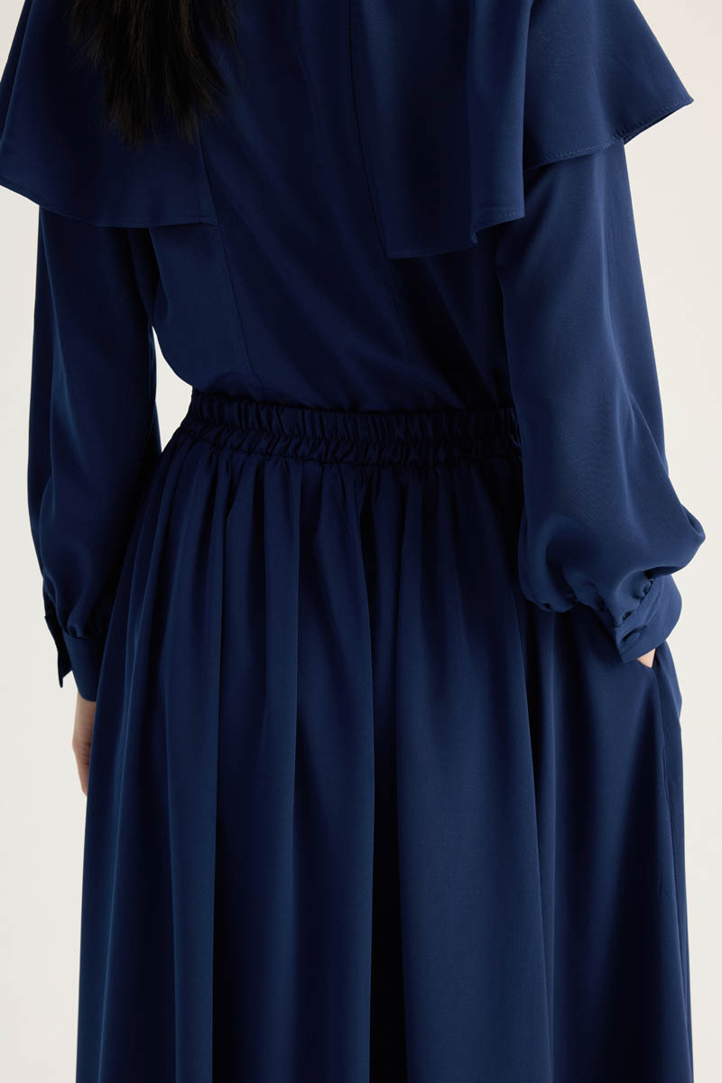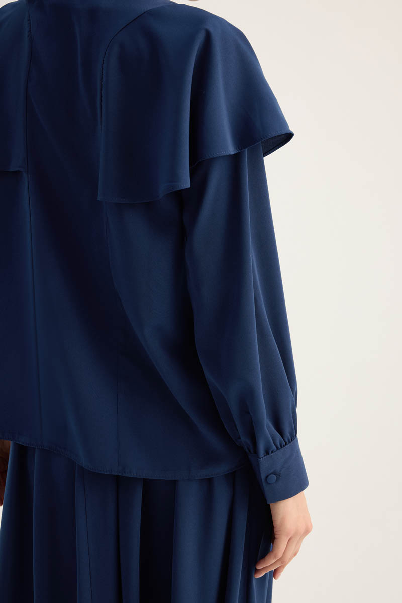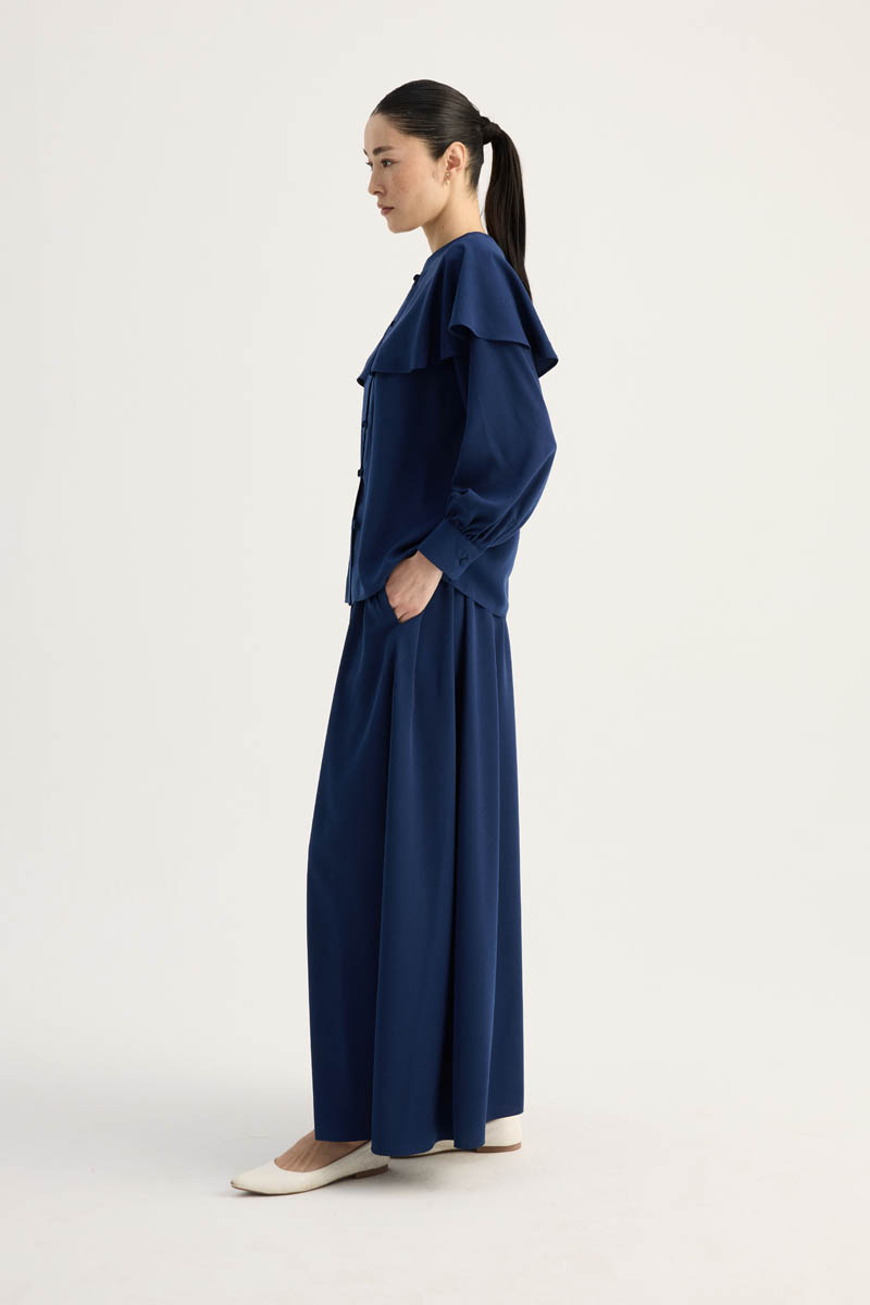 Efil Etek Takım Lacivert. V yakadır, önden biye düğmelidir, omuzları volanlıdır, bilekten büzgü detaylı ve manşetlidir, etek arkadan lastiklidir, önden düzdür, yandan fermuarlıdır, etek yandan ceplidir, etek kloş kalıptır.