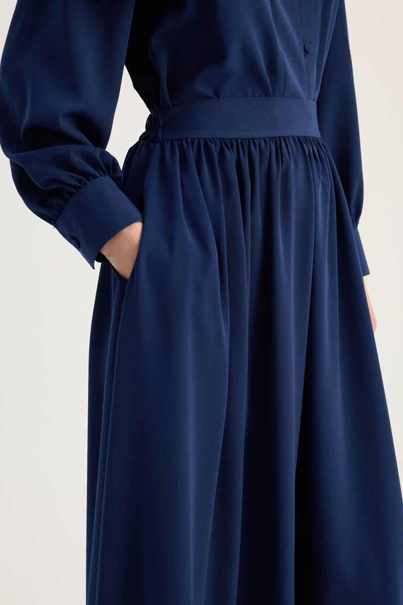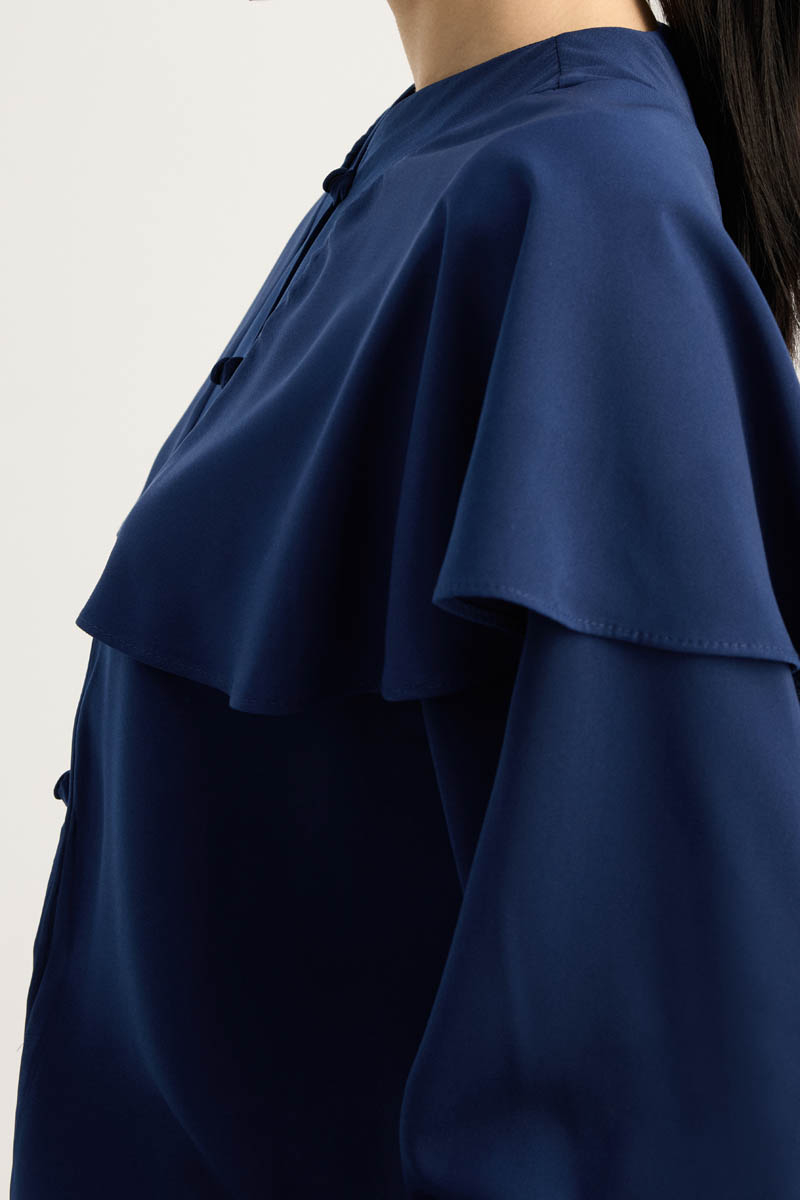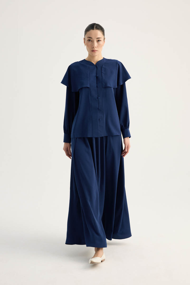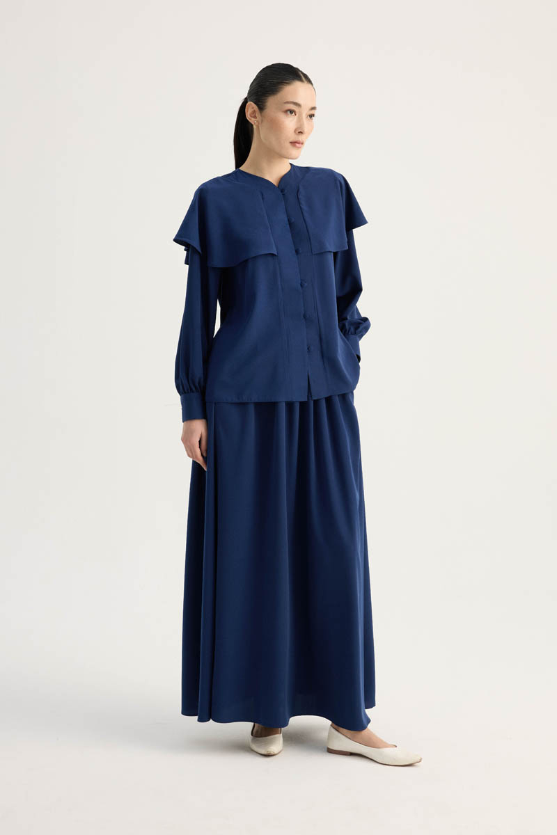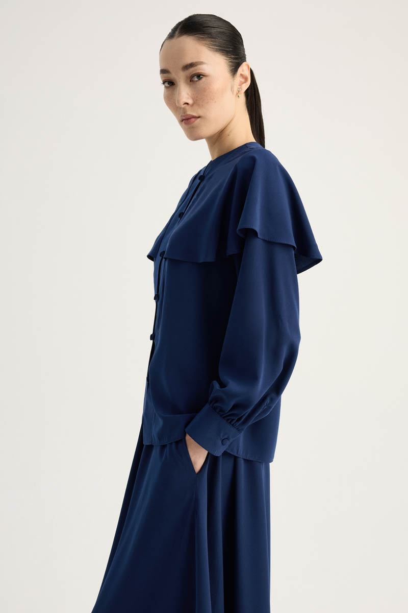 Efil Etek Takım Lacivert. V yakadır, önden biye düğmelidir, omuzları volanlıdır, bilekten büzgü detaylı ve manşetlidir, etek arkadan lastiklidir, önden düzdür, yandan fermuarlıdır, etek yandan ceplidir, etek kloş kalıptır.