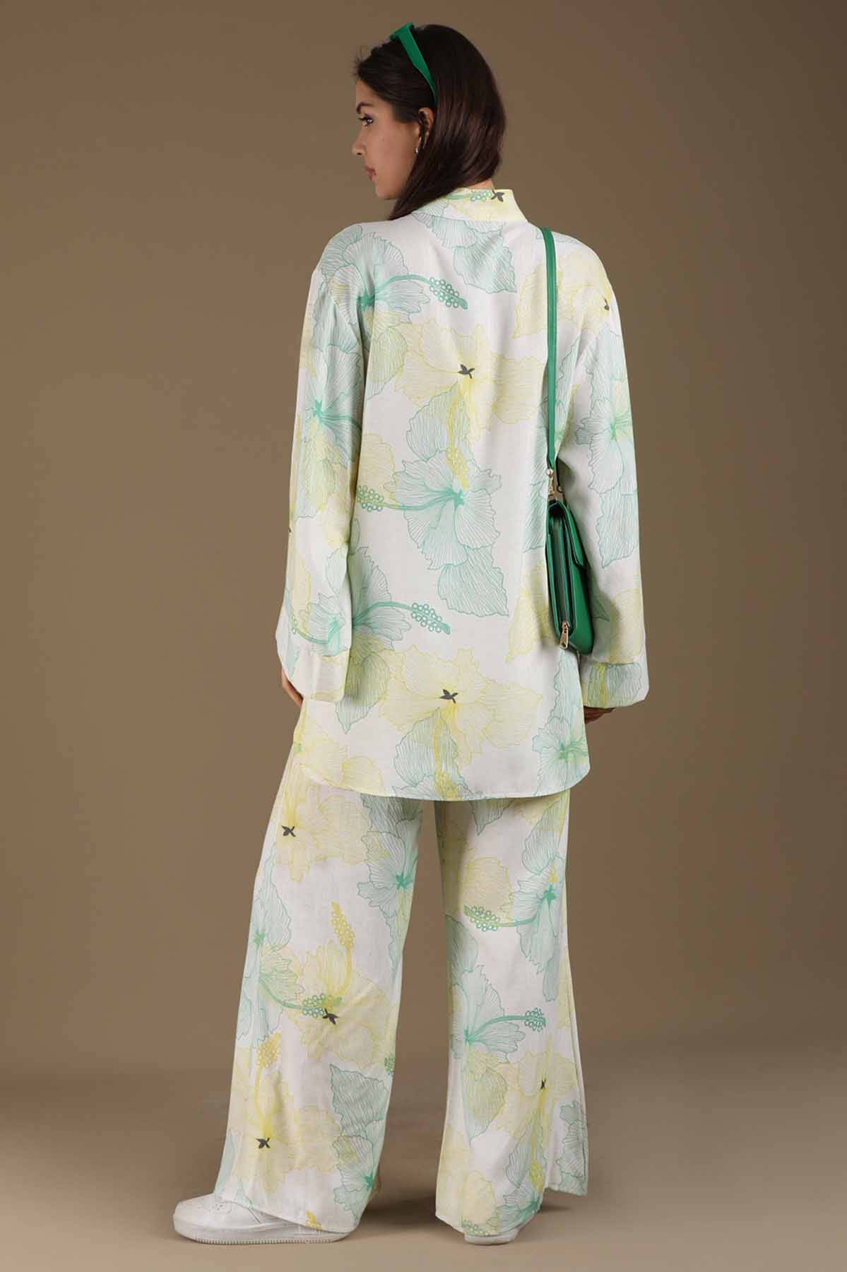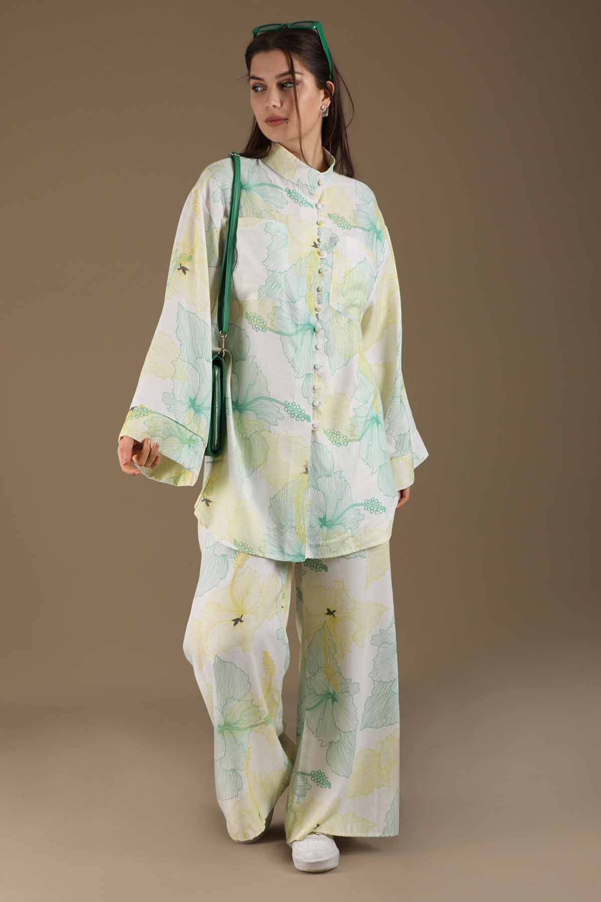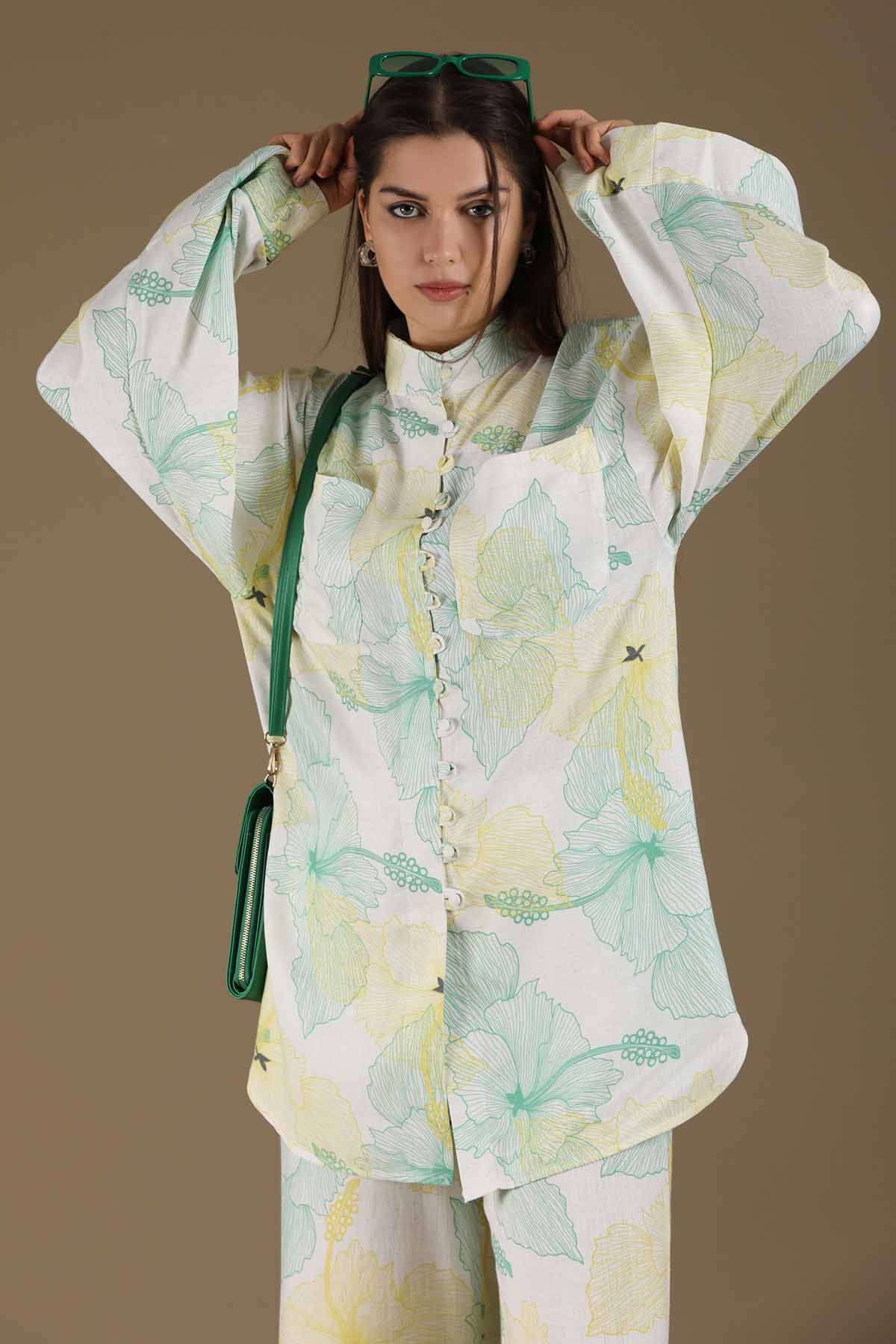 Hakim yaka, önden brit düğmeli, pantolon beli lastikli, pantolon ceplidir. İç göstermez. Rahat kalıp.