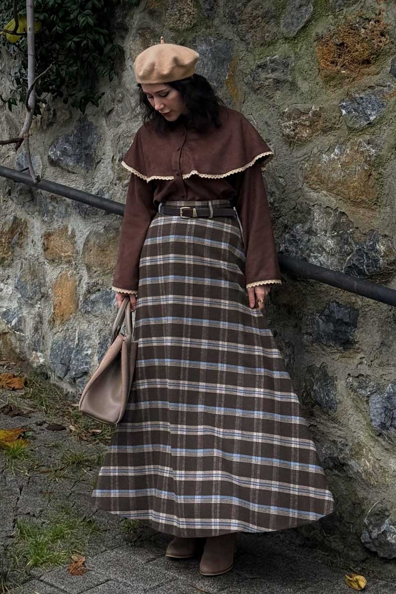 Ekose Desenli A Kesim Etek Kahverengi, klasik dokuyu modern bir kesimle buluşturuyor. A formundaki siluetiyle zarif bir duruş sunarken, ekose deseniyle mevsim ruhuna uyum sağlar. Bel kısmındaki dikiş detayları vücut formunu vurgularken, doğal dokulu kumaşı gün boyu rahatlık sunar. Triko kazaklar, gömlekler veya blazer ceketlerle kolayca kombinlenebilir.