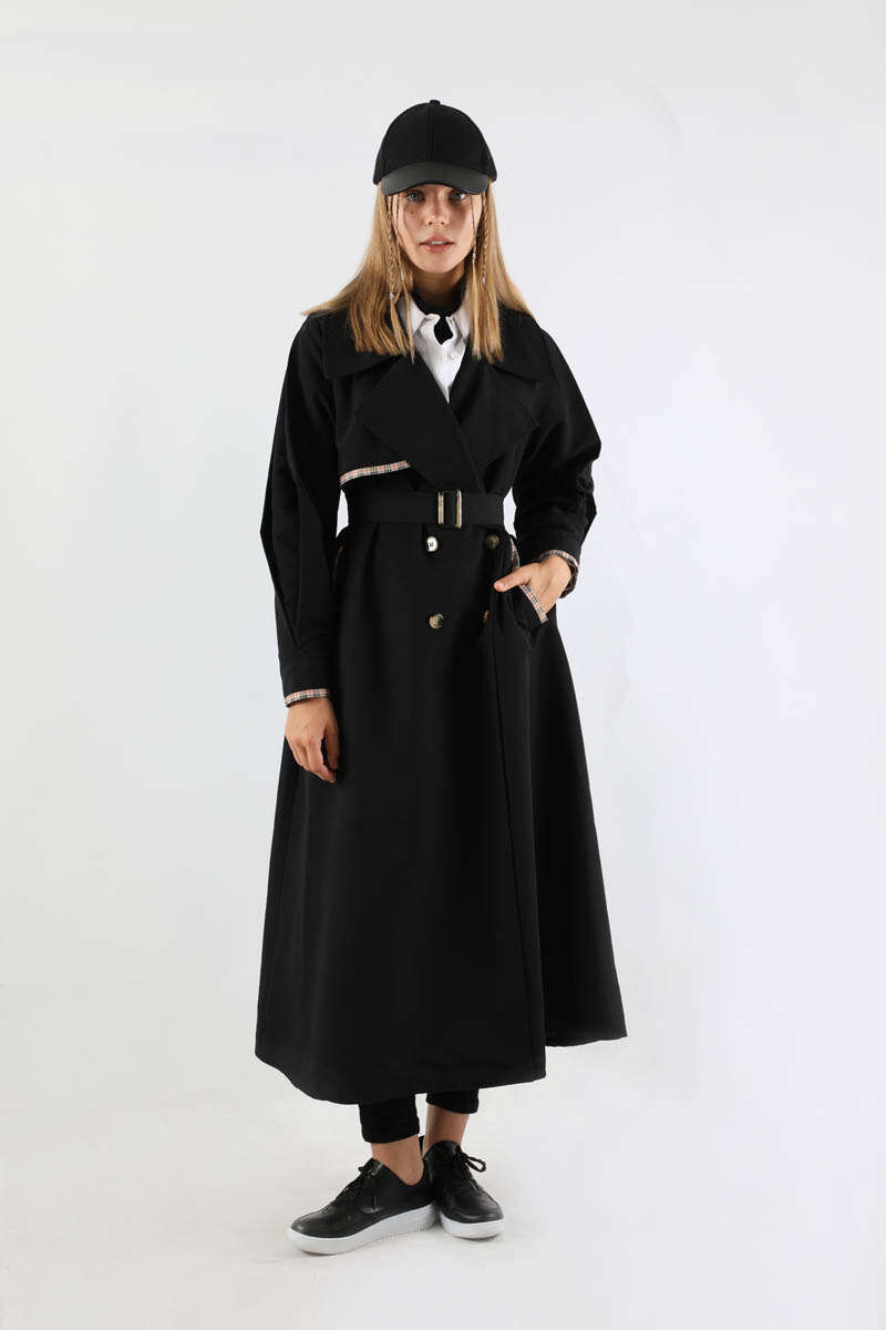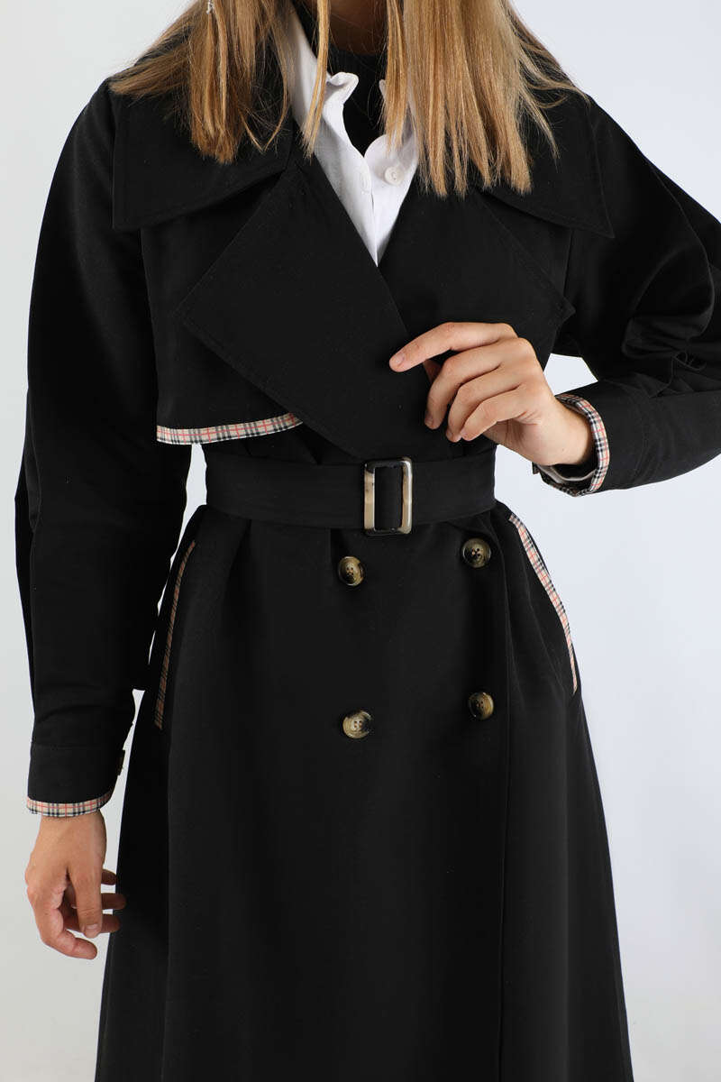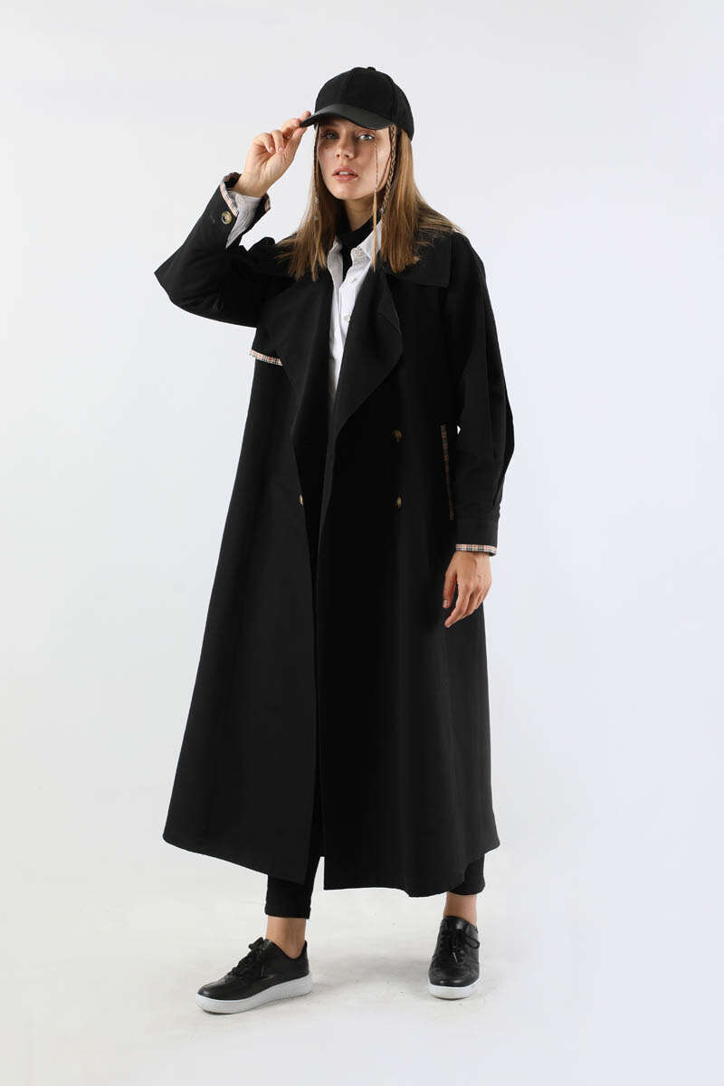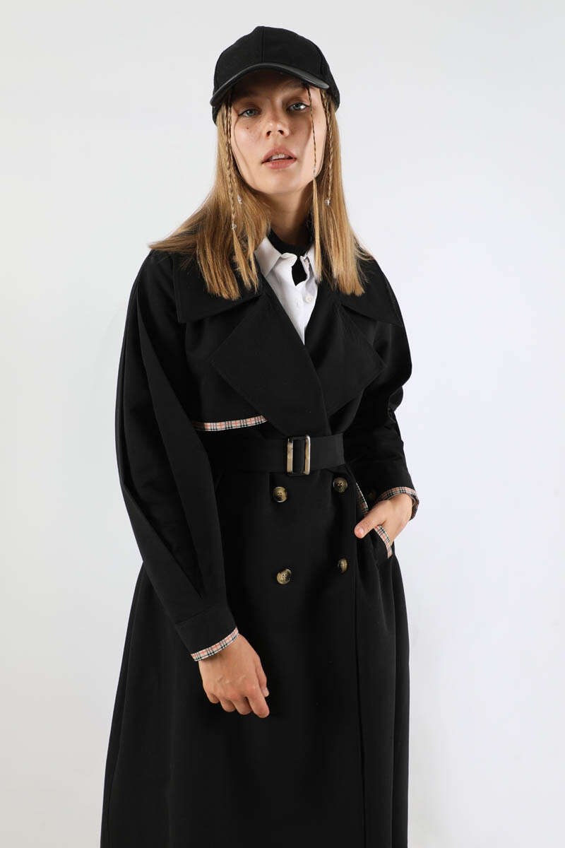 Ekose Detaylı Trençkot Siyah