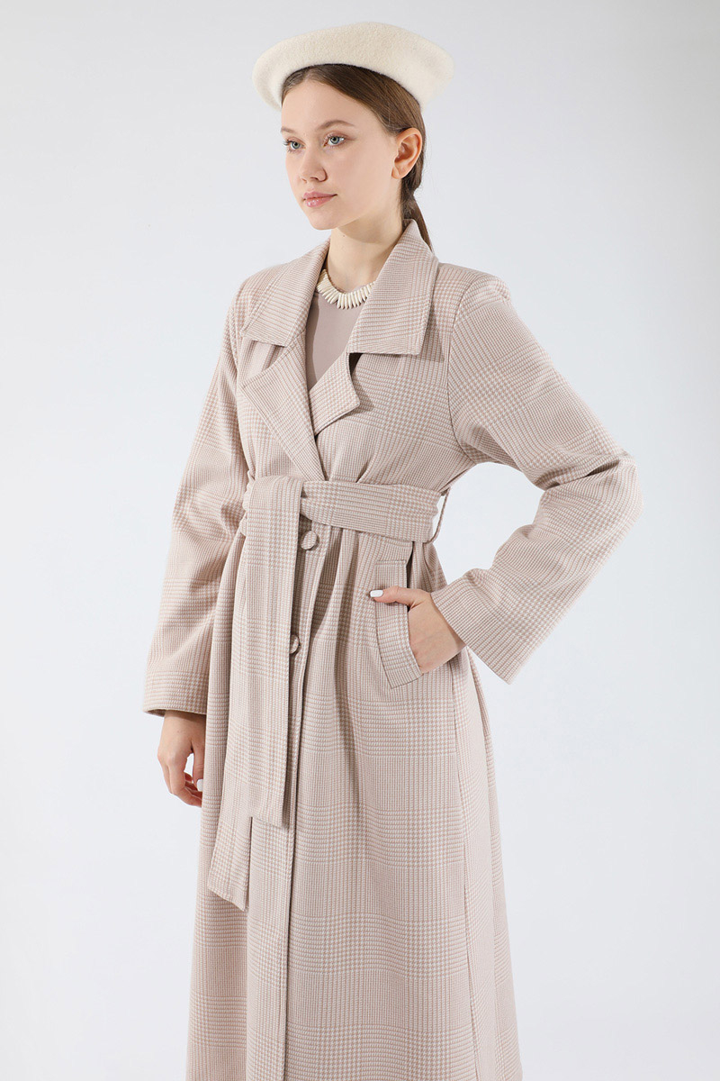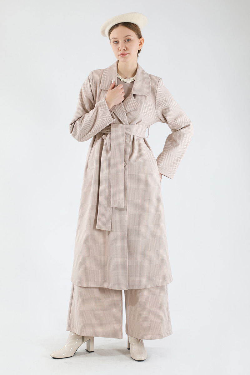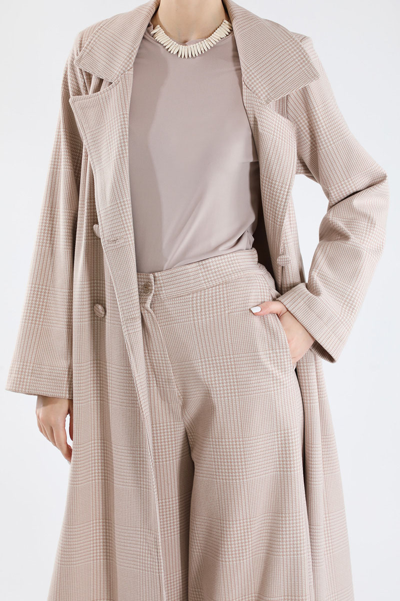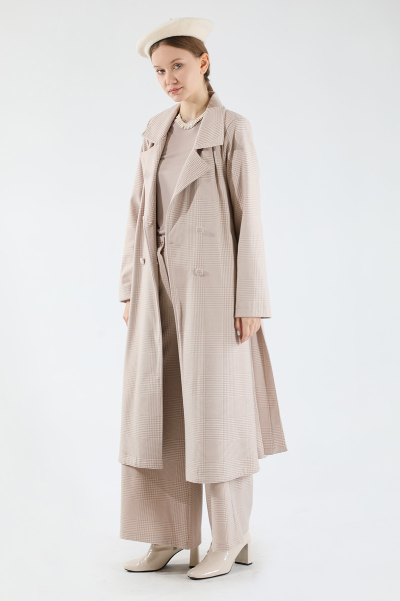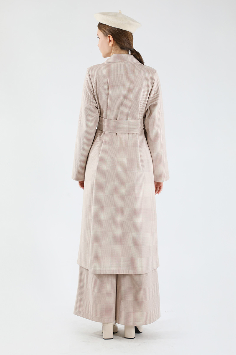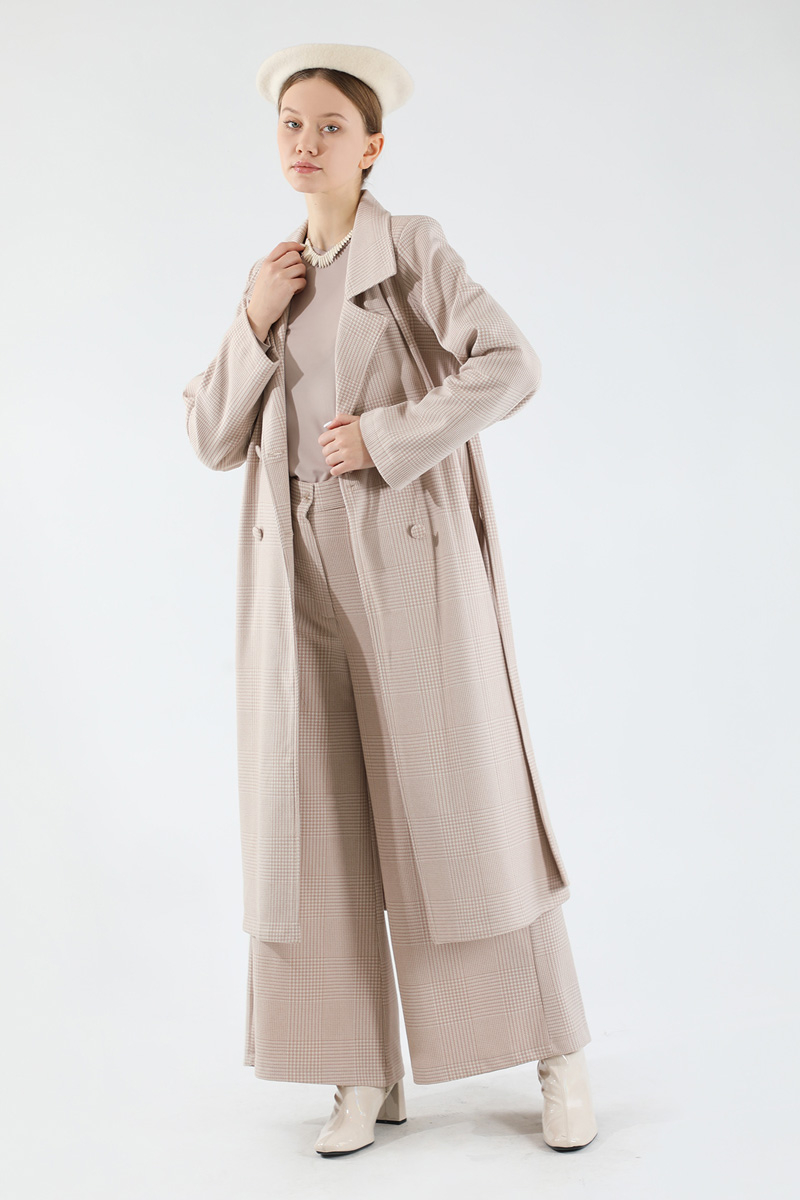 Ekose Uzun Ceket Takım Vizon
