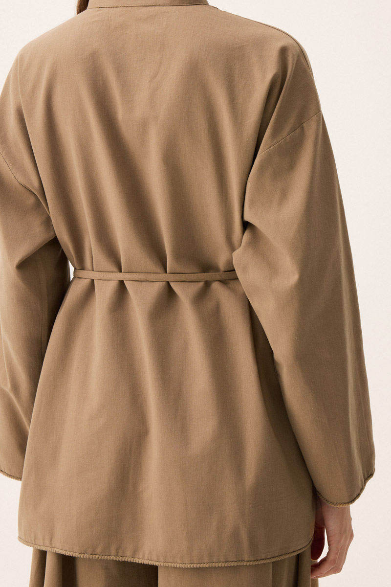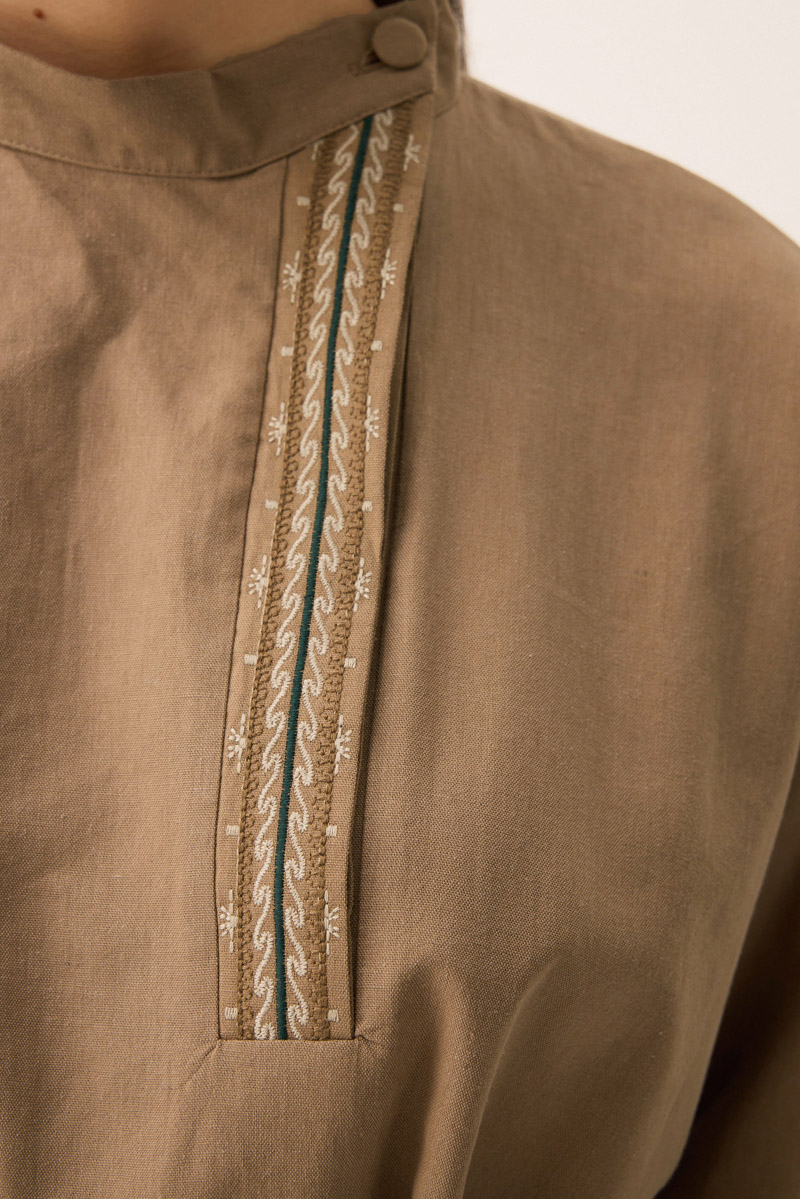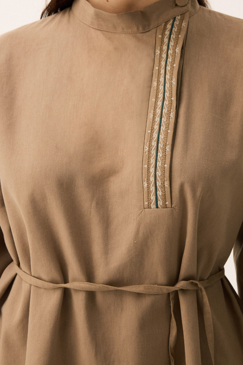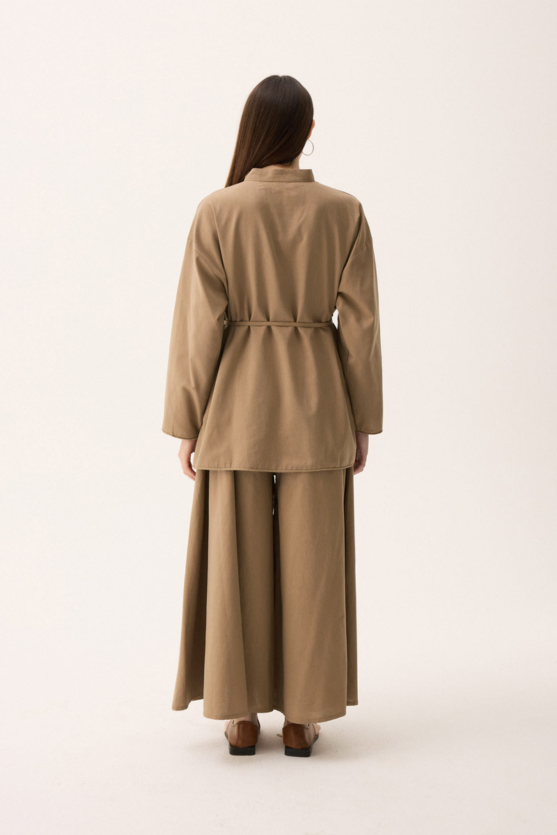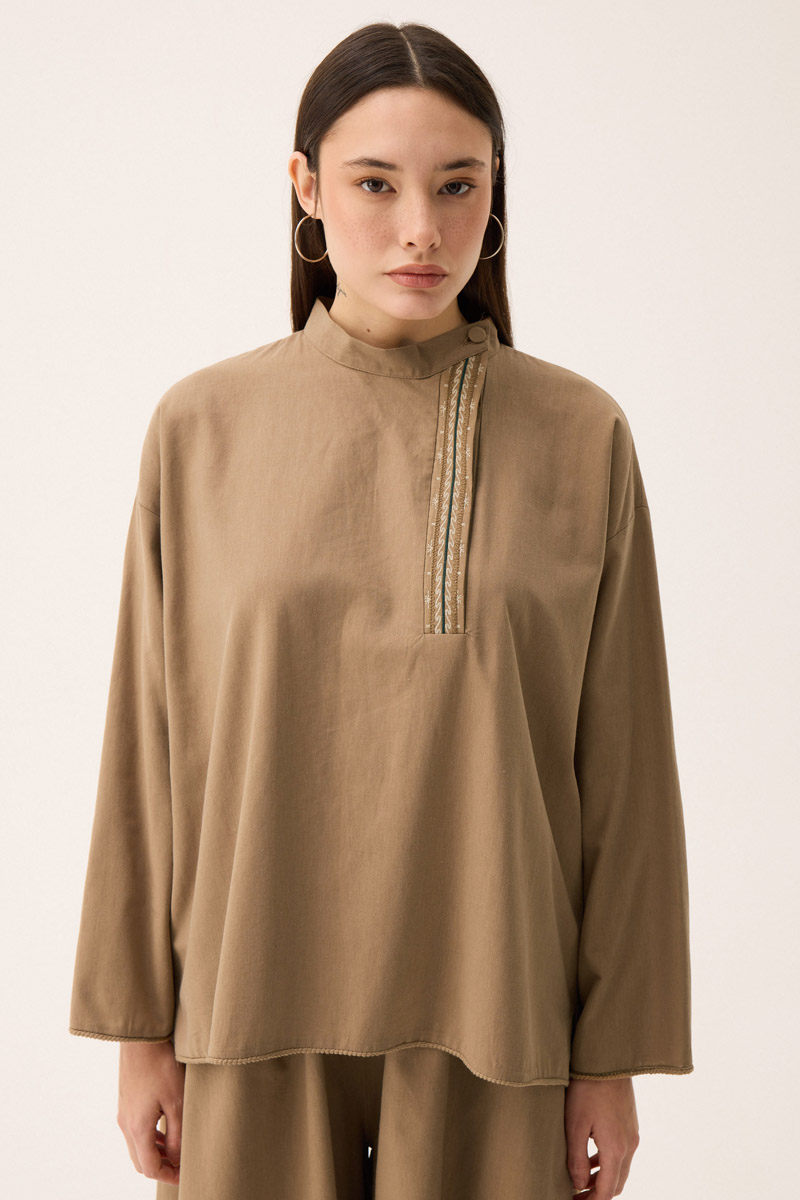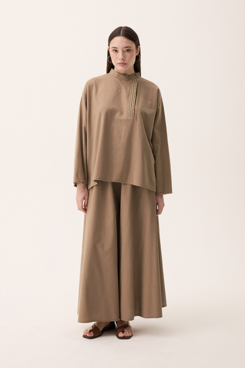 Elay Keten Takım Camel. Hakim yakadır, patı nakış detaylıdır, üst bluz etek ucu ve kol ucu pamuk şerit detaylıdır, beli biye ile bağlamalıdır. bluz önü kısa arkası uzundur, pantolon etek beli lastiklidir, yandan ceplidir, bol kalıptır. Günlük kullanım ve özel günlerinizde tercih edebilirsiniz.