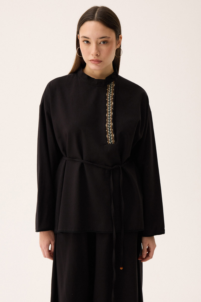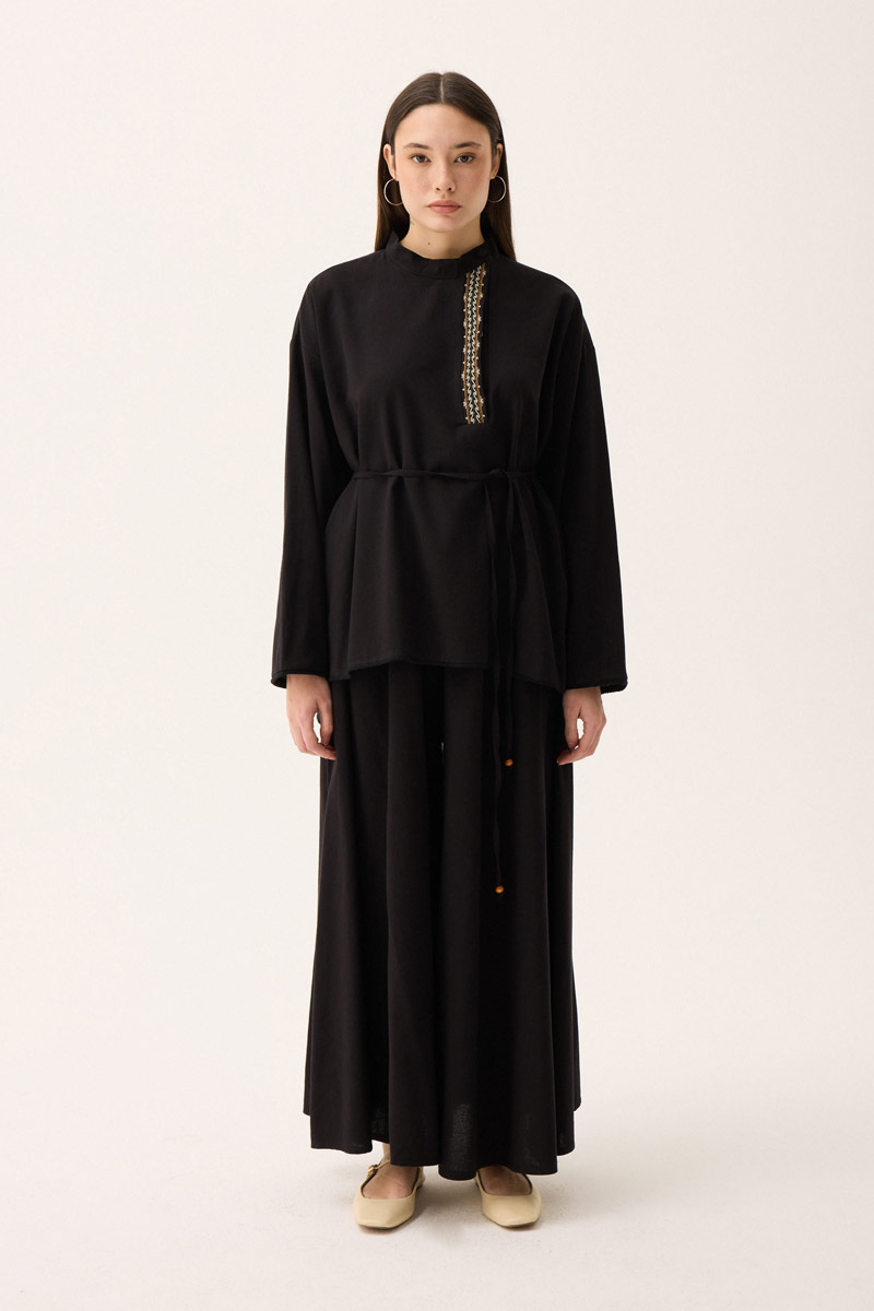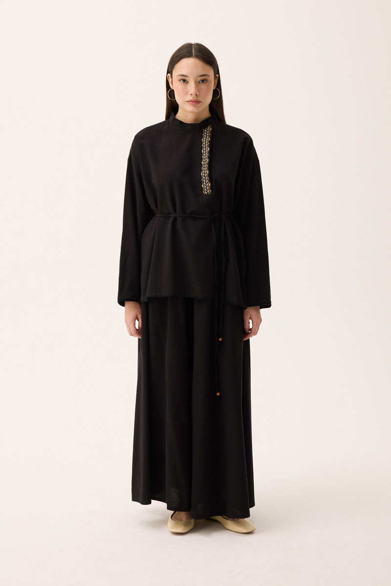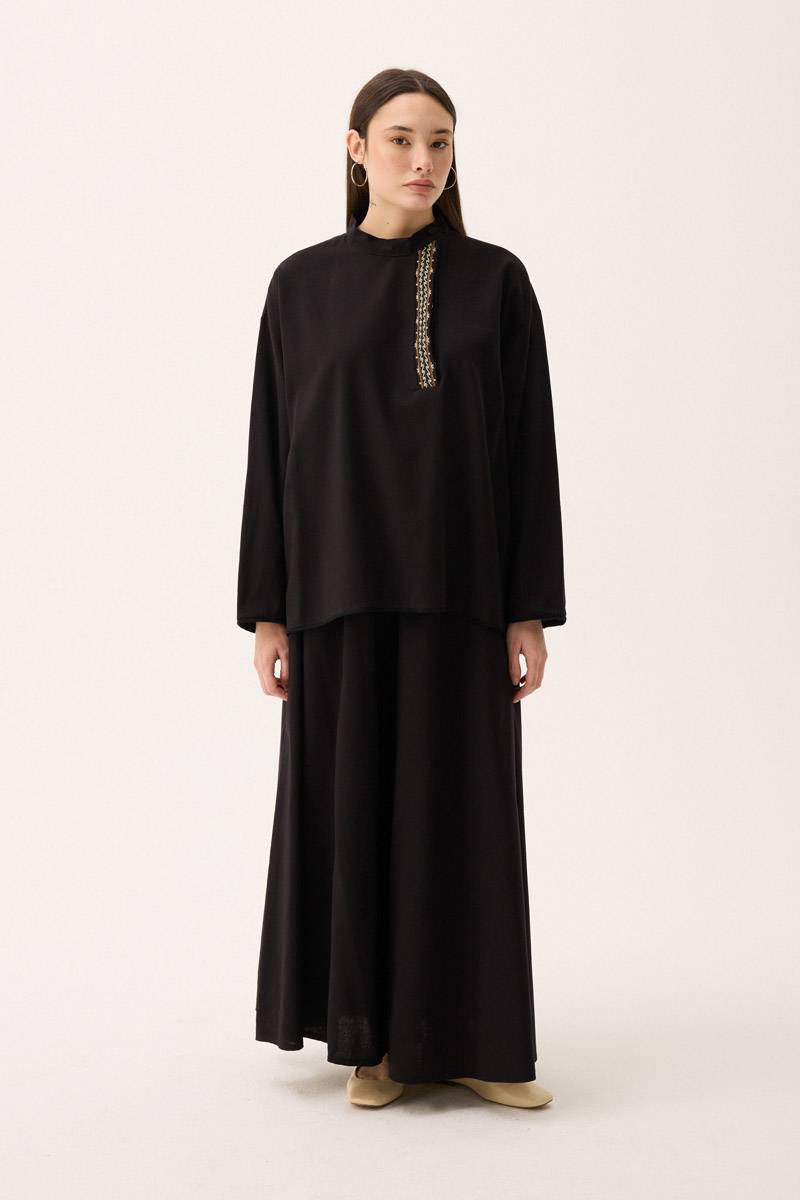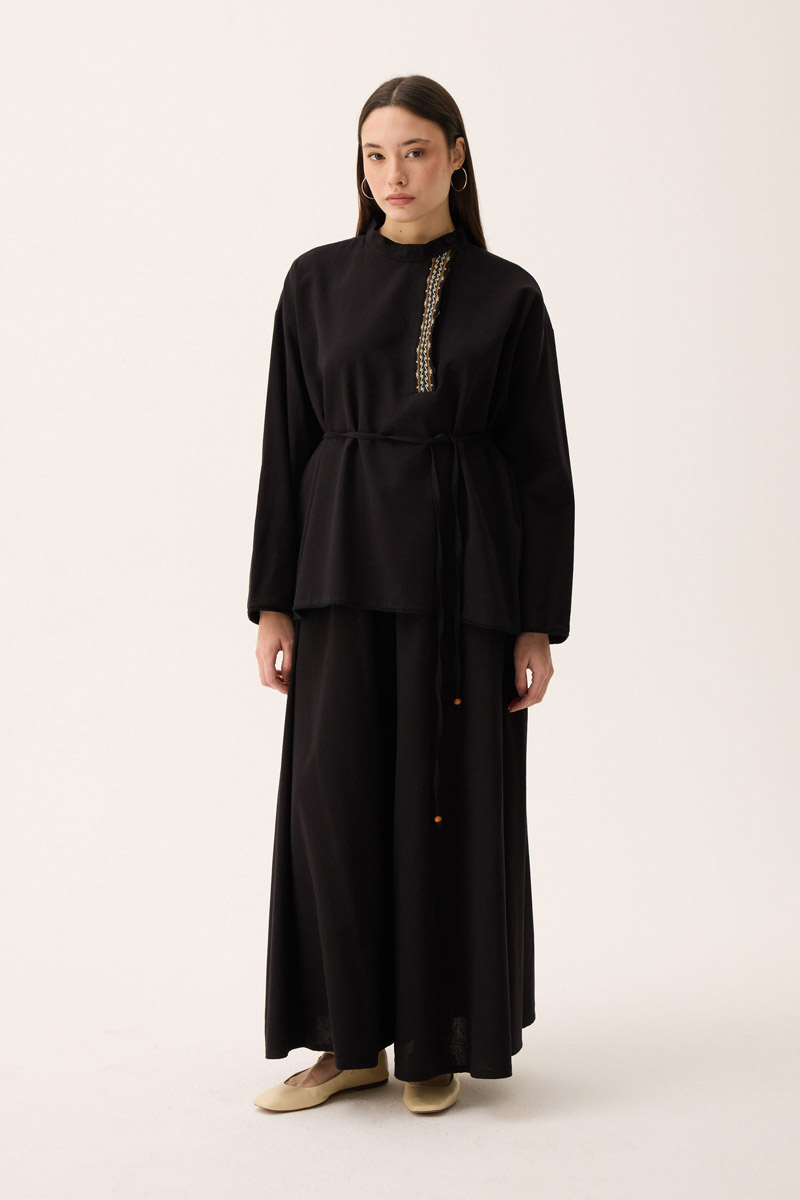 Elay Keten Takım Siyah. Hakim yakadır, patı nakış detaylıdır, üst bluz etek ucu ve kol ucu pamuk şerit detaylıdır, beli biye ile bağlamalıdır. bluz önü kısa arkası uzundur, pantolon etek beli lastiklidir, yandan ceplidir, bol kalıptır. Günlük kullanım ve özel günlerinizde tercih edebilirsiniz.