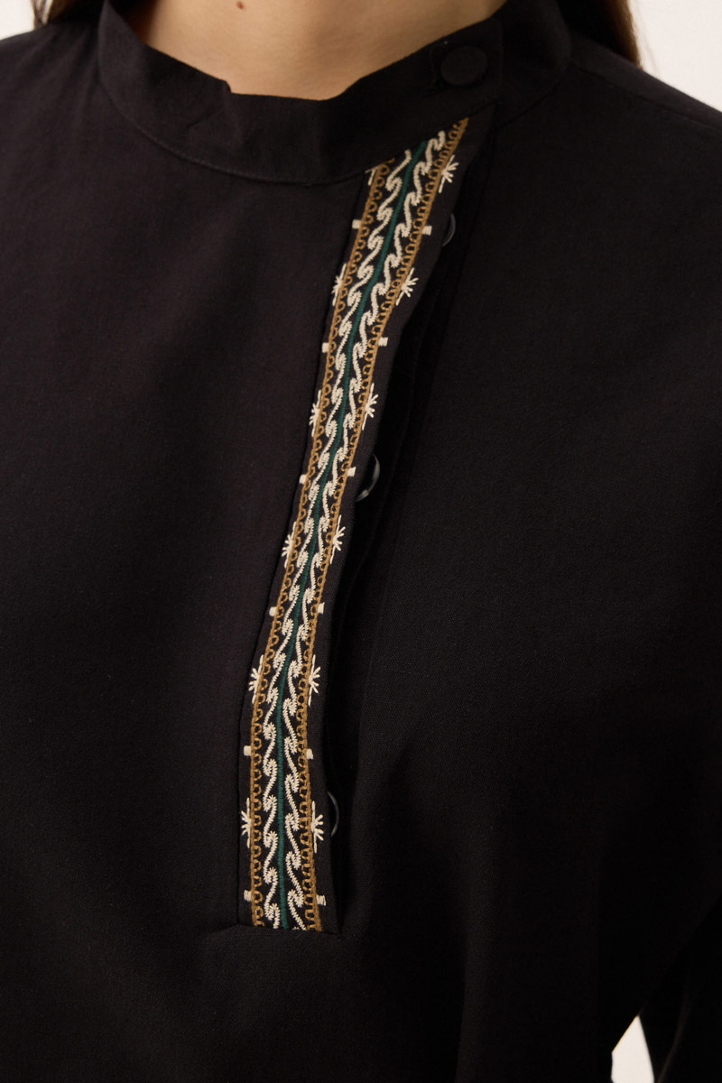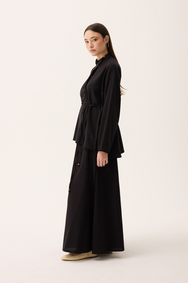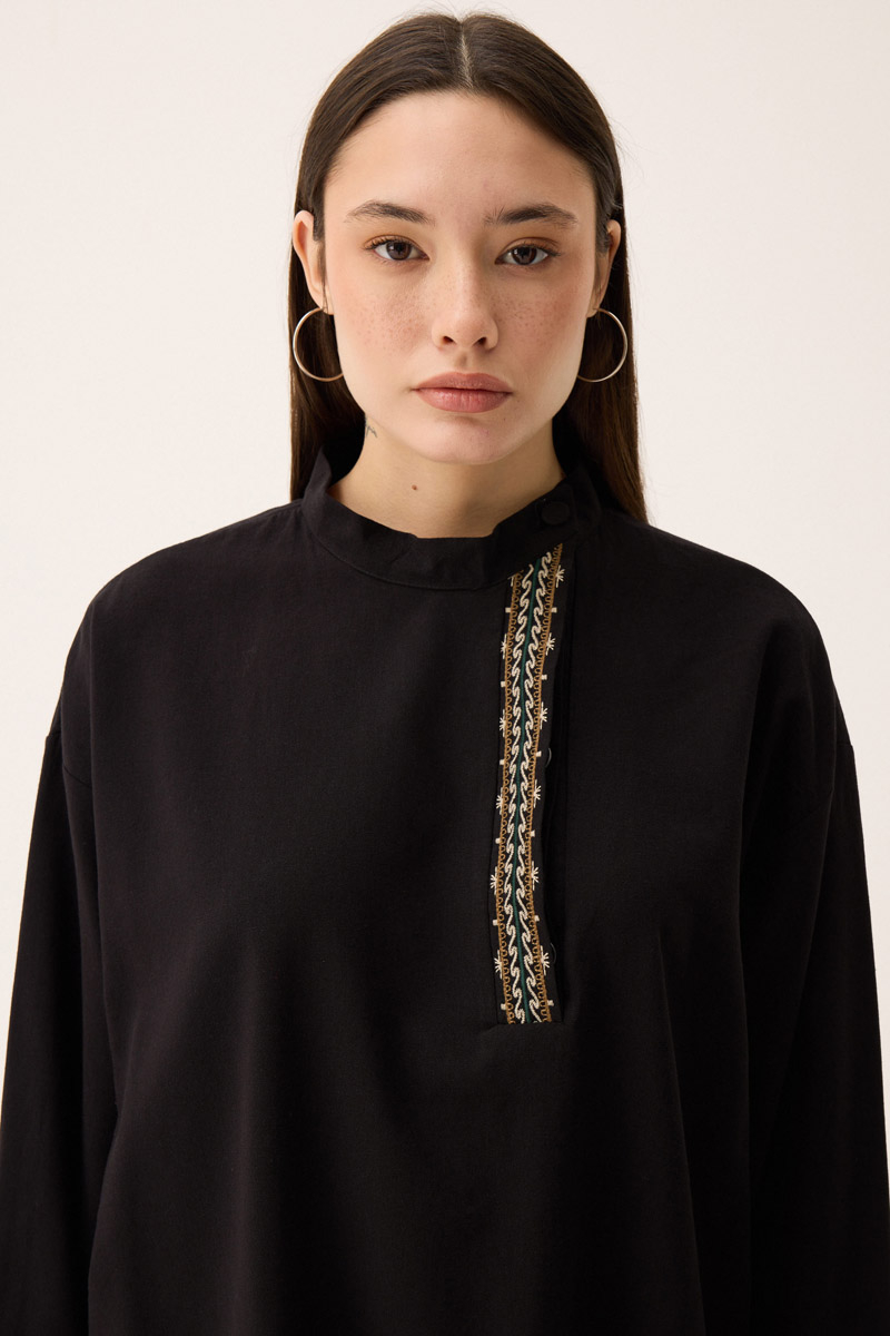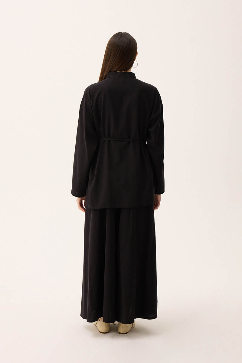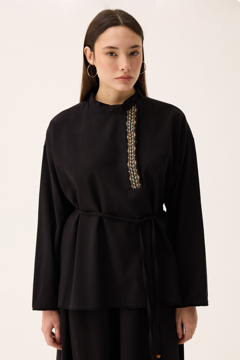 Elay Keten Takım Siyah. Hakim yakadır, patı nakış detaylıdır, üst bluz etek ucu ve kol ucu pamuk şerit detaylıdır, beli biye ile bağlamalıdır. bluz önü kısa arkası uzundur, pantolon etek beli lastiklidir, yandan ceplidir, bol kalıptır. Günlük kullanım ve özel günlerinizde tercih edebilirsiniz.