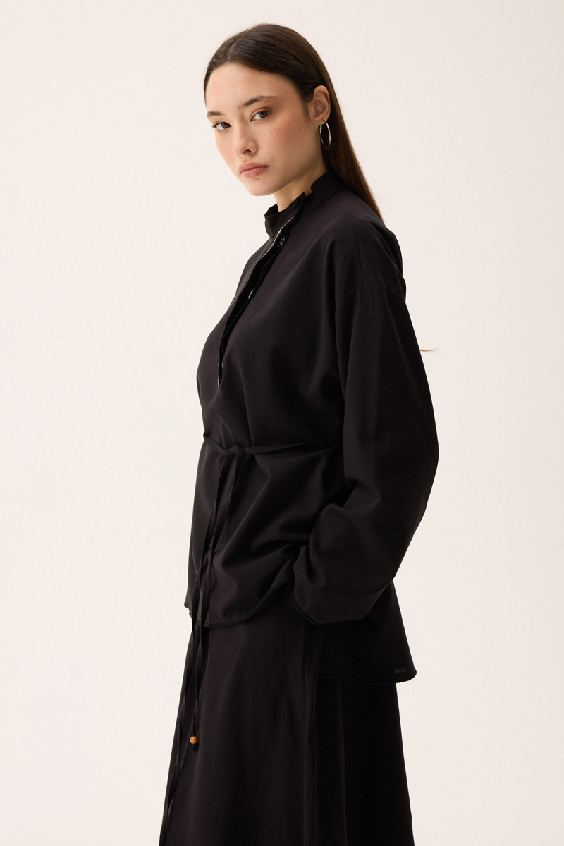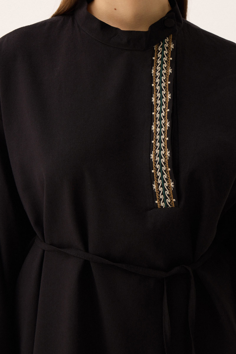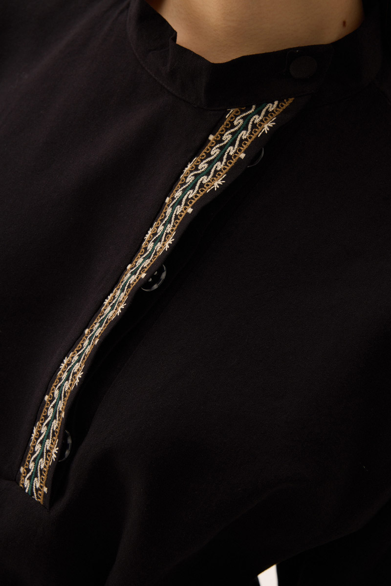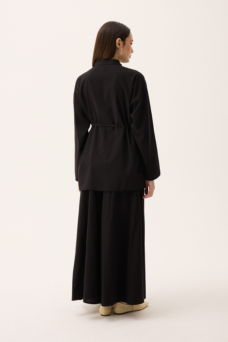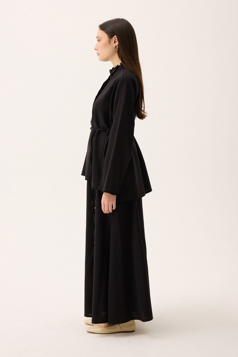 Elay Keten Takım Siyah. Hakim yakadır, patı nakış detaylıdır, üst bluz etek ucu ve kol ucu pamuk şerit detaylıdır, beli biye ile bağlamalıdır. bluz önü kısa arkası uzundur, pantolon etek beli lastiklidir, yandan ceplidir, bol kalıptır. Günlük kullanım ve özel günlerinizde tercih edebilirsiniz.