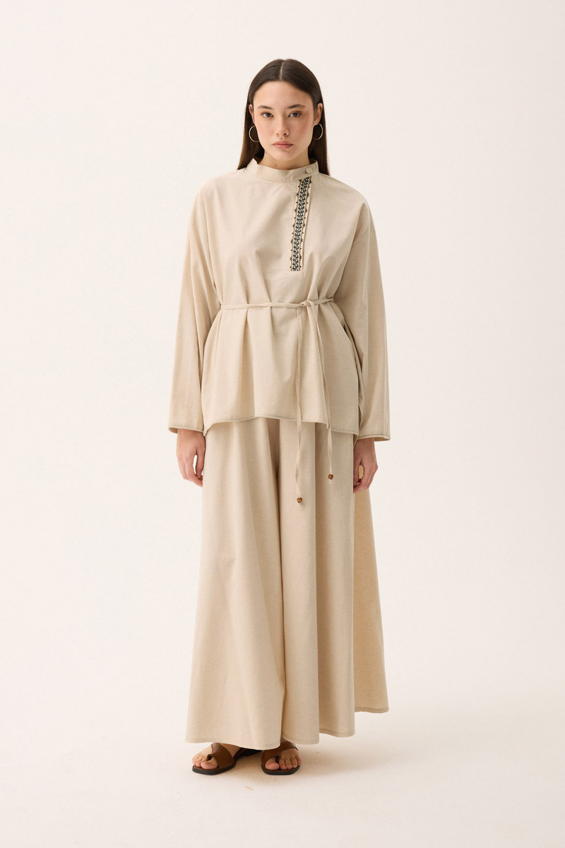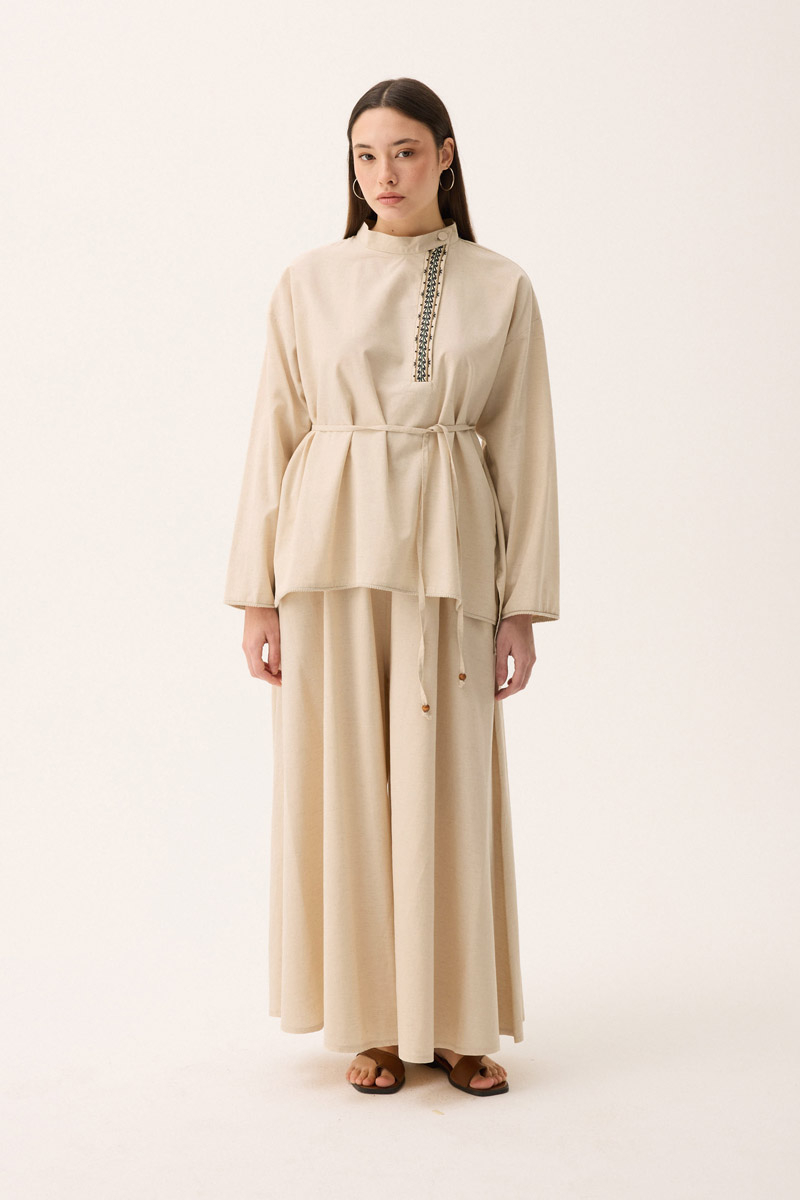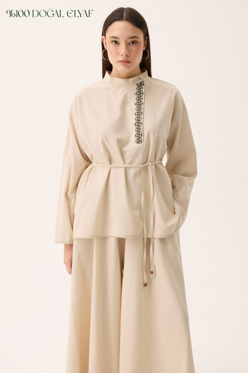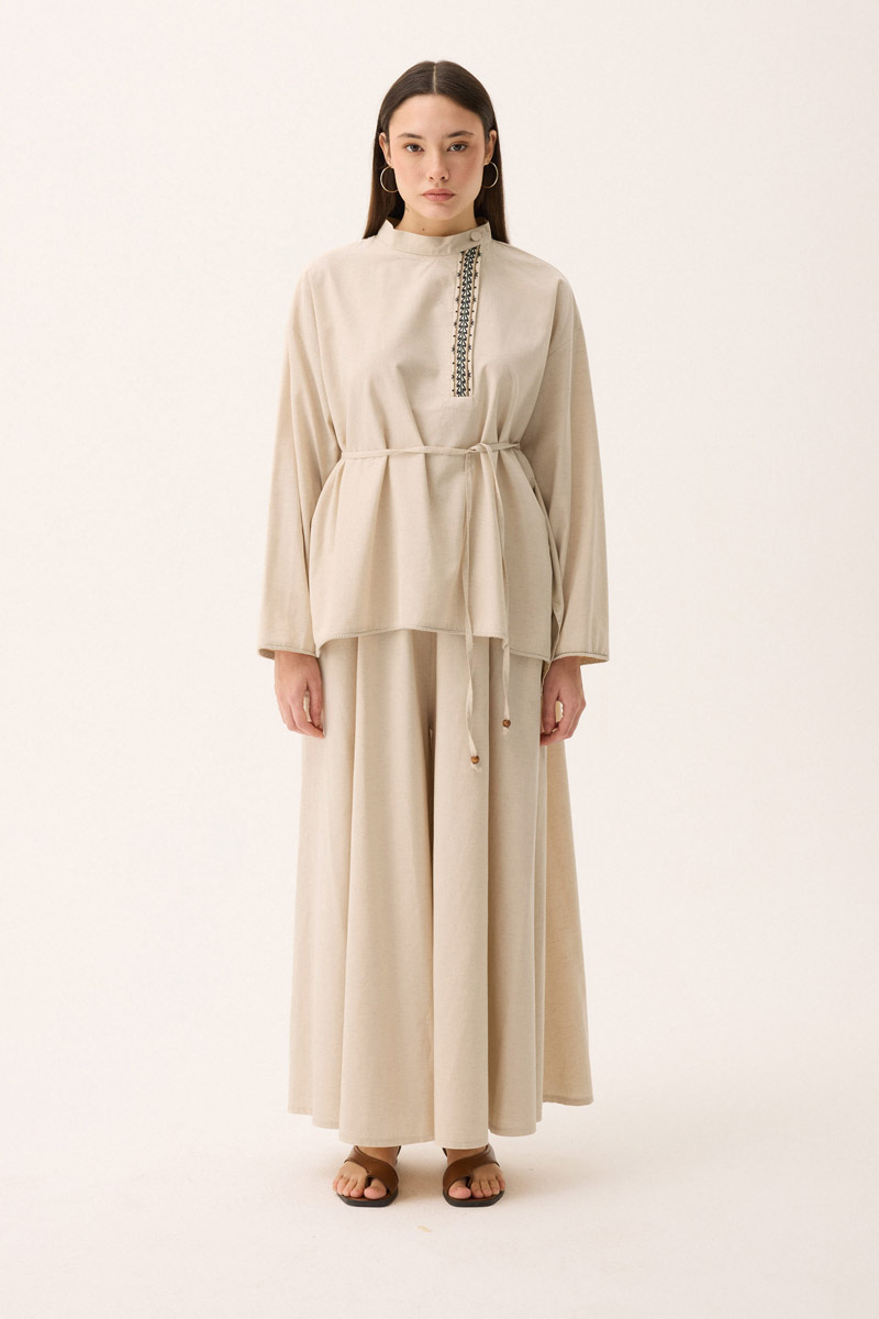 Elay Keten Takım Taş. Hakim yakadır, patı nakış detaylıdır, üst bluz etek ucu ve kol ucu pamuk şerit detaylıdır, beli biye ile bağlamalıdır. bluz önü kısa arkası uzundur, pantolon etek beli lastiklidir, yandan ceplidir, bol kalıptır. Günlük kullanım ve özel günlerinizde tercih edebilirsiniz.