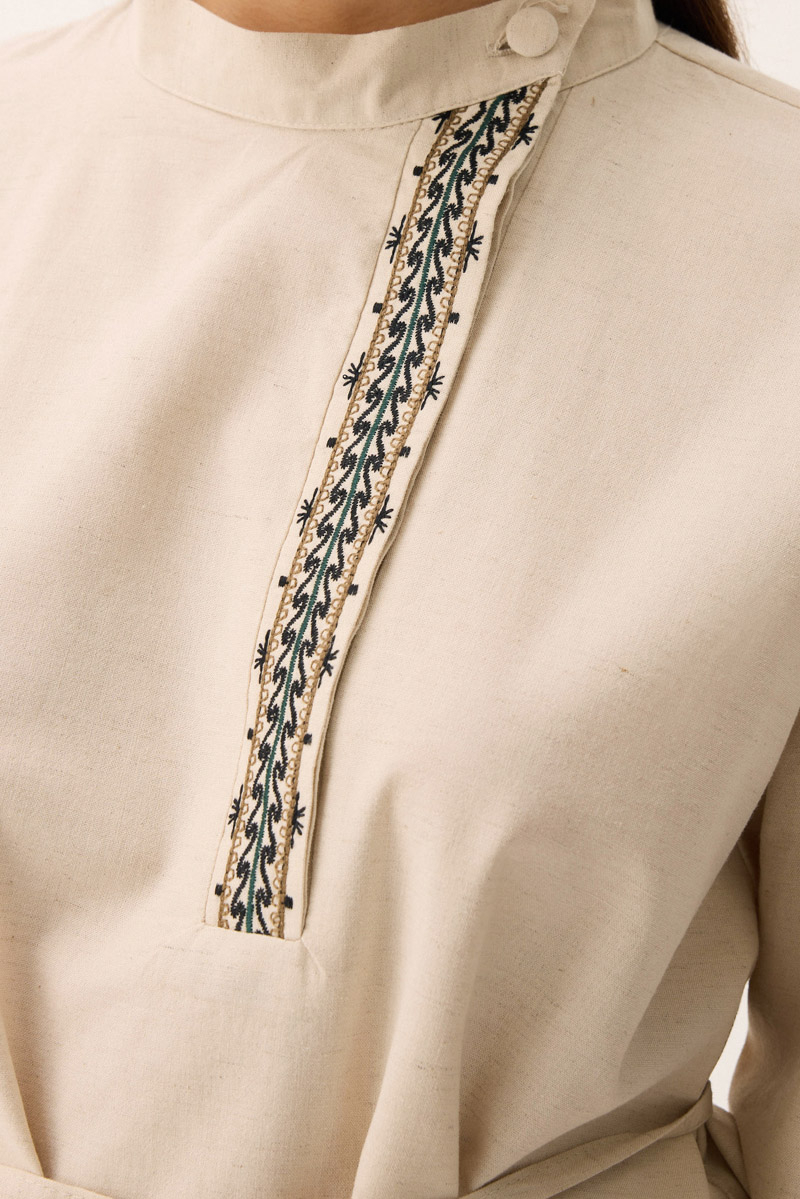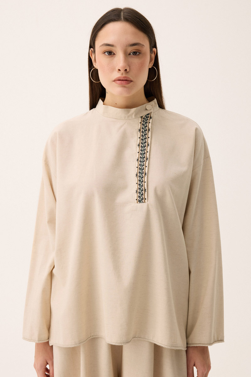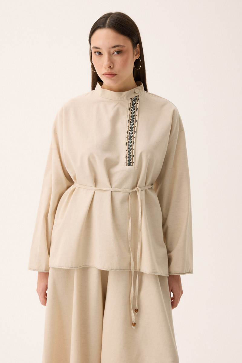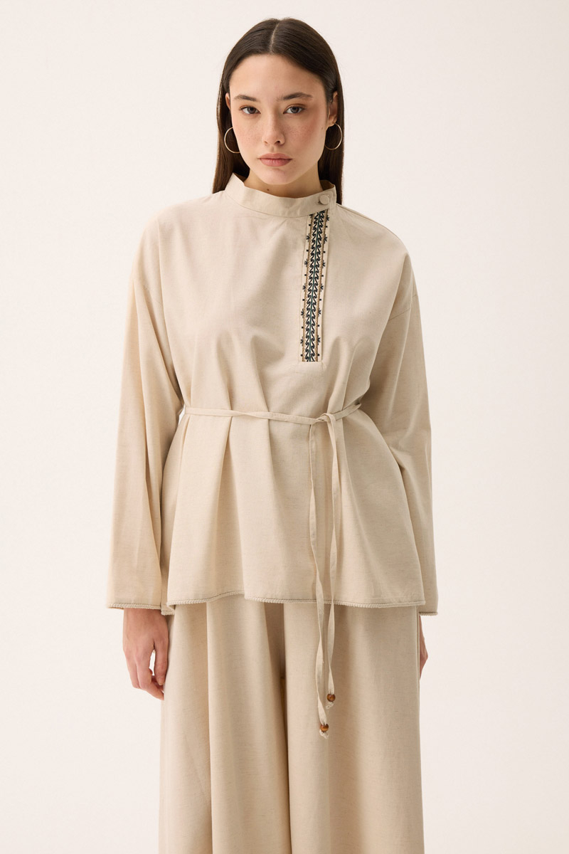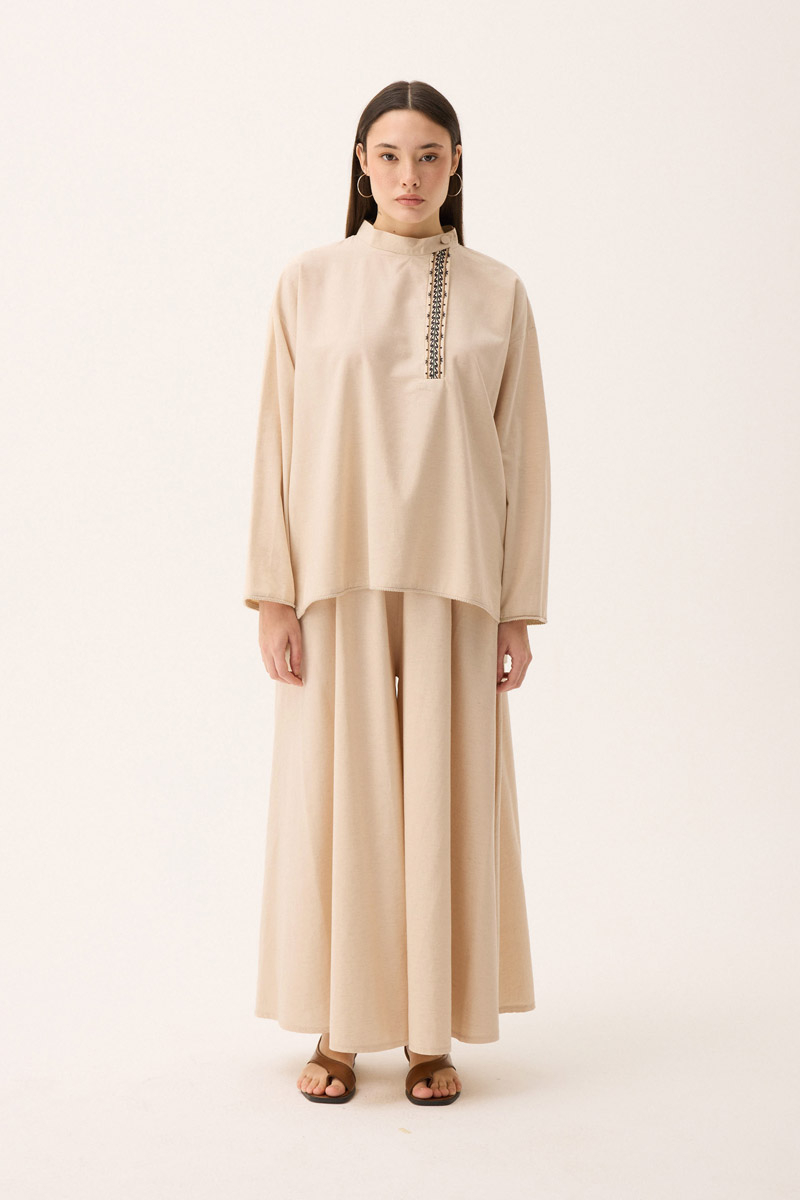 Elay Keten Takım Taş. Hakim yakadır, patı nakış detaylıdır, üst bluz etek ucu ve kol ucu pamuk şerit detaylıdır, beli biye ile bağlamalıdır. bluz önü kısa arkası uzundur, pantolon etek beli lastiklidir, yandan ceplidir, bol kalıptır. Günlük kullanım ve özel günlerinizde tercih edebilirsiniz.