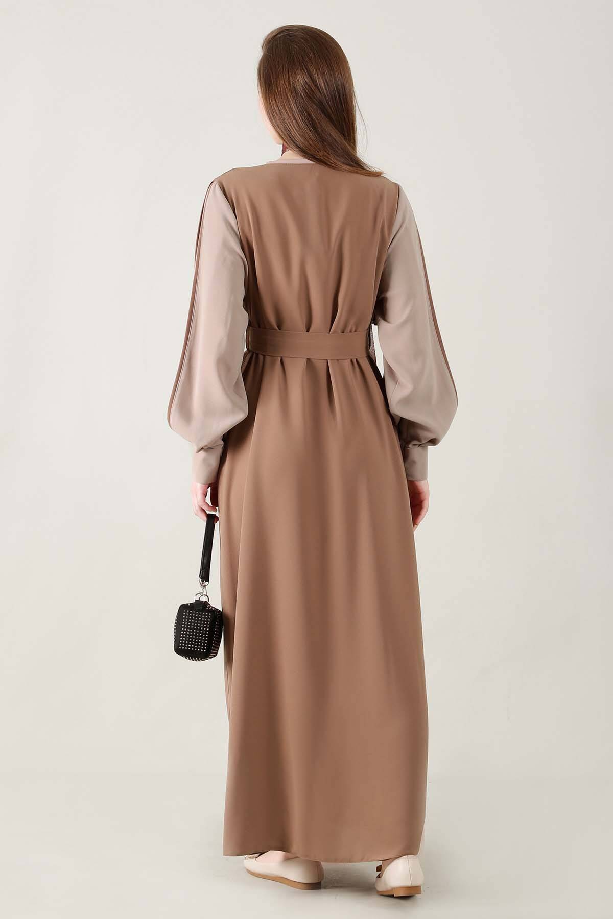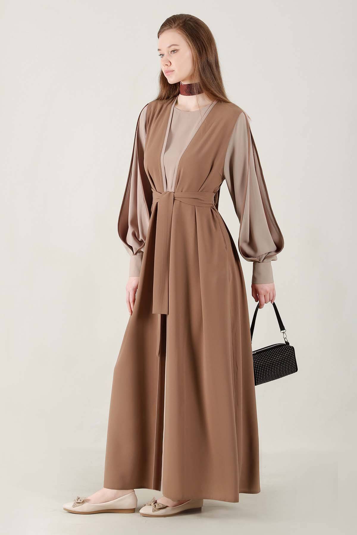Kolları Biyeli Abaya Takım Sütlü Kahve