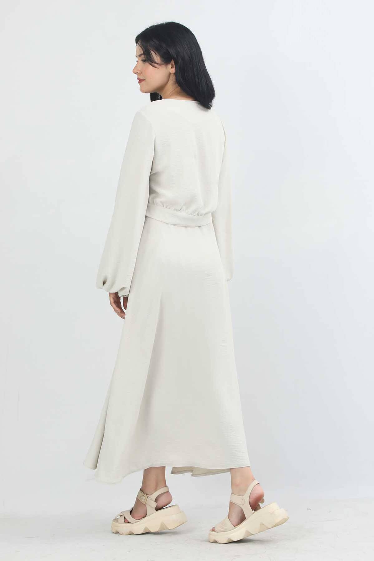 Bluz ve etekten oluşan takımdır. Bluz önden kullanılabilir düğmelidir ve bisiklet yakalıdır. Etek ise hafif kloş detaylıdır. Takım astarsızdır ve şeffaf bir kumaş olmadığı için iç göstermez.