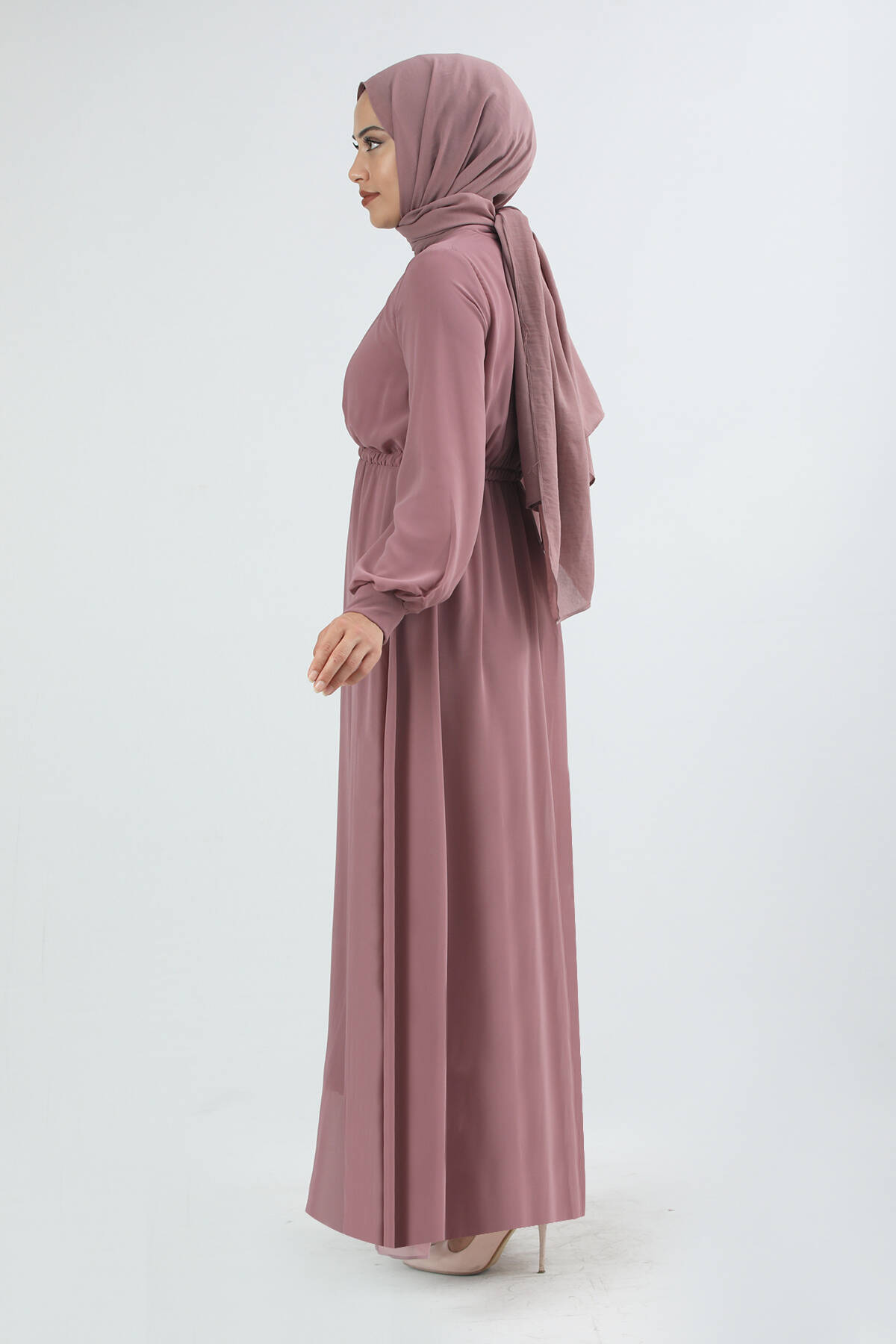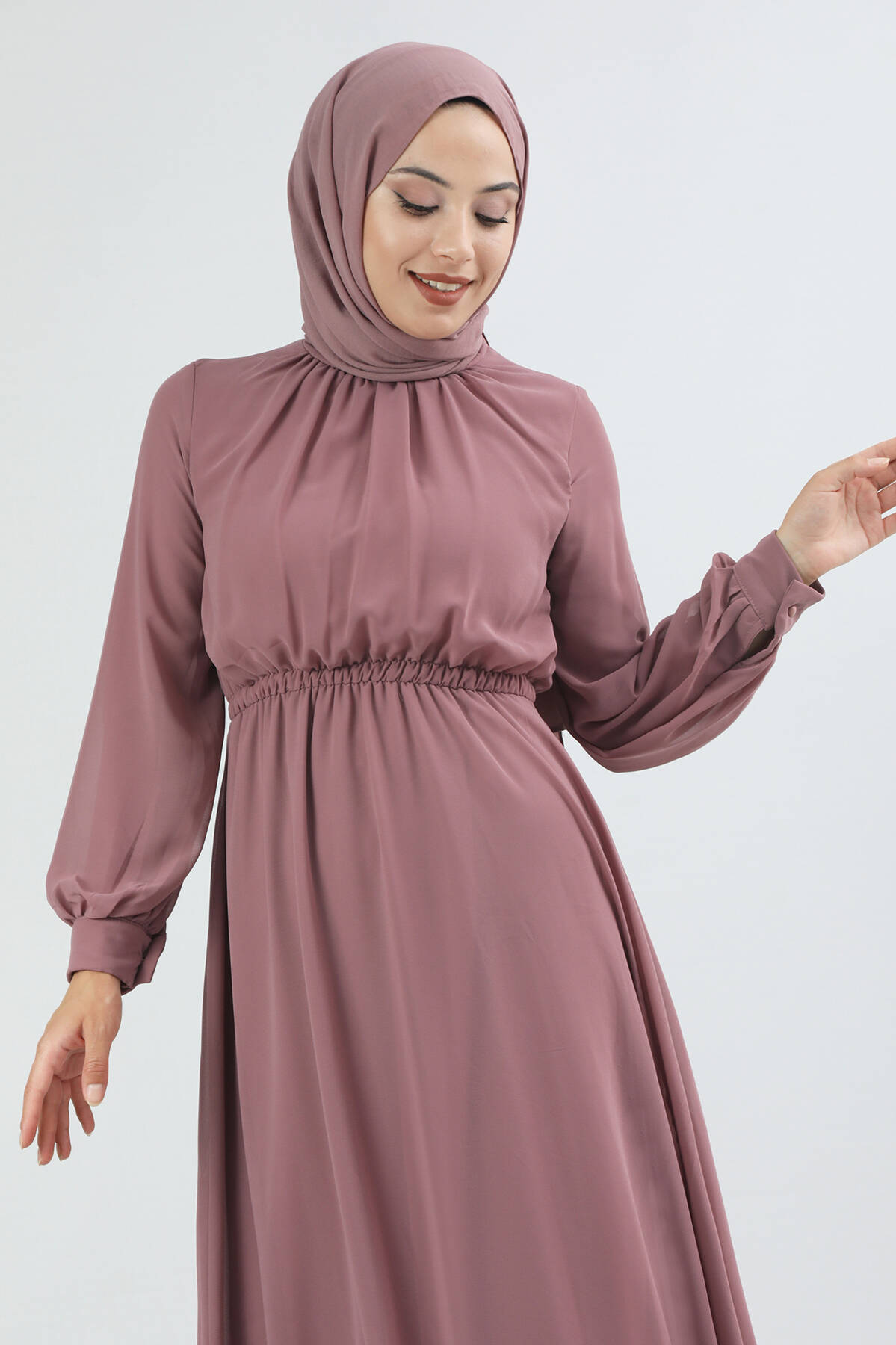 Tam kalıp, yakası büzgülü, belden lastikli, astarlı.