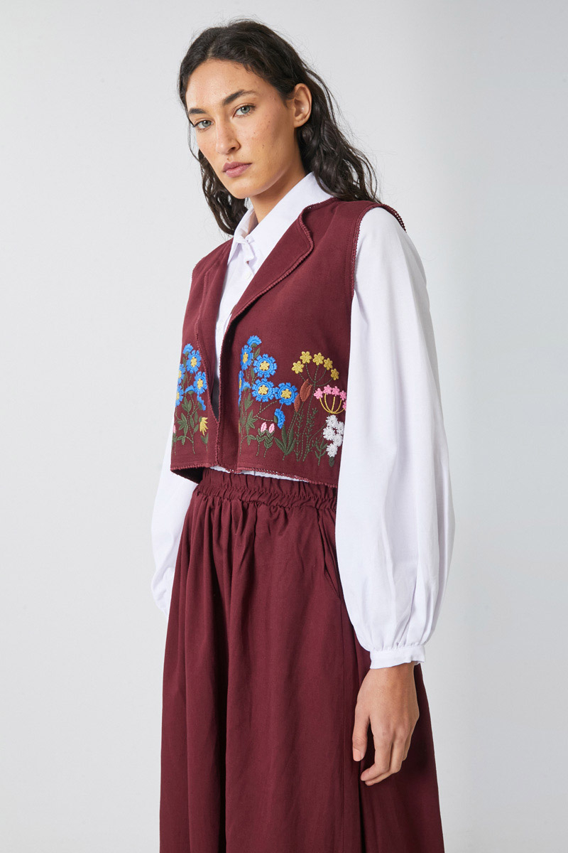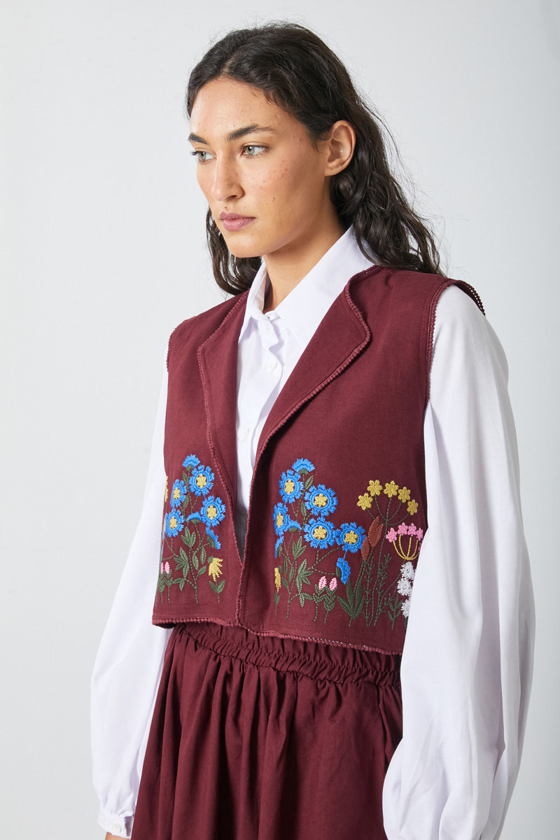 This charming two-piece set includes an unlined, pocketless vest adorned with delicate floral embroidery on the front.