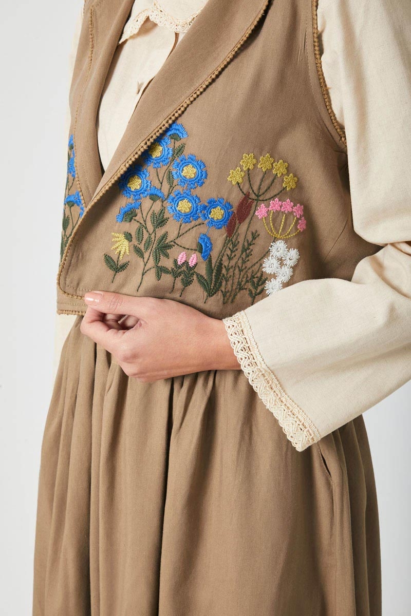 This charming two-piece set includes an unlined, pocketless vest adorned with delicate floral embroidery on the front.