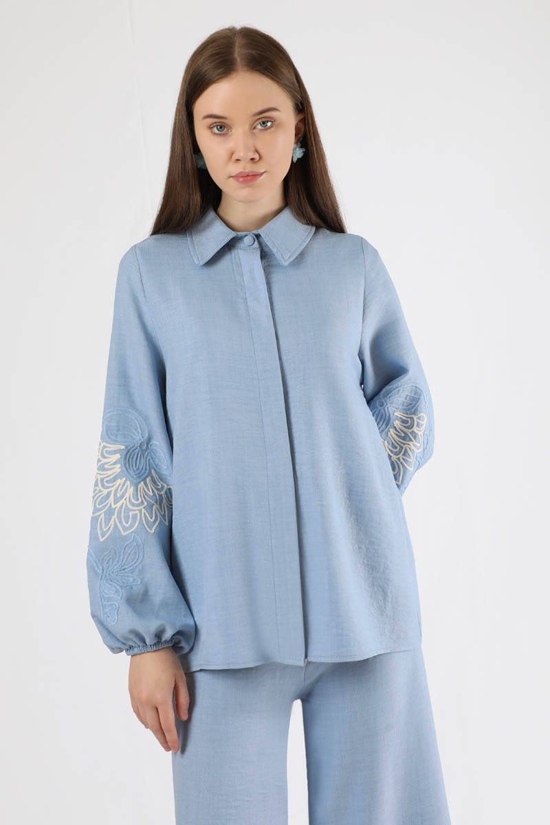 Embroidery Detailed Linen Suit Baby Blue. The sleeve is embroidered detail. The cuff is shirred. Hidden button. Shirt collar. The waist of the trousers is elastic. The trousers are loose. You can choose it for your daily use and special occasions.