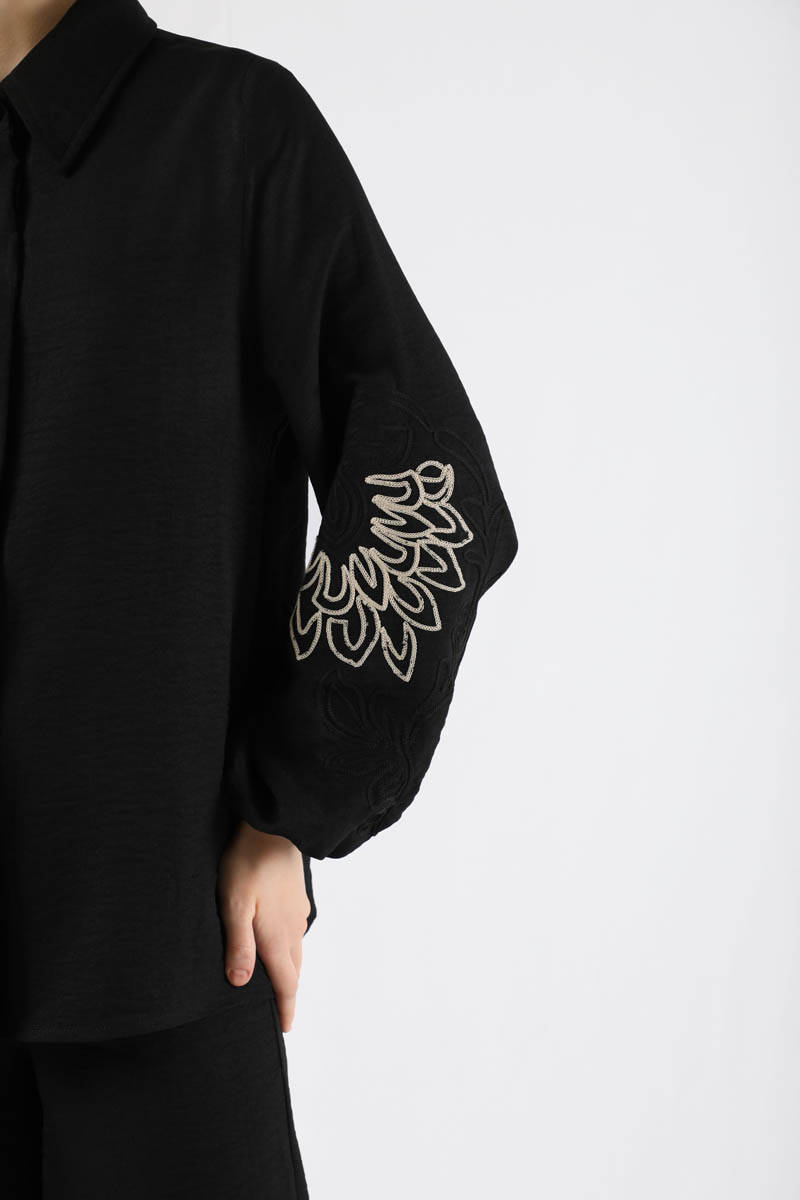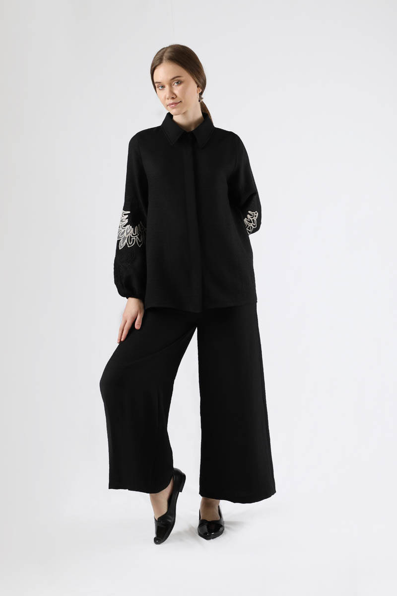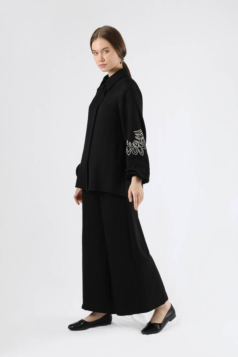 Embroidery Detailed Linen Suit Black. The sleeve is embroidered detail. The cuff is shirred. Hidden button. Shirt collar. The waist of the trousers is elastic. The trousers are loose. You can choose it for your daily use and special occasions.