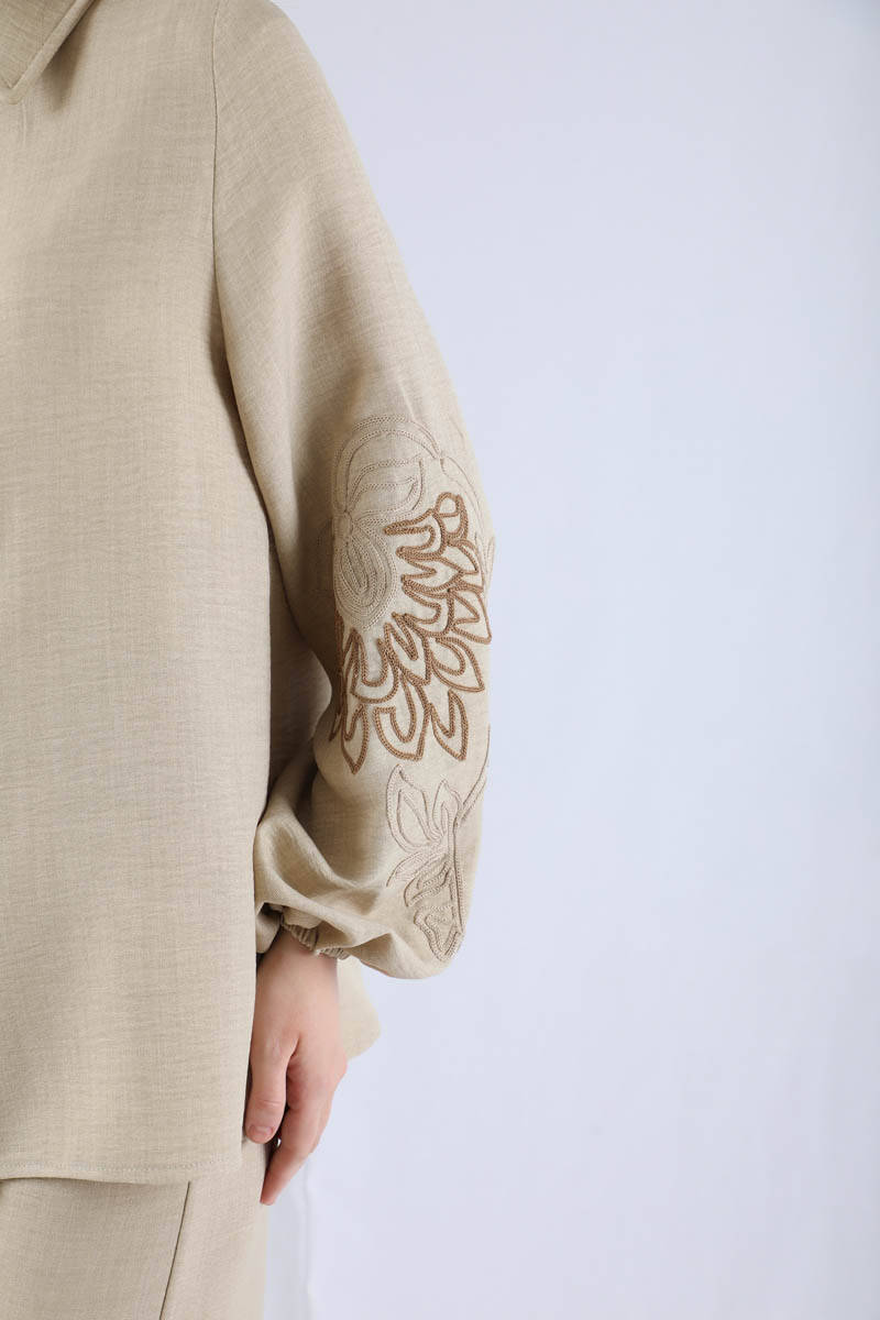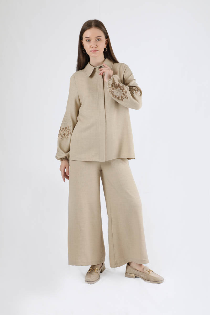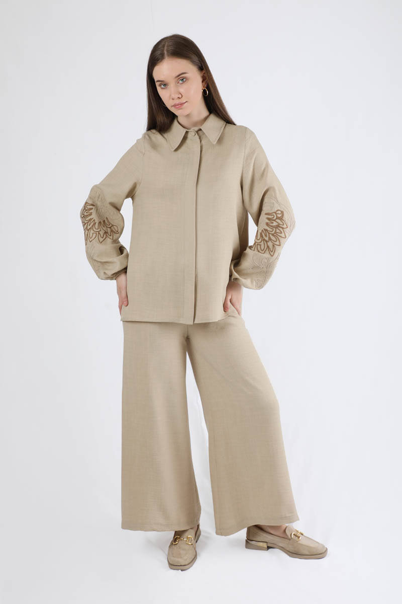 Embroidery Detailed Linen Suit Stone. The sleeve is embroidered detail. The cuff is shirred. Hidden button. Shirt collar. The waist of the trousers is elastic. The trousers are loose. You can choose it for your daily use and special occasions.