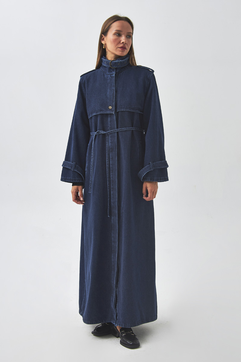 With its timeless design, this denim trenchcoat brings a modern touch to your everyday style. The durable denim fabric combined with the classic trench silhouette offers both elegance and comfort in urban settings. Featuring a high collar, epaulette details, and a waist belt, it provides versatile styling options — making it a strong contender for a staple piece in your wardrobe.