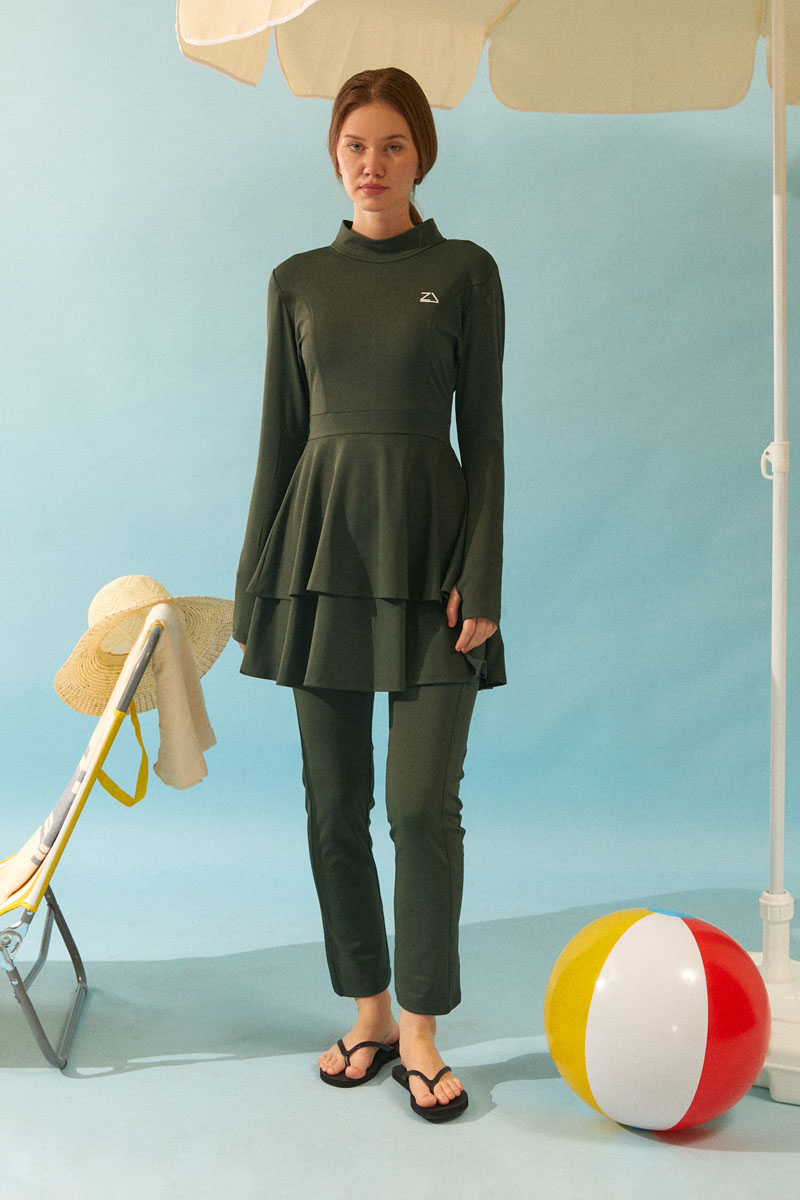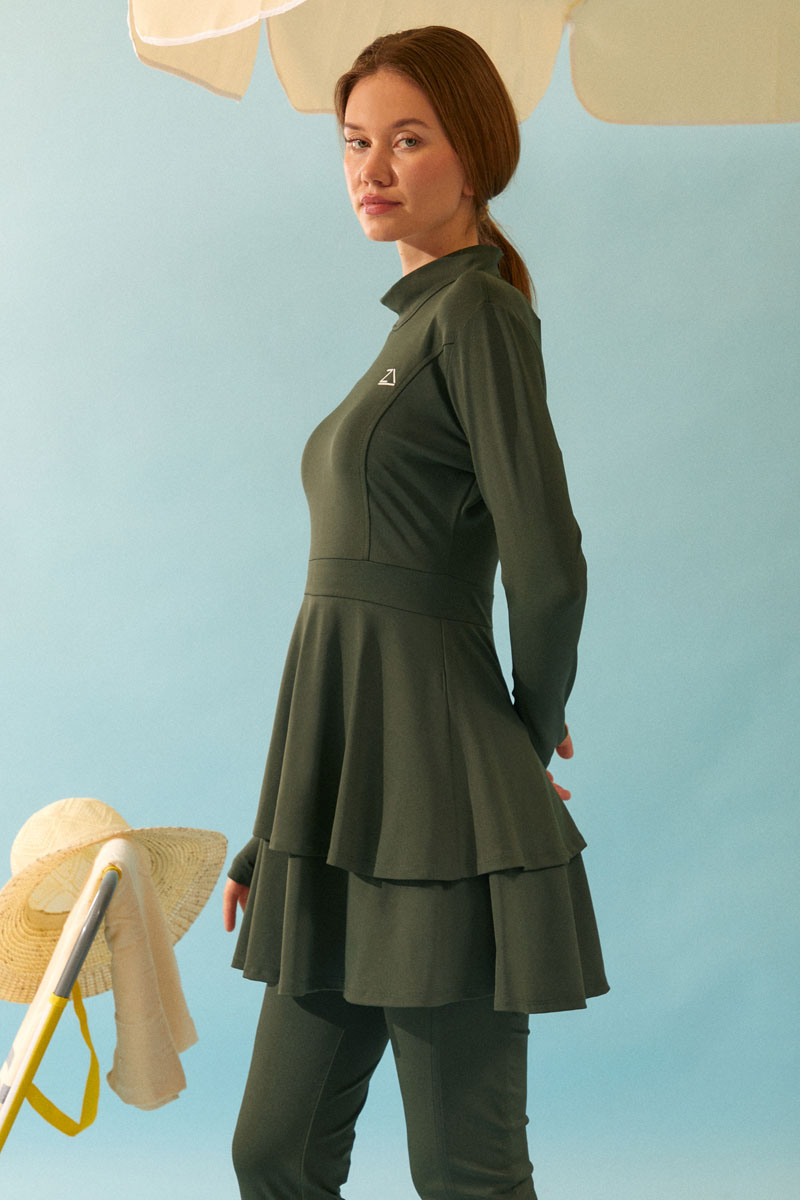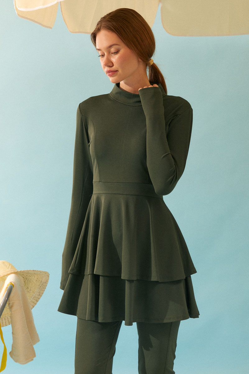 Eteği Katlı Mayo Takımı Haki, Uzun kollu ve yüksek yakalı tasarımı ile tesettüre uygun bir silüet sunar. Bel kısmından aşağıya doğru inen katlı (fırfırlı) yapısı, hem modern bir görünüm kazandırır hem de hareket kolaylığı sağlar.. Bu şık ve bütünlüklü takım, hem plajda hem de havuz başında mütevazı ve zarif bir görünüm arayan kadınlar için ideal bir seçimdir.