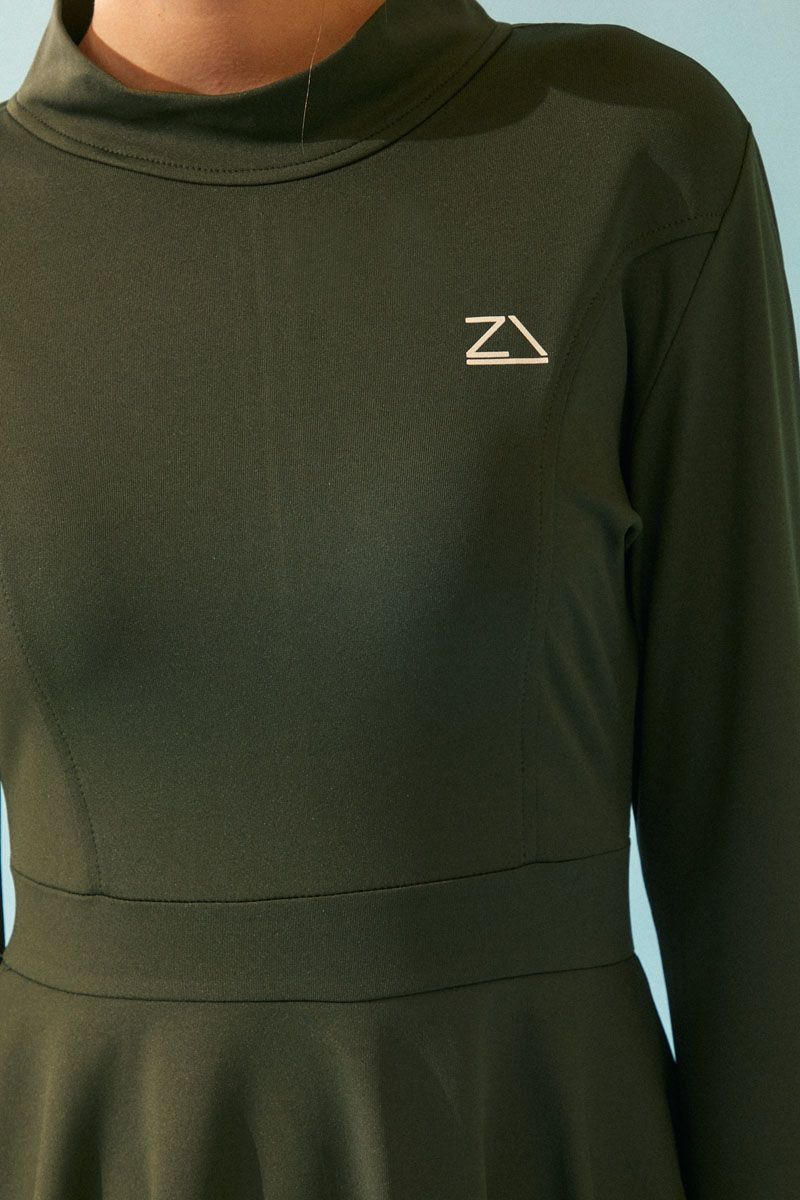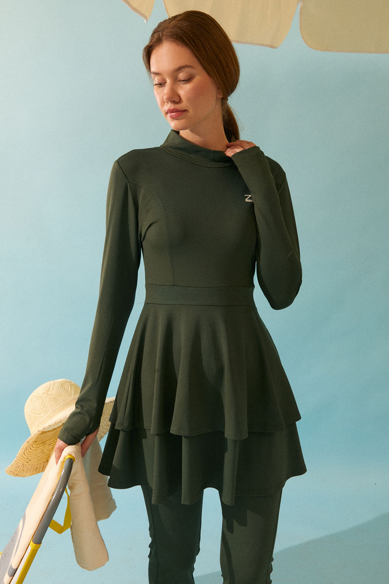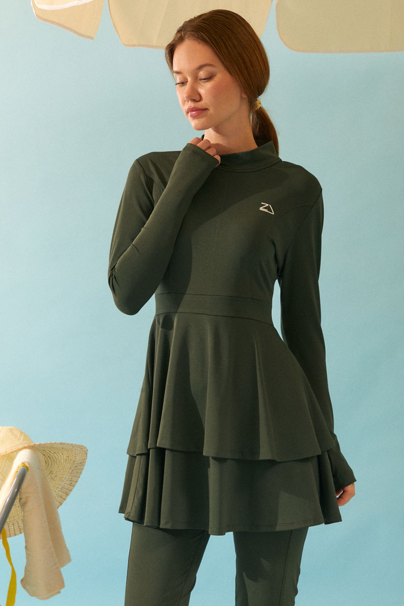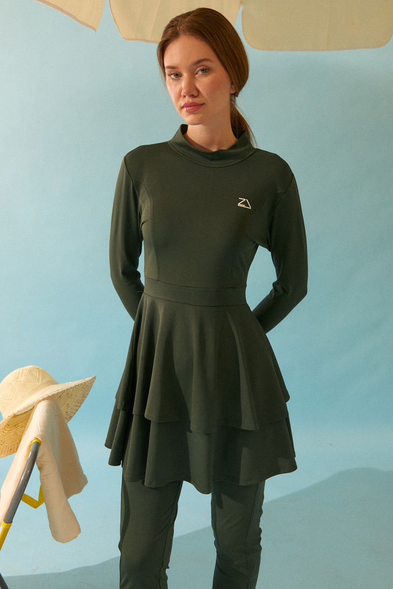 Eteği Katlı Mayo Takımı Haki, Uzun kollu ve yüksek yakalı tasarımı ile tesettüre uygun bir silüet sunar. Bel kısmından aşağıya doğru inen katlı (fırfırlı) yapısı, hem modern bir görünüm kazandırır hem de hareket kolaylığı sağlar.. Bu şık ve bütünlüklü takım, hem plajda hem de havuz başında mütevazı ve zarif bir görünüm arayan kadınlar için ideal bir seçimdir.