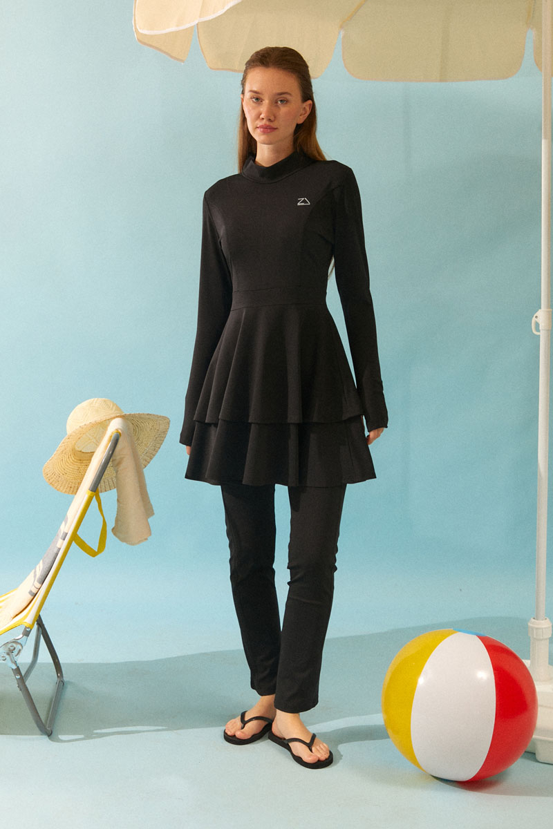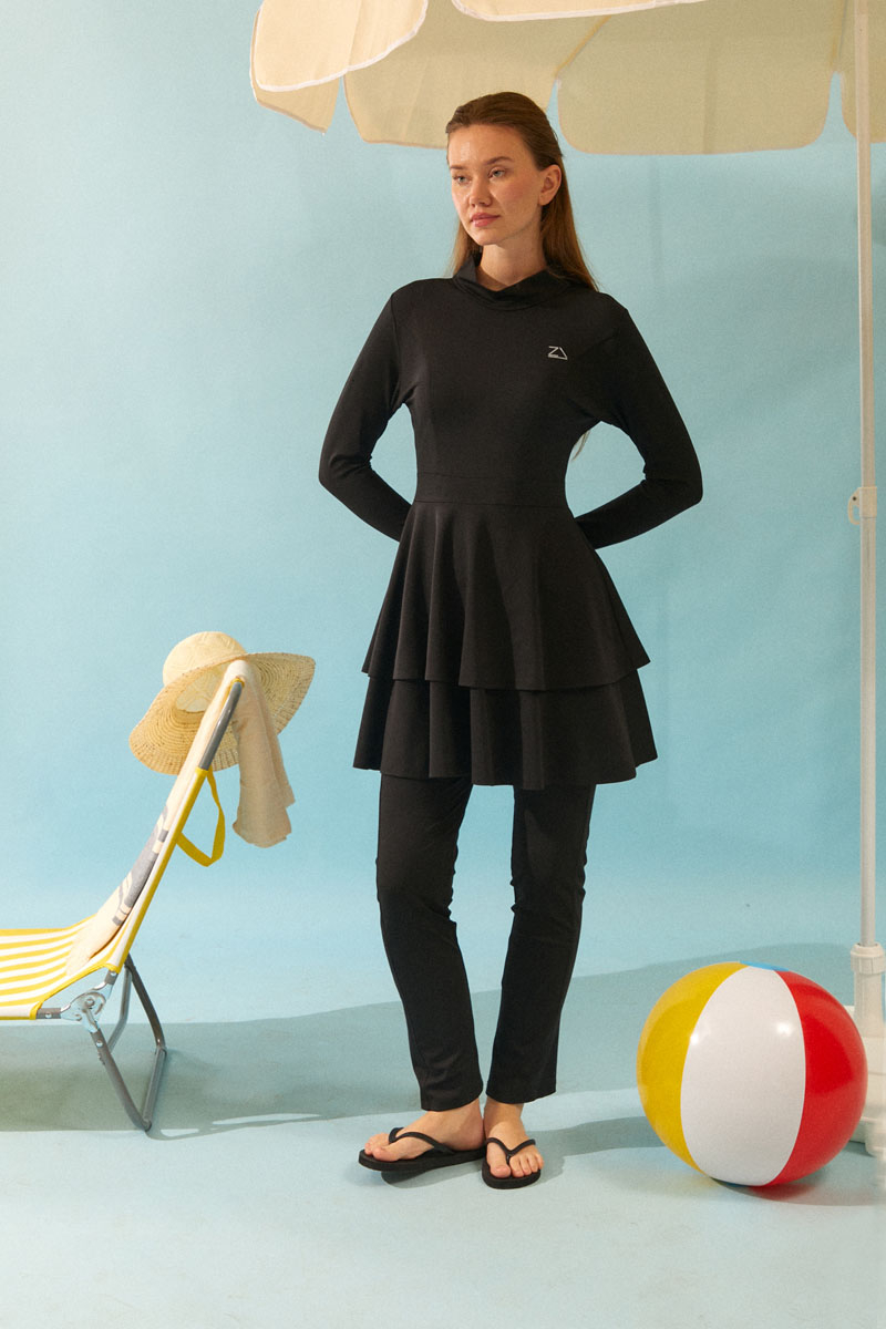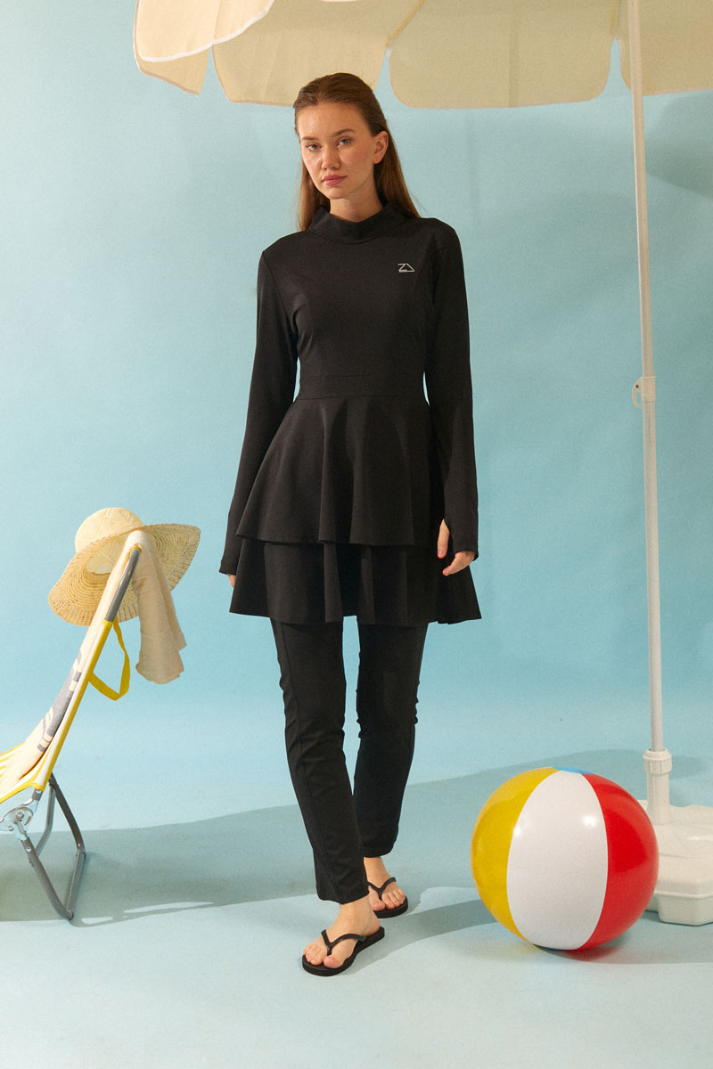 Eteği Katlı Mayo Takımı Siyah, Uzun kollu ve yüksek yakalı tasarımı ile tesettüre uygun bir silüet sunar. Bel kısmından aşağıya doğru inen katlı (fırfırlı) yapısı, hem modern bir görünüm kazandırır hem de hareket kolaylığı sağlar.. Bu şık ve bütünlüklü takım, hem plajda hem de havuz başında mütevazı ve zarif bir görünüm arayan kadınlar için ideal bir seçimdir.