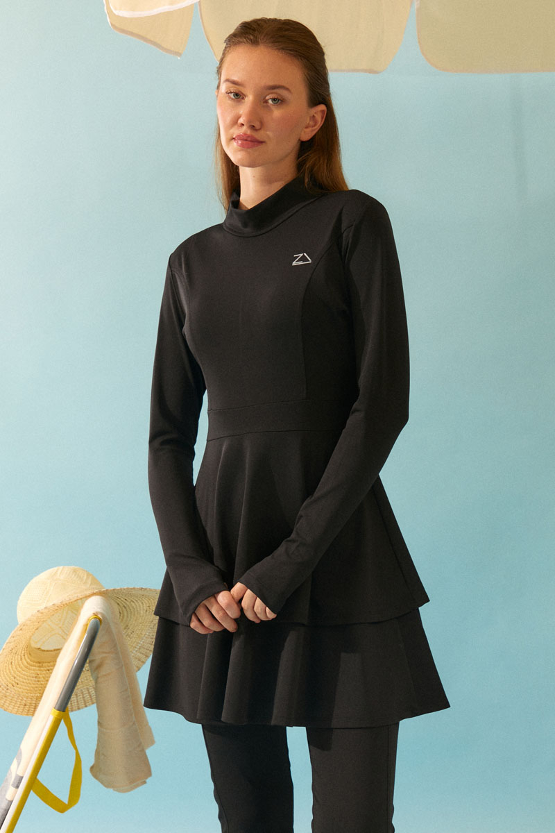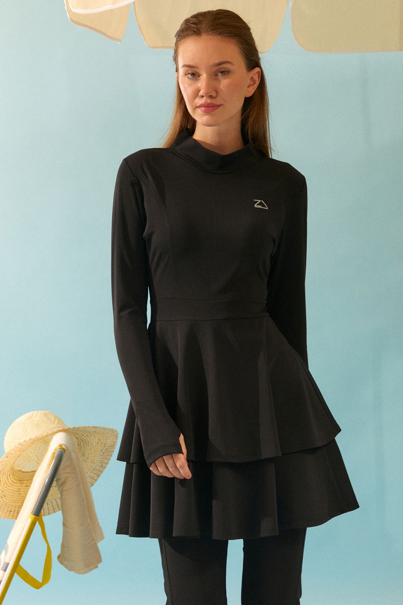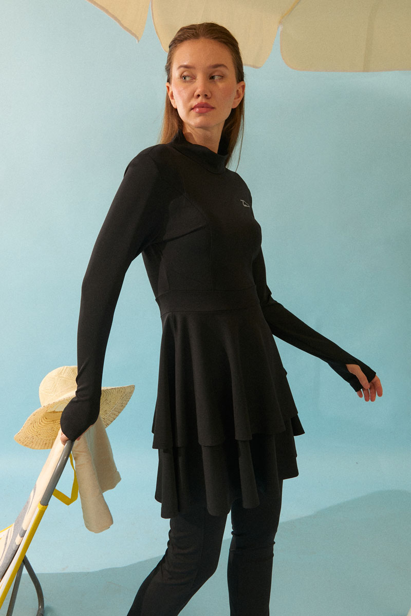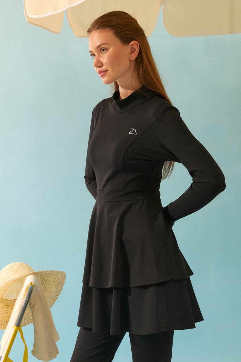 Eteği Katlı Mayo Takımı Siyah, Uzun kollu ve yüksek yakalı tasarımı ile tesettüre uygun bir silüet sunar. Bel kısmından aşağıya doğru inen katlı (fırfırlı) yapısı, hem modern bir görünüm kazandırır hem de hareket kolaylığı sağlar.. Bu şık ve bütünlüklü takım, hem plajda hem de havuz başında mütevazı ve zarif bir görünüm arayan kadınlar için ideal bir seçimdir.