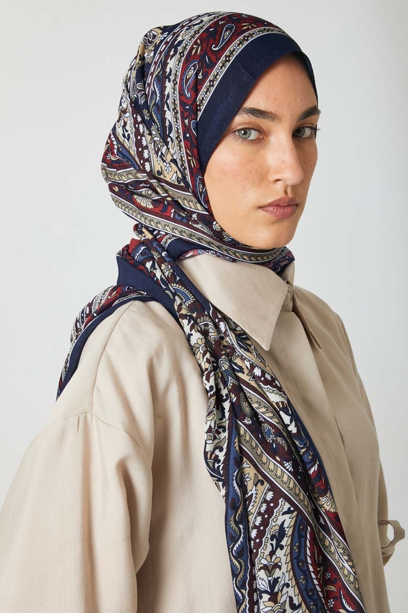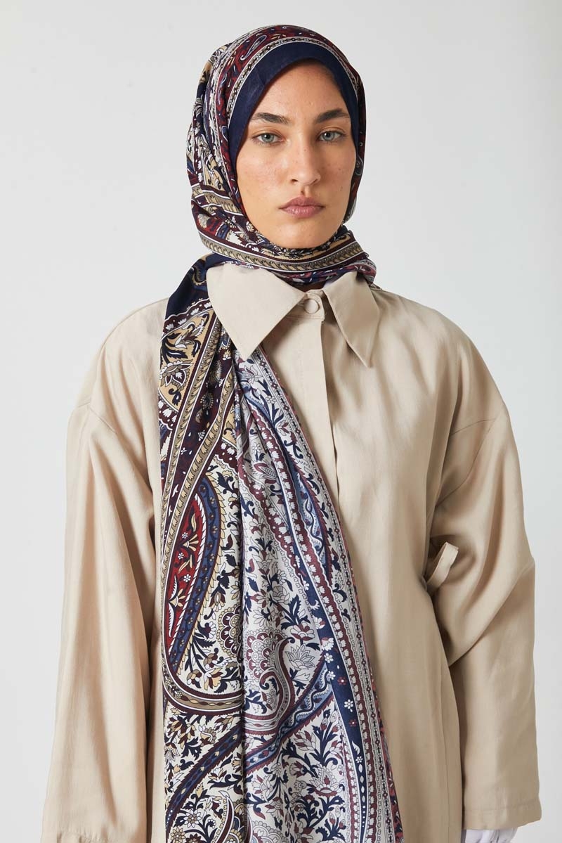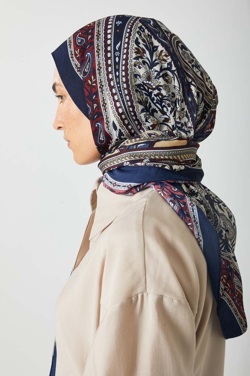 Etnik Desen Şal Lacivert. İpeksi, yüksek kaliteli polyester kumaştan imal edilmiştir, hafif ve nefes alan yapısıyla gün boyu konfor sağlar, özenle işlenmiş kenar dikişleri, uzun ömürlü kullanım sunar. Pratik oluşu ve kolay şekil alabilir. Tok duruşlu ve dökümlü yapısıyla çok tercih edilmektedir. Ağırlık yapmayan kumaş özelliği ile sık ve uzun süreli kullanıma uygundur. Dört mevsim kullanıma uygundur.