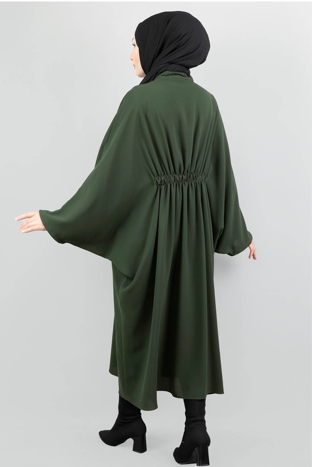 Yarasa koldur. Önden fermuarlıdır. Belden kuşağı ile bağlanabilir.