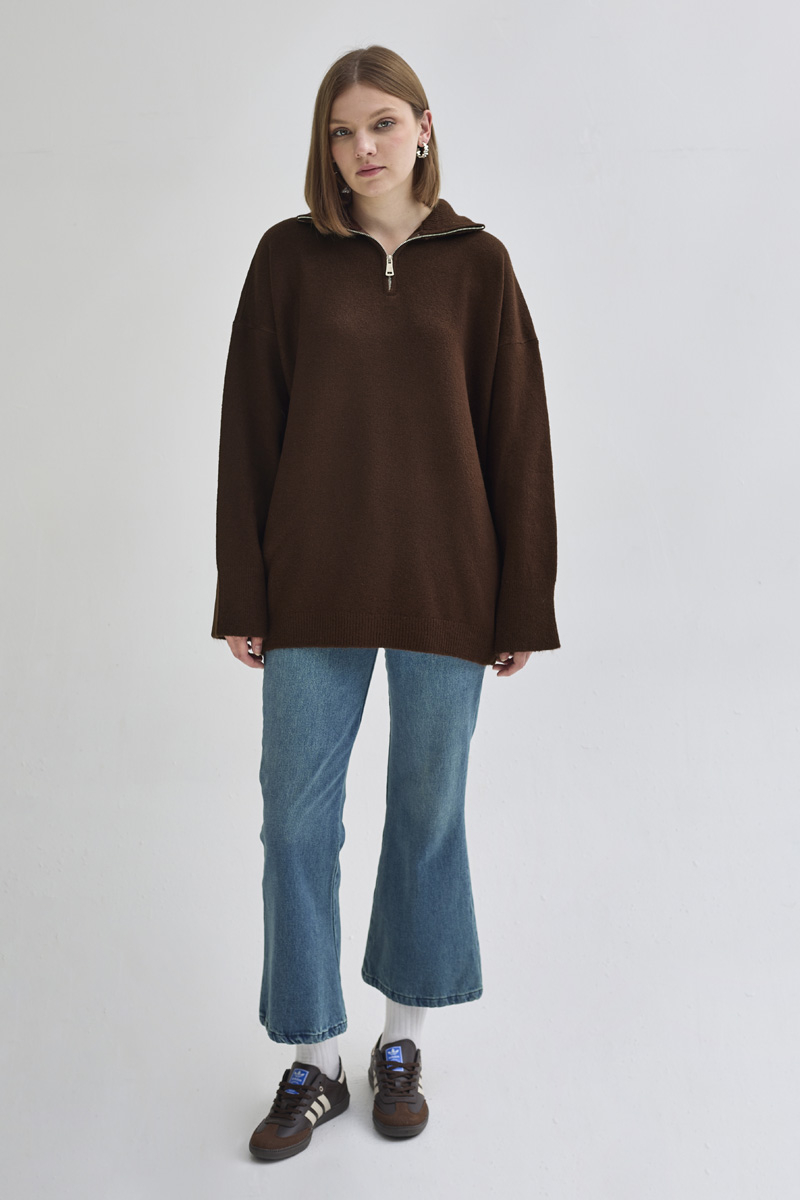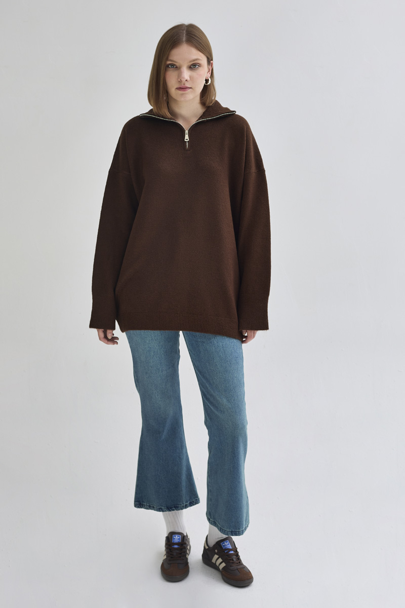 Fermuarlı Dik Yaka Kazak Kahverengi