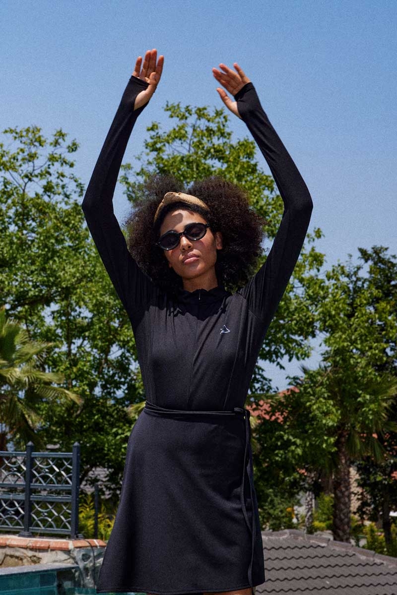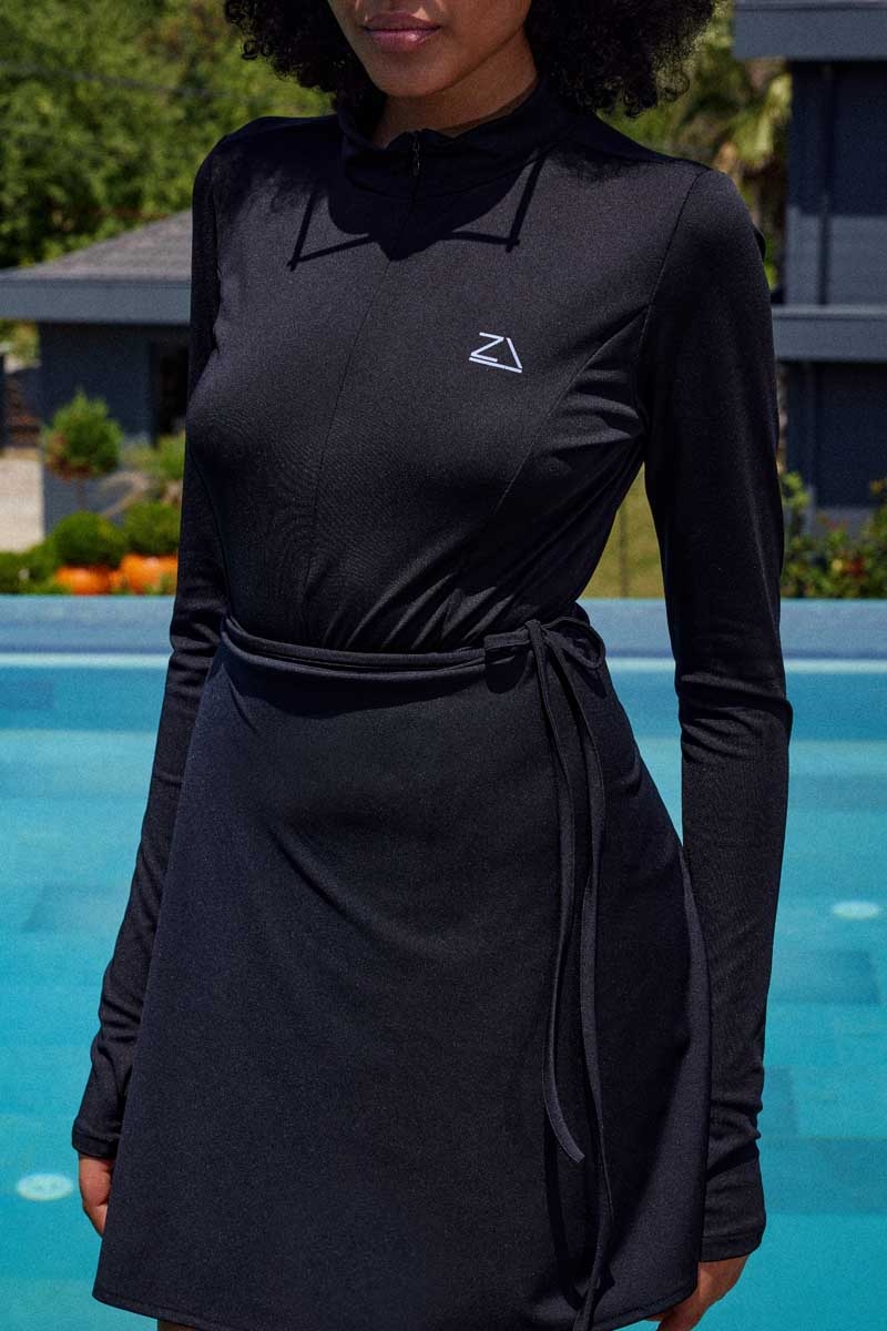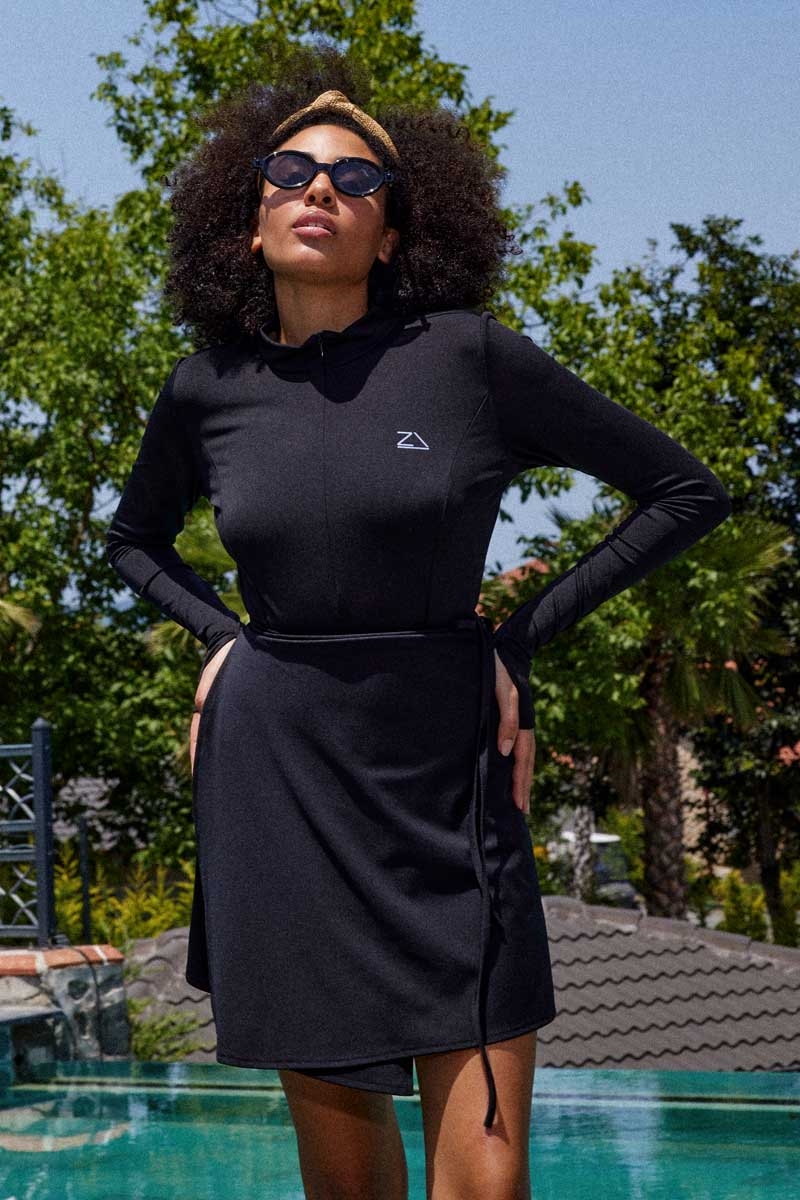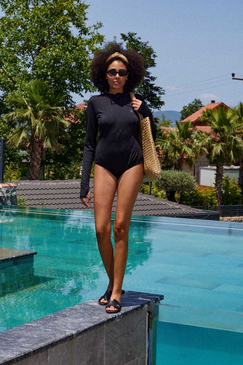 Fermuarlı Sörf Mayo Siyah. Hakim yakalıdır, önden yarım gizli fermuarlıdır, bilek kısmı parmak geçirme detaylıdır, esnek kumaştır. Uzun kollu mayo modelidir. Dar kalıptır.(Yandan bağlamalı etek dahil değildir)