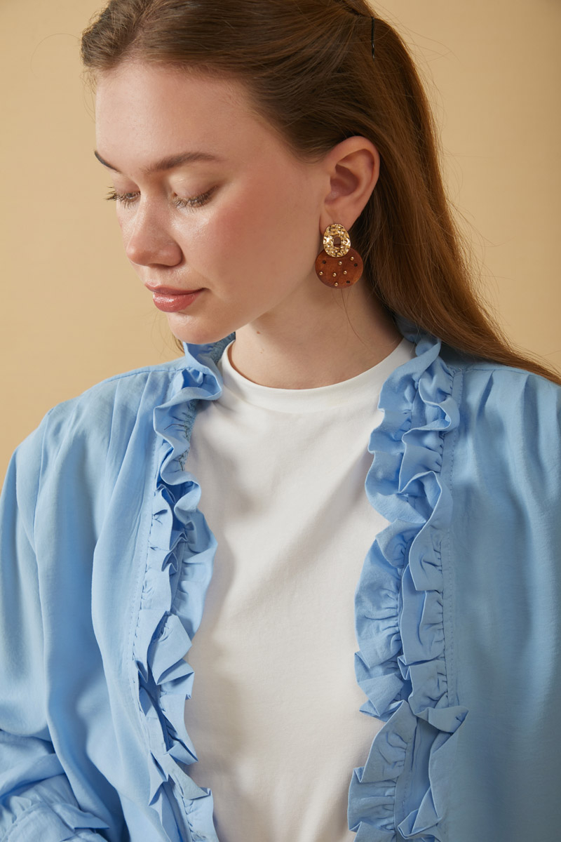 Fırfır Detaylı Bluz Bebe Mavisi. Ön kısmındaki dikkat çekici fırfır detayları ve V yaka kesimiyle modern bir şıklık sunan bu bluz, hafif ve dökümlü kumaşıyla gün boyu konfor sağlar. Hem özel hem de günlük kombinleriniz için ideal.