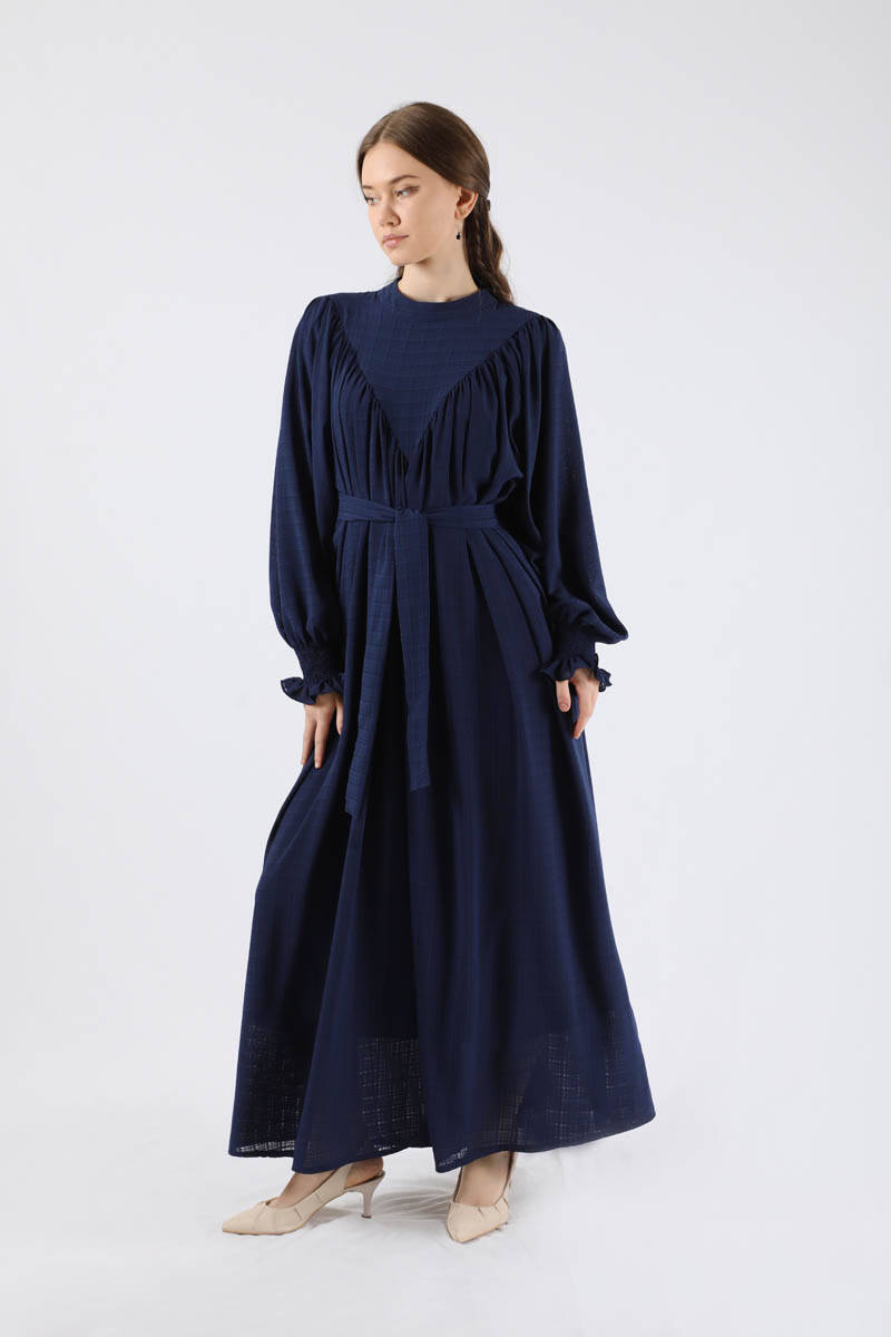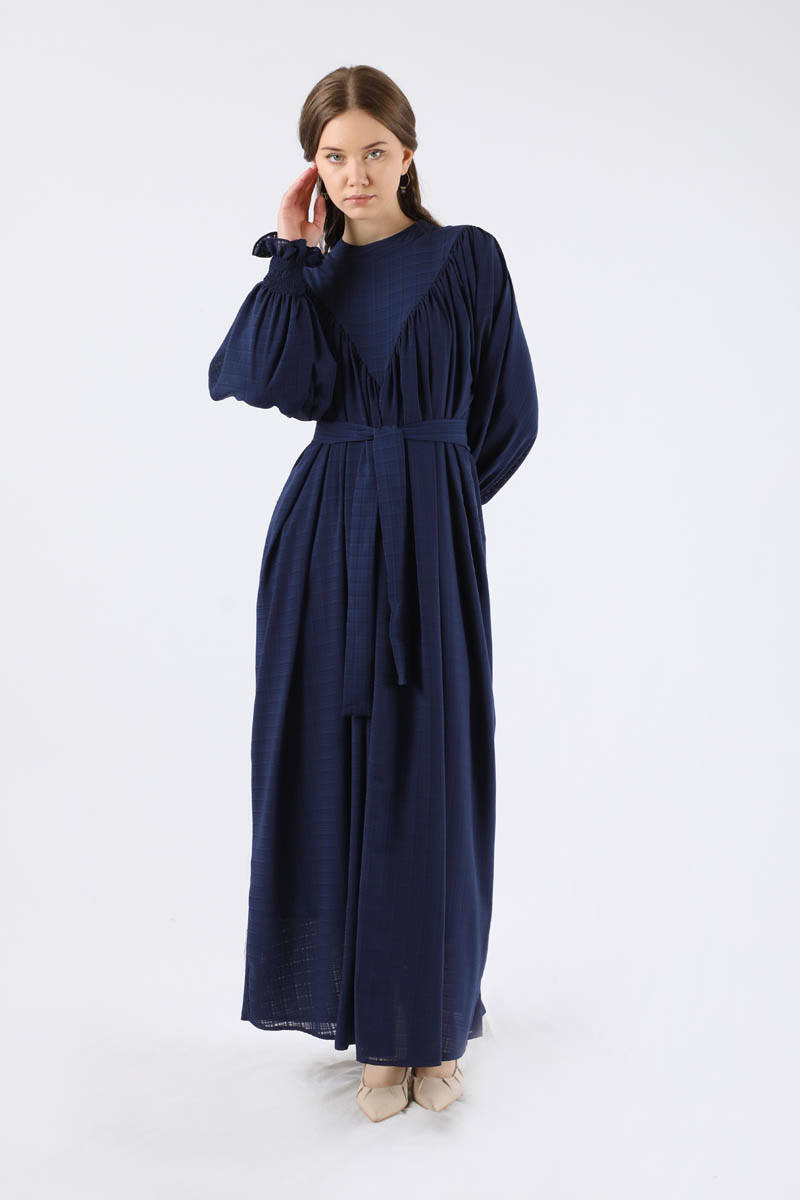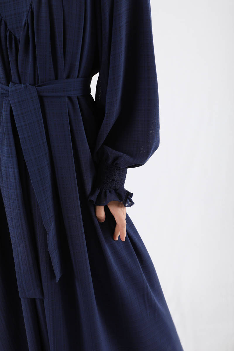 Büzgülü Elbise Lacivert. Manşeti fırfır detaylıdır, Gipelidir. Ön robası büzgülüdür. Kuşaklıdır. Hakim Yakalıdır. Arkadan fermuarlıdır. Astarlıdır.