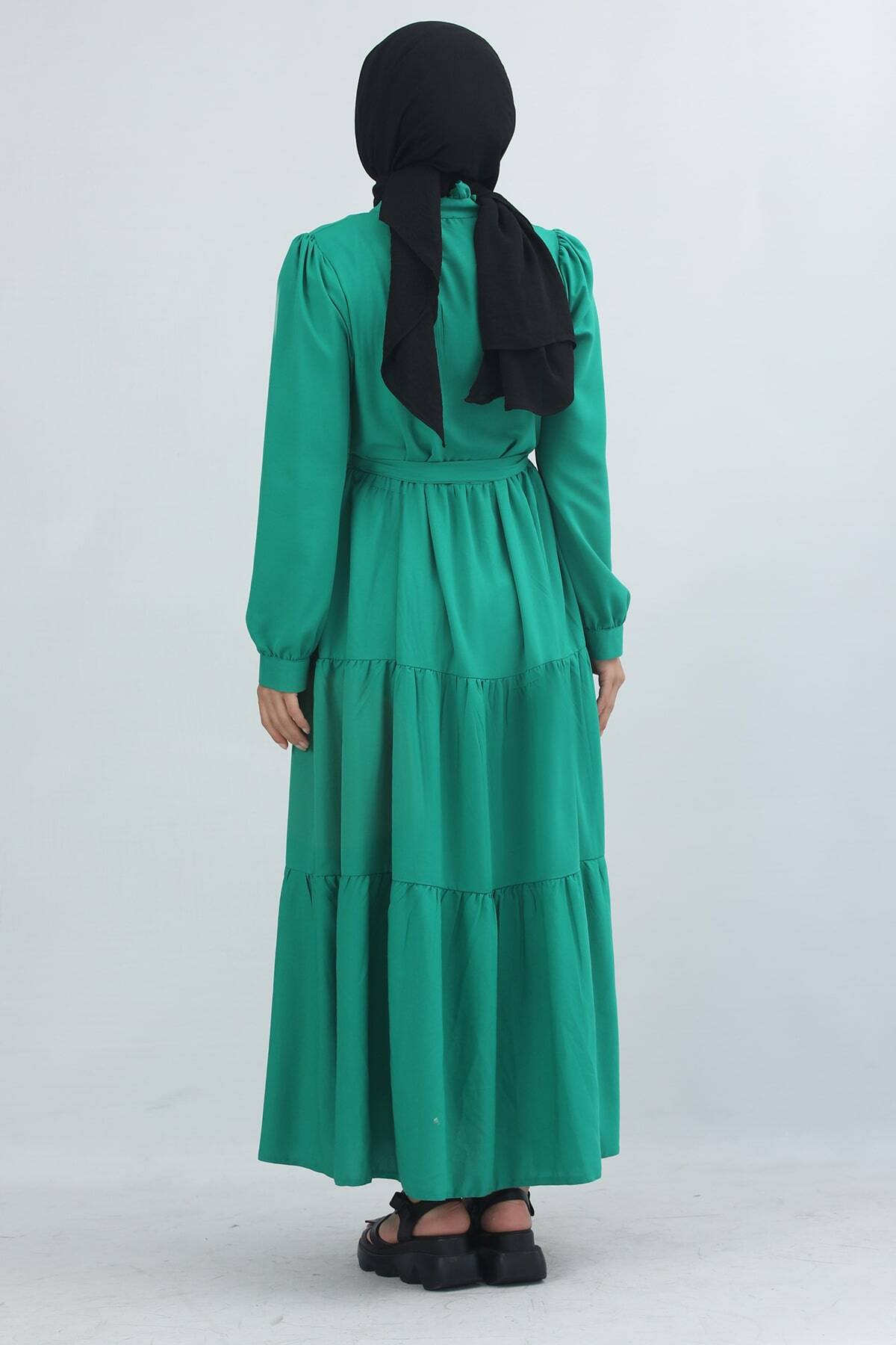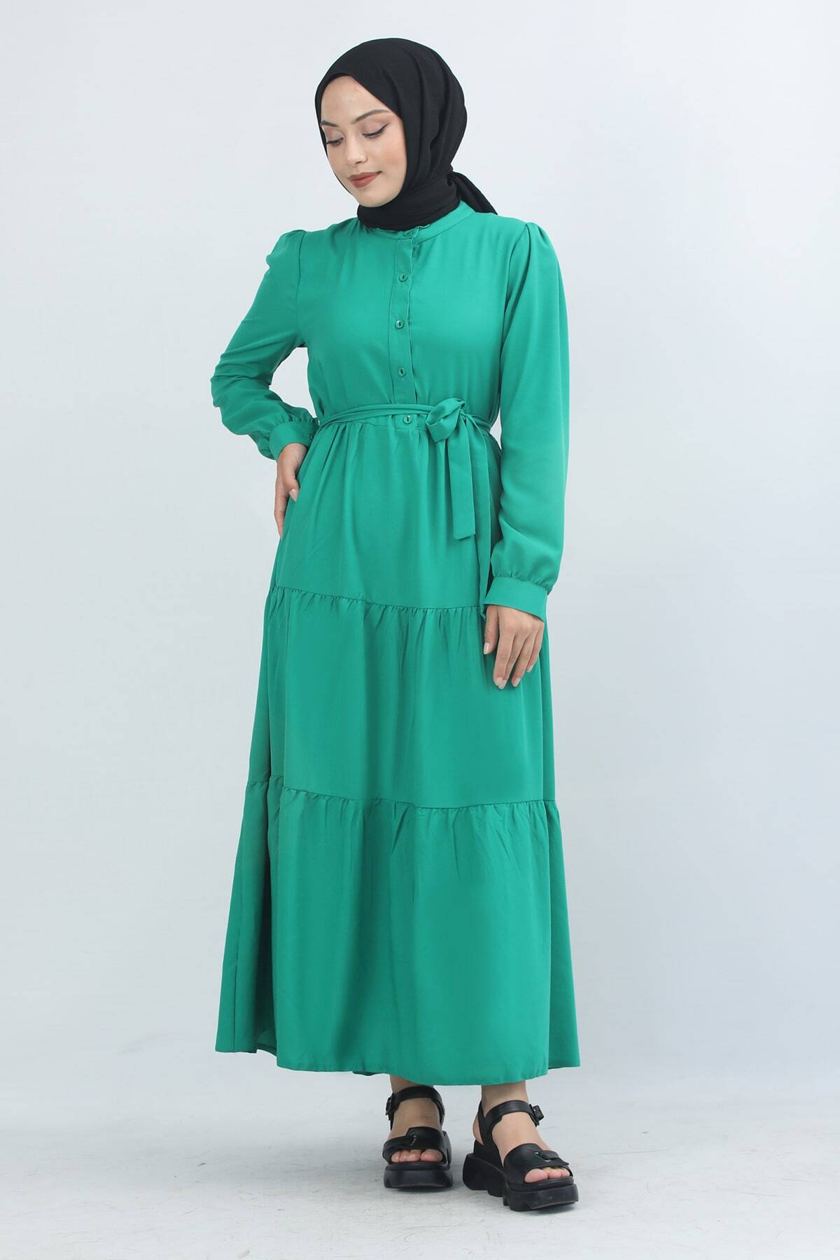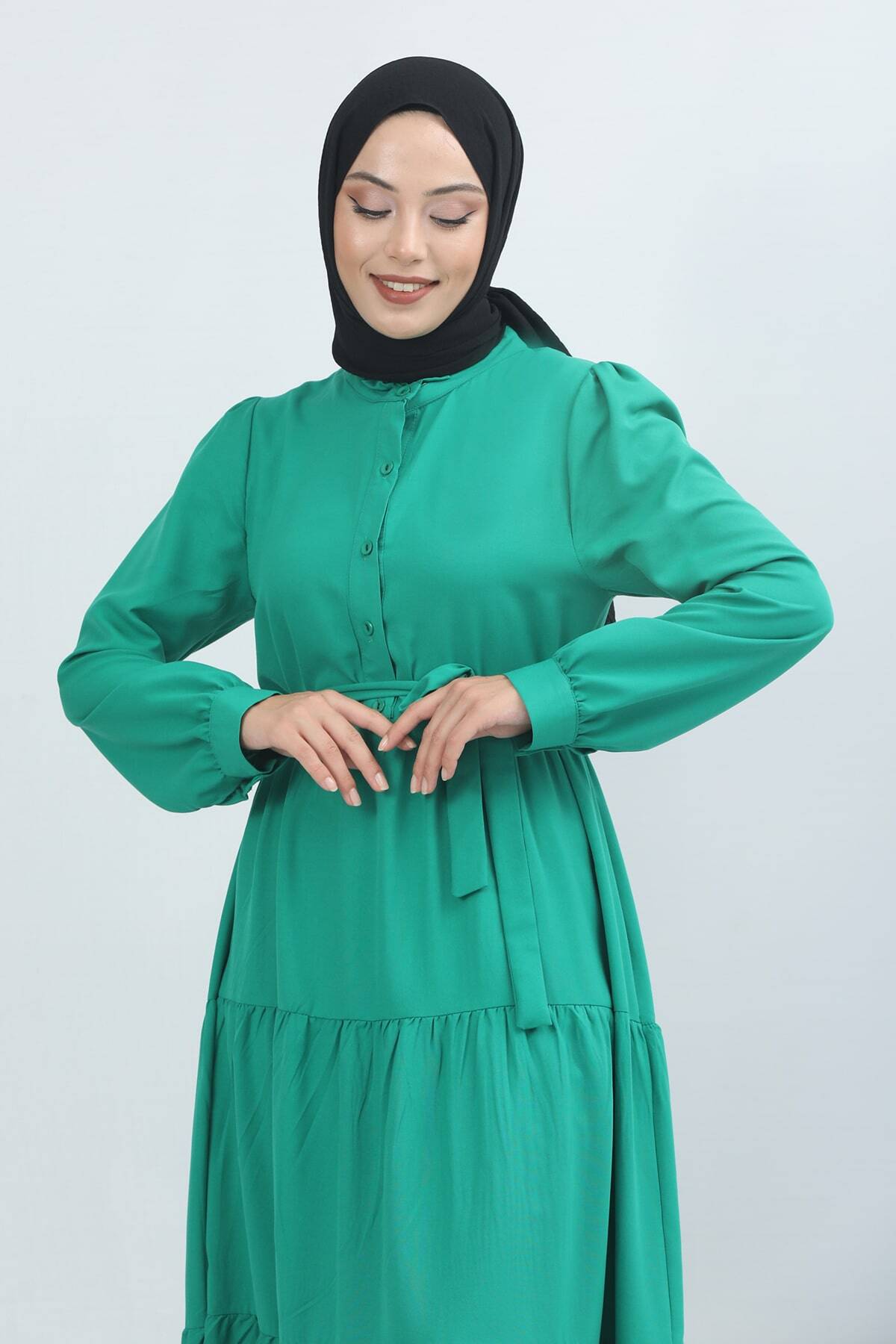 Fırfır yaka detaylı elbise, önden bele kadar düğmelidir. Belden kuşaklıdır tercihen bağlayarak kullanabilirsiniz. Ürün astarsızdır iç göstermez.