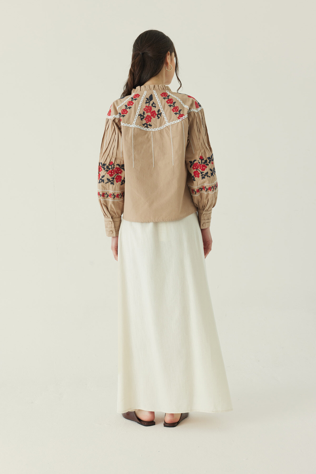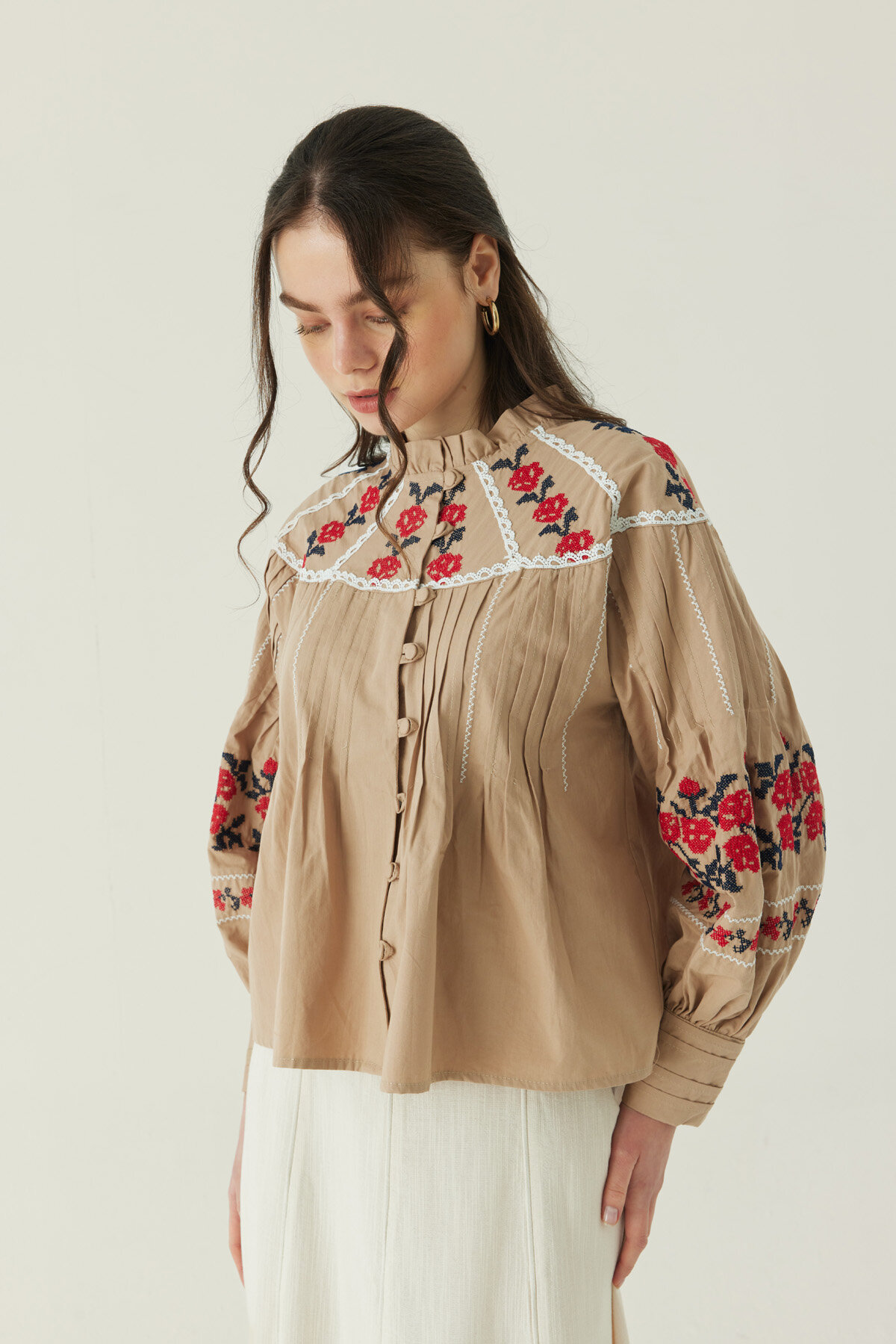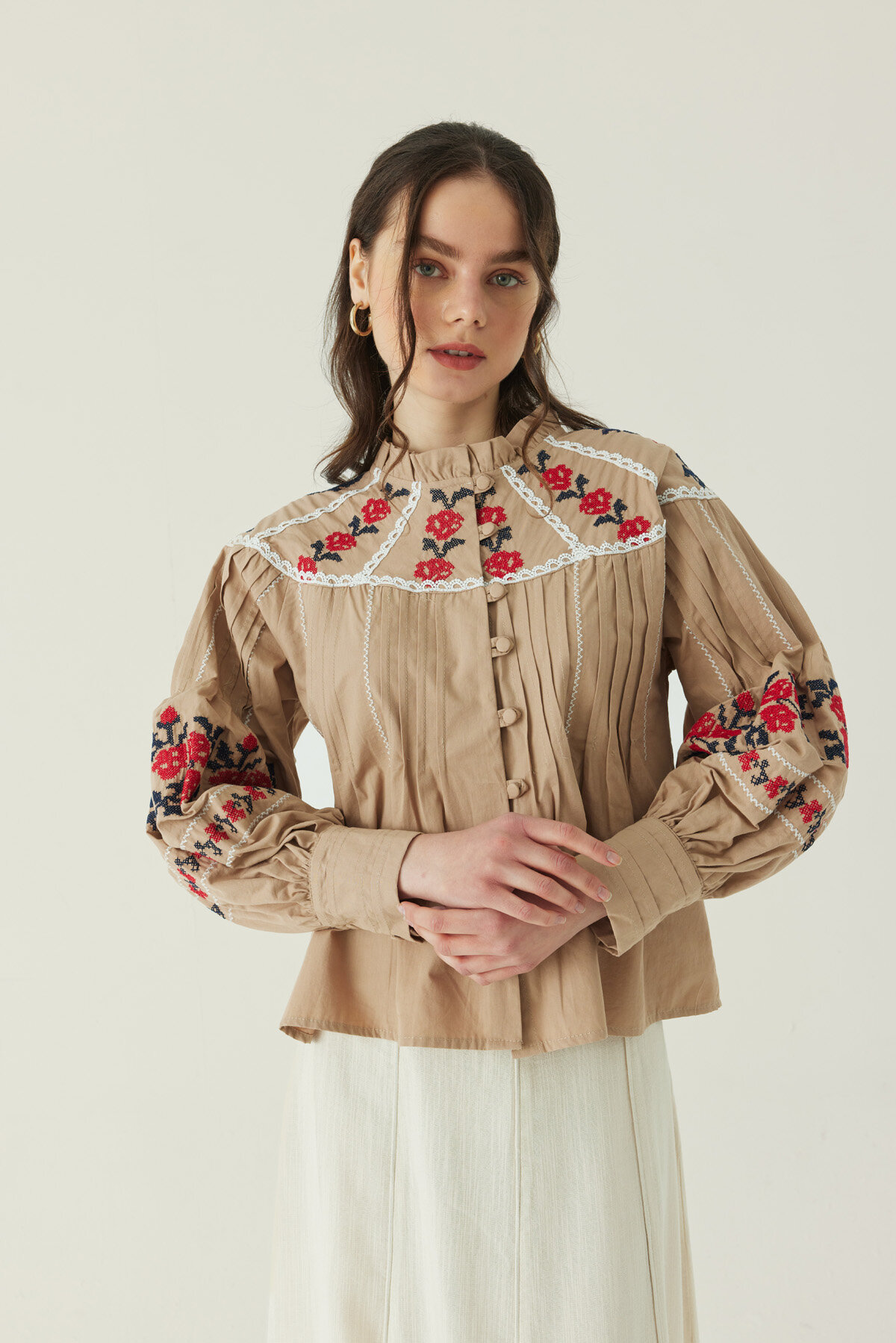 Zarif dantel ve nakış dokunuşlarıyla öne çıkan Fırfır Yaka Nakışlı Gömlek, romantik ve güçlü bir silueti bir arada sunar. Ön ve kol kısımlarındaki pile detayları tasarıma hacim kazandırırken, brit düğme kapaması modele ince bir karakter katar. Tasarım çizgisiyle hem klasik hem modern kombinlere uyum sağlayan, gardırobun özel parçalarından biridir.