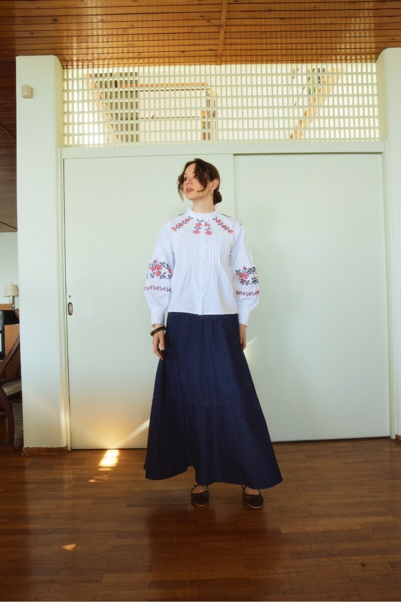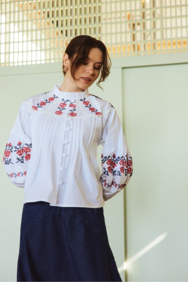 Fırfır Yaka Nakışlı Gömlek Beyaz