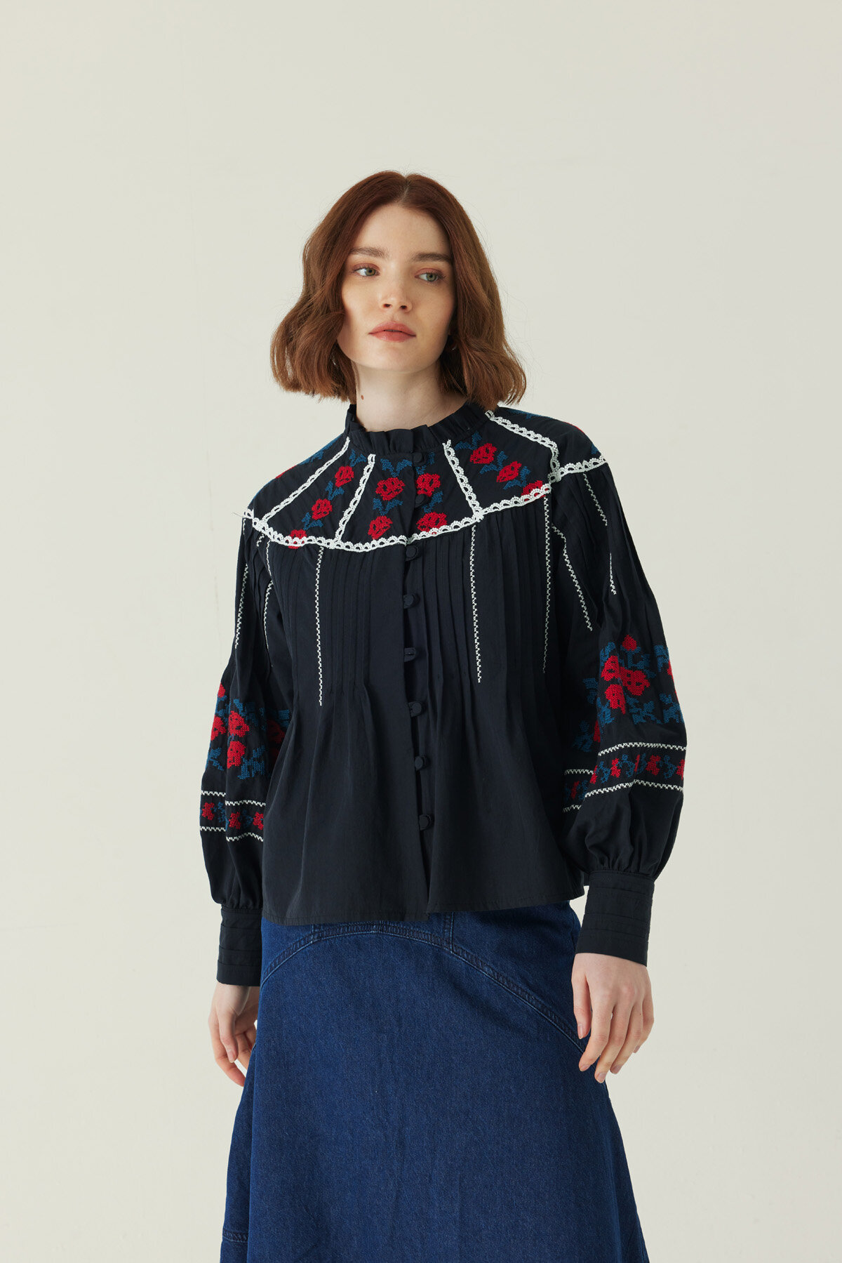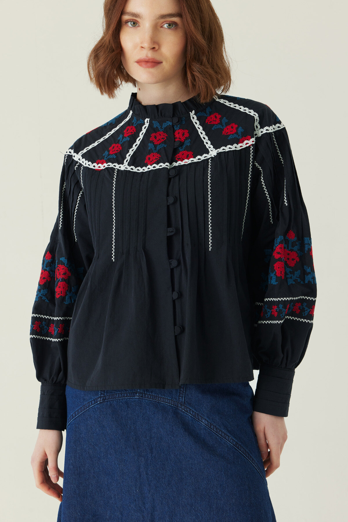 Fırfır Yaka Nakışlı Gömlek
