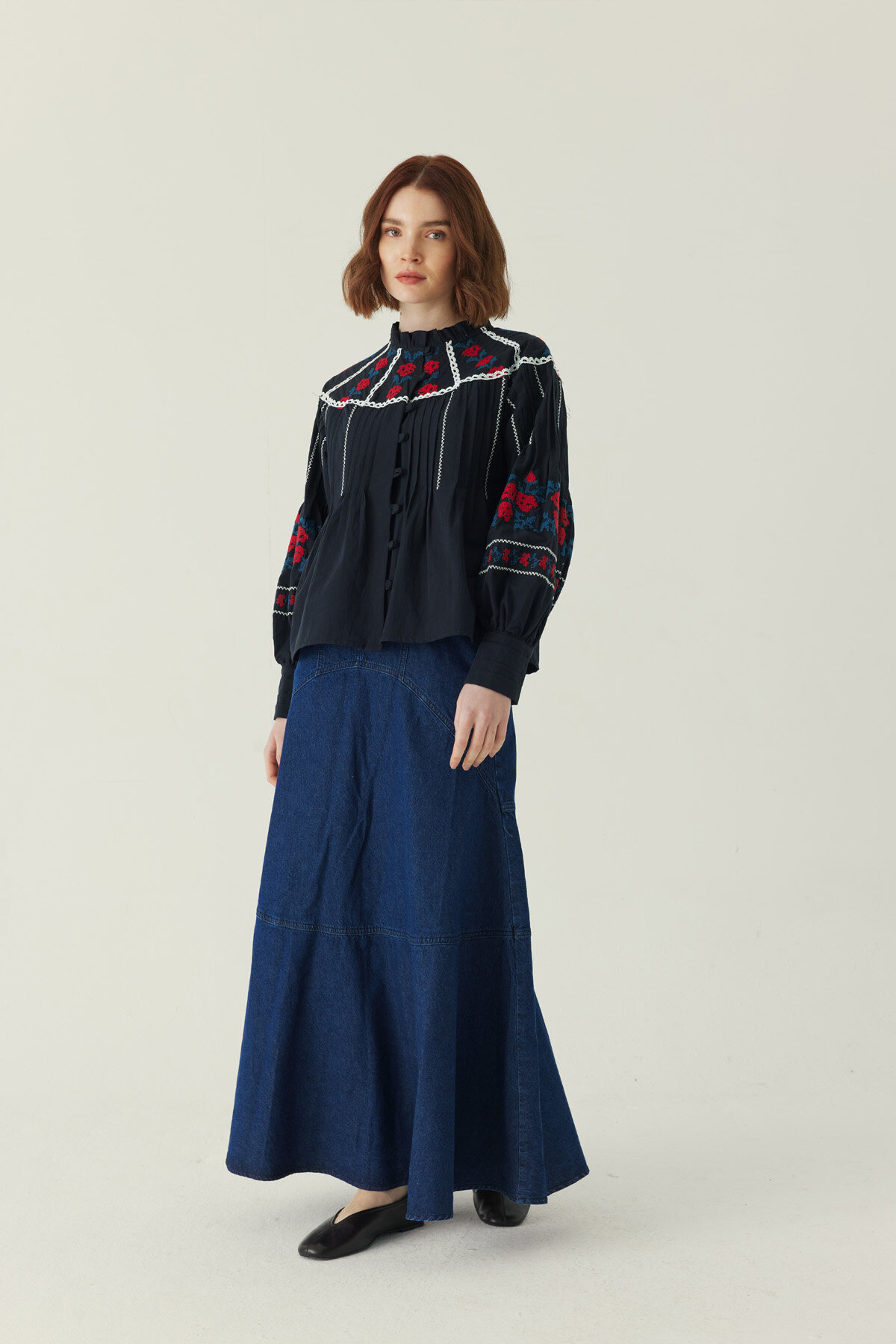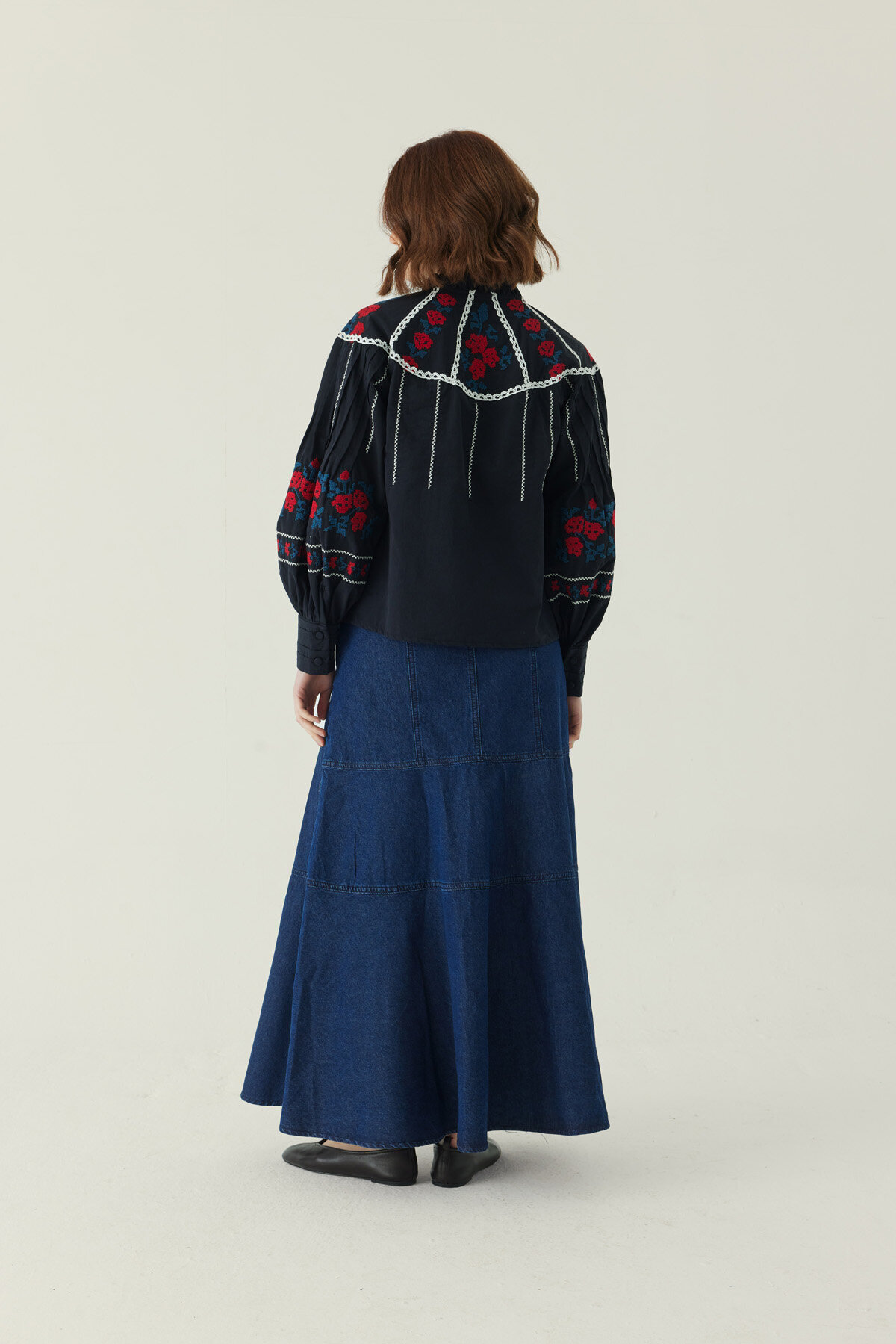 Fırfır Yaka Nakışlı Gömlek Siyah