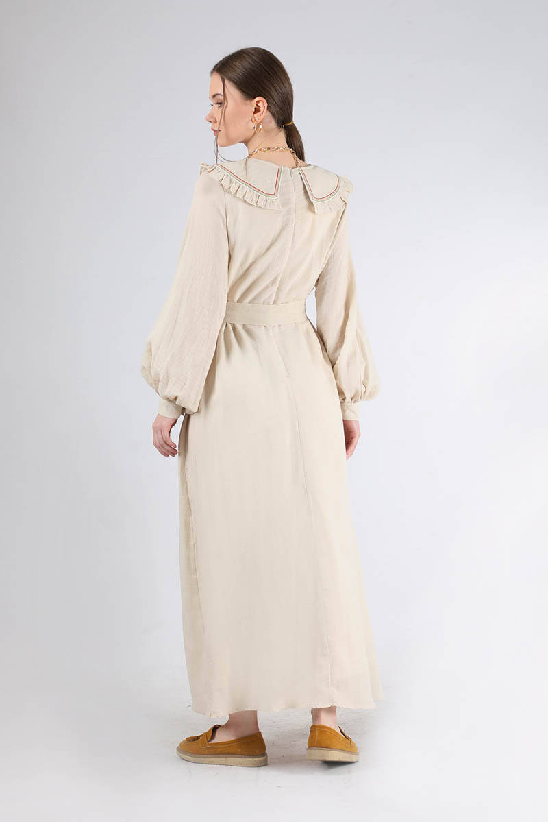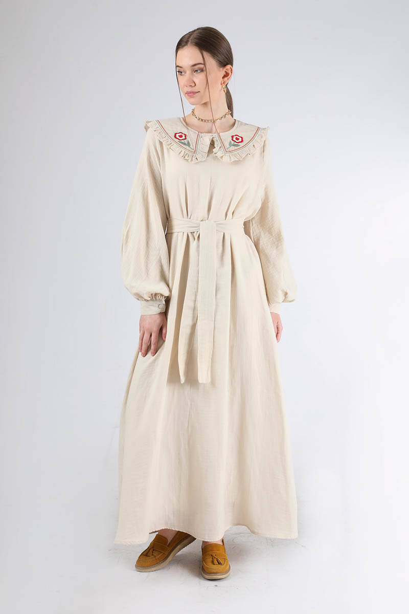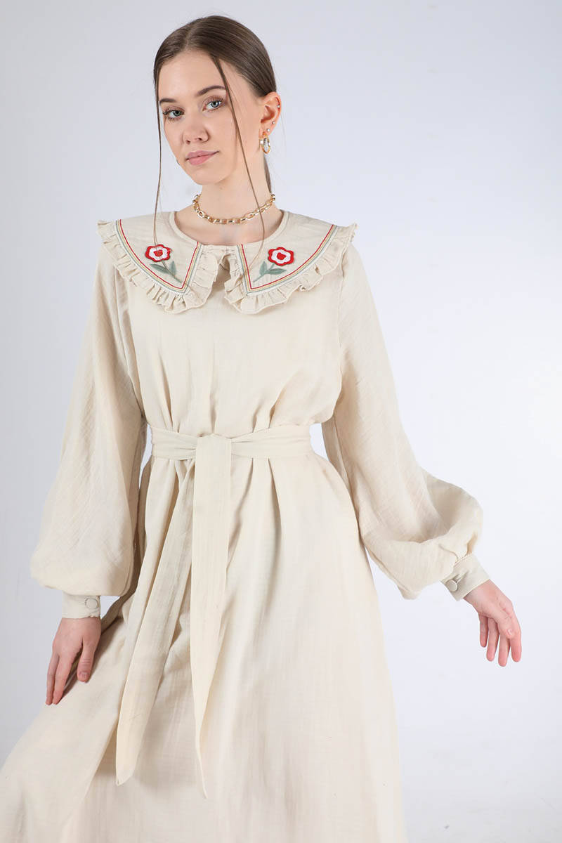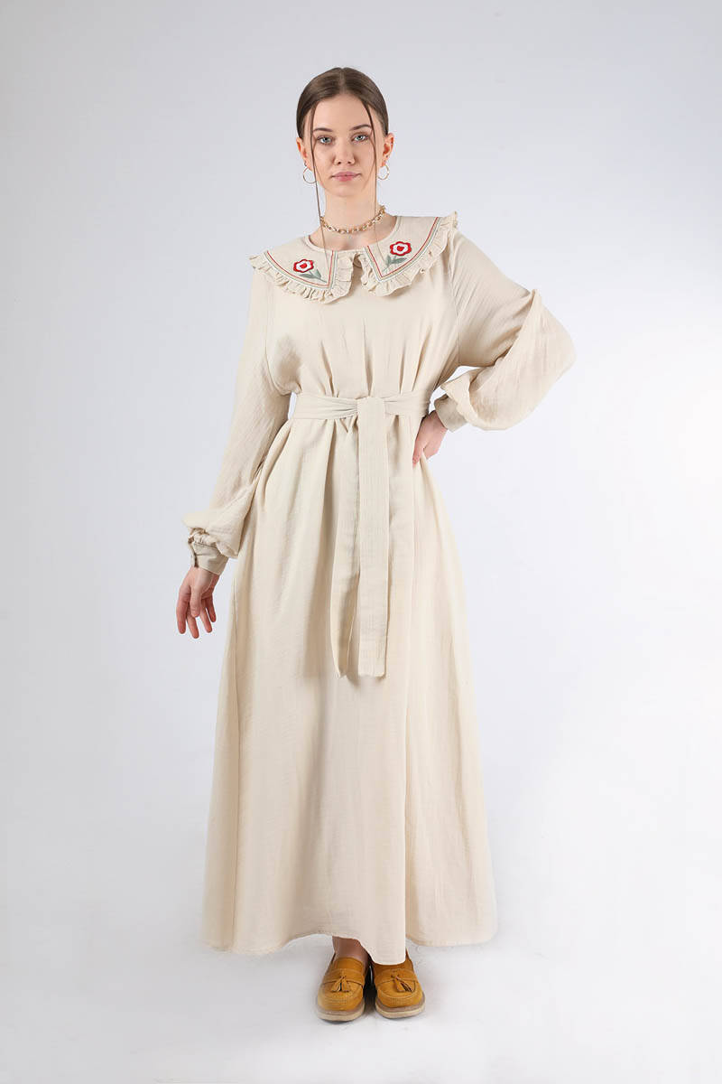Fırfırlı Bebe Yaka Elbise Krem. Yakası fırfırlıdır. Yakası nakışlıdır. Manşeti düğmelidir. Arkadan fermuarlıdır. Kuşaklıdır. Astarsızdır ( İç göstermez). Normal kalıptır. Günlük kullanım ve Özel günlerinizde tercih edebilirsiniz.