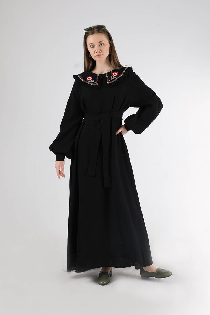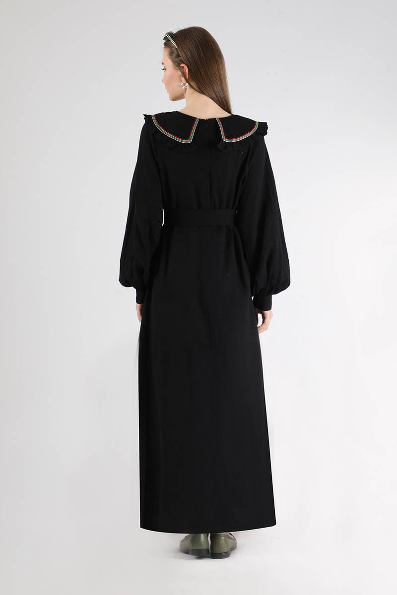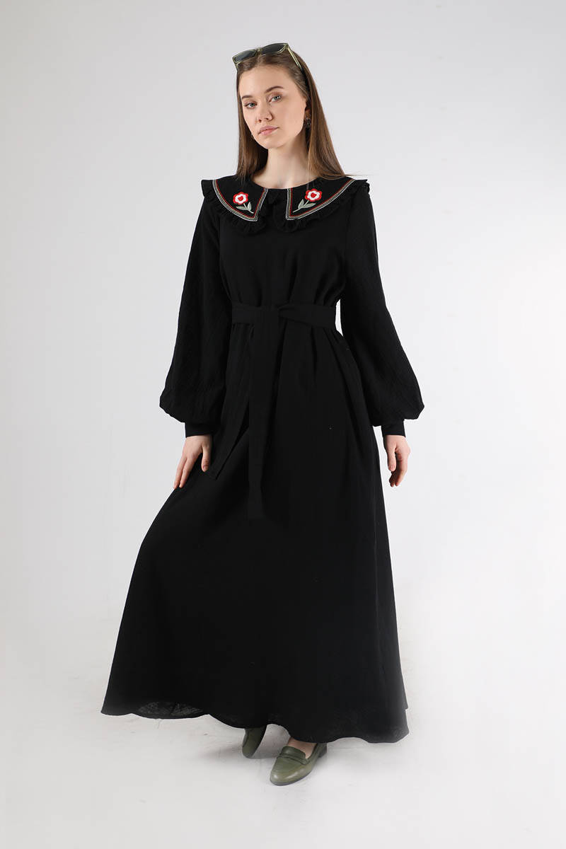 Fırfırlı Bebe Yaka Elbise Siyah. Yakası fırfırlıdır. Yakası nakışlıdır. Manşeti düğmelidir. Arkadan fermuarlıdır. Kuşaklıdır. Astarsızdır ( İç göstermez). Normal kalıptır. Günlük kullanım ve Özel günlerinizde tercih edebilirsiniz.
