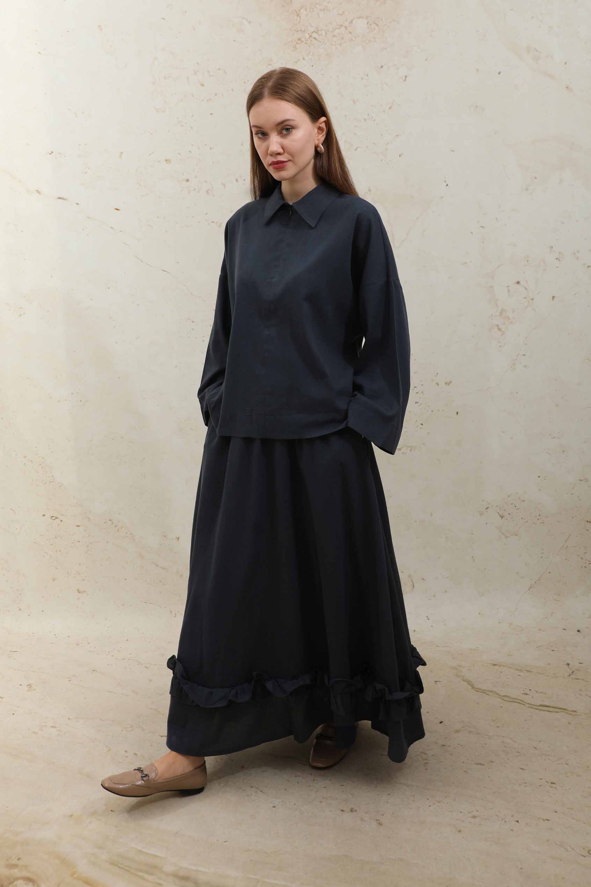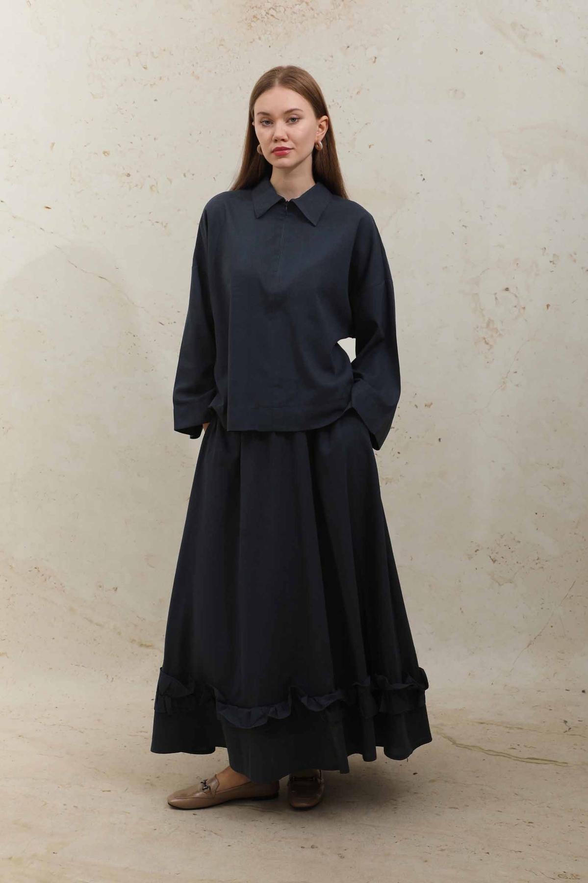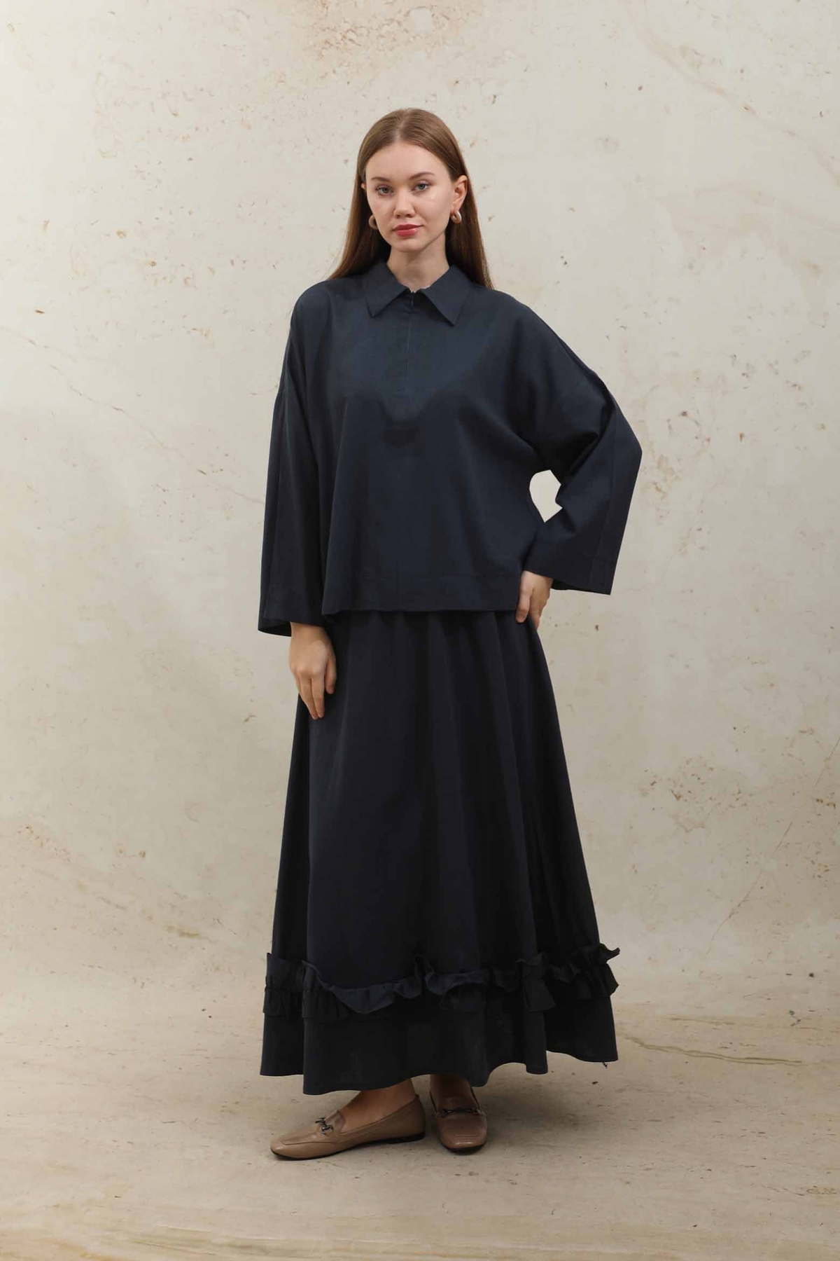 Fırfırlı Takım Lacivert. Düşük omuzludur, gömlek yakalıdır, önden yarı fermuarlıdır, geniş kolludur, etek beli lastiklidir, yandan ceplidir, etek ucu fırfırlıdır, astarlıdır.