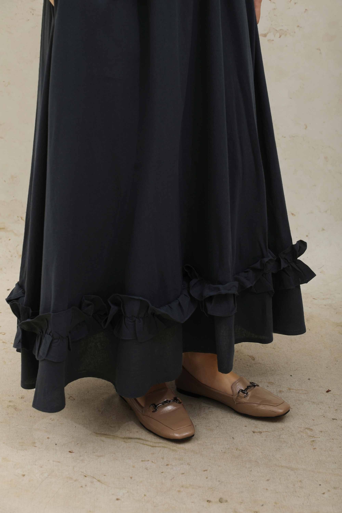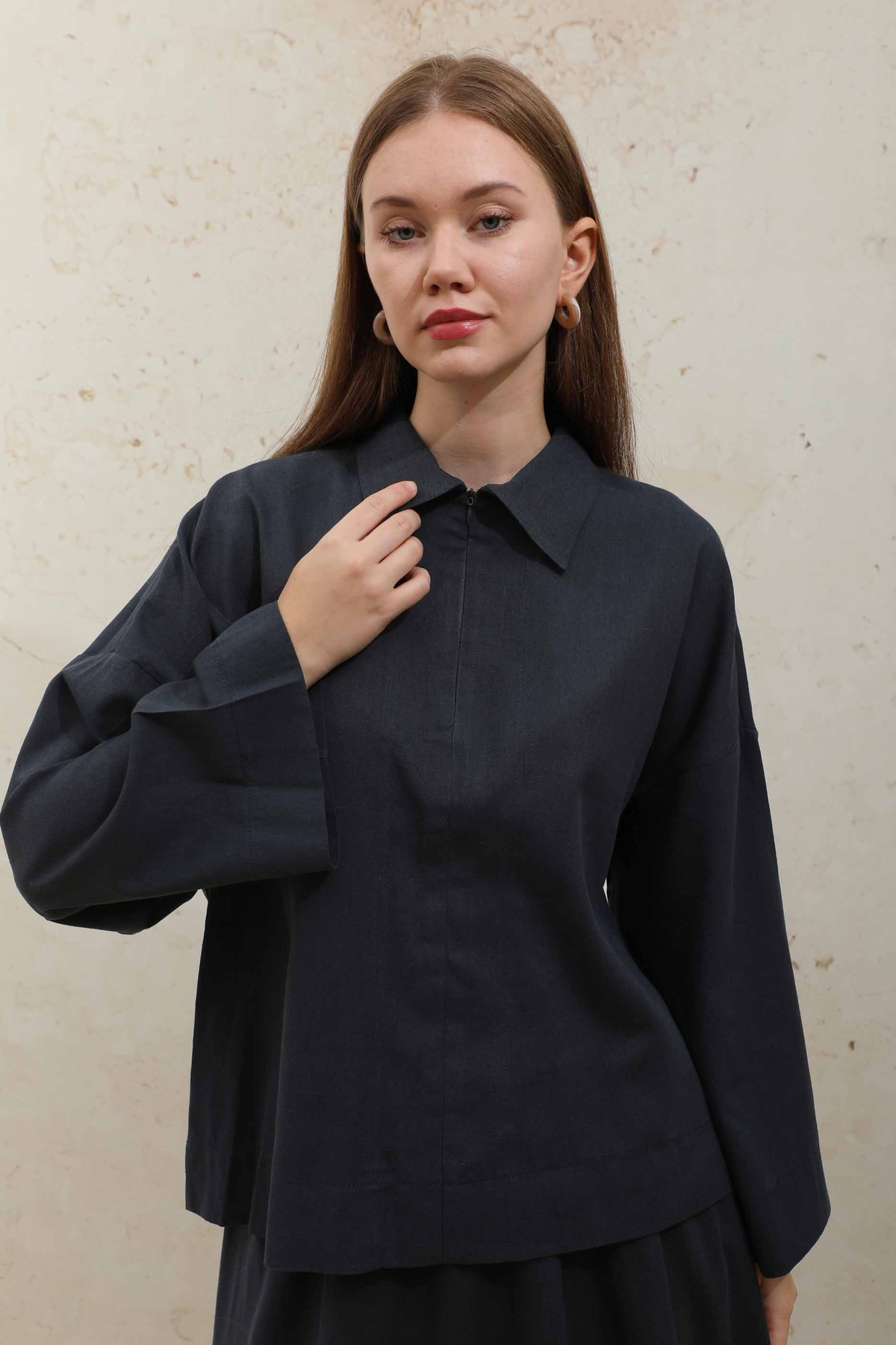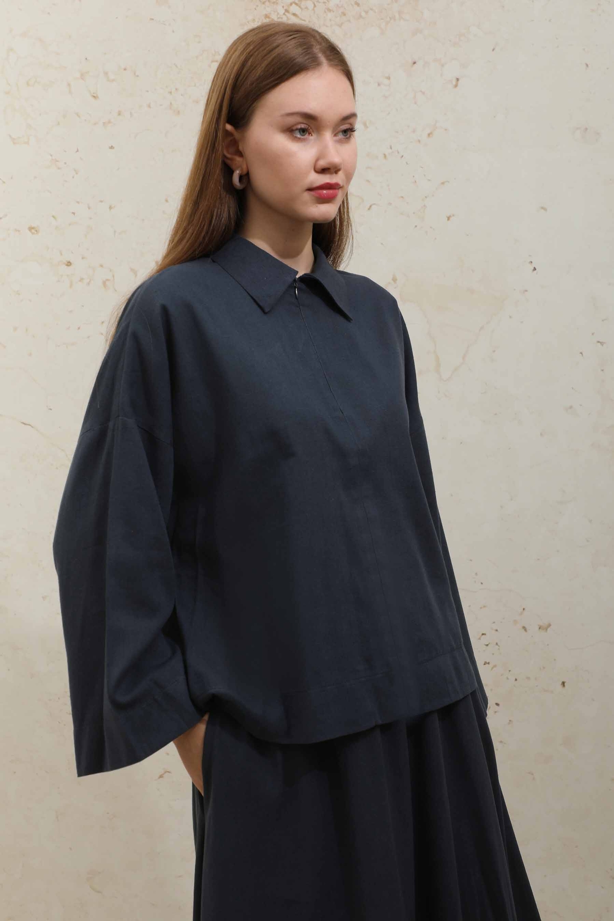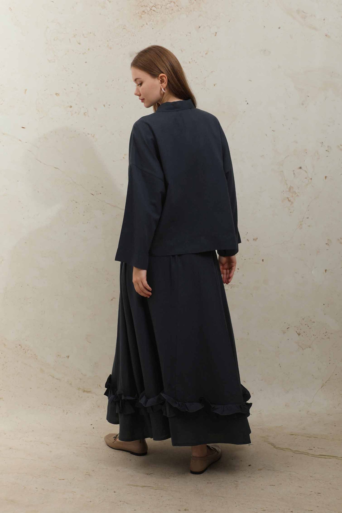 Fırfırlı Takım Lacivert. Düşük omuzludur, gömlek yakalıdır, önden yarı fermuarlıdır, geniş kolludur, etek beli lastiklidir, yandan ceplidir, etek ucu fırfırlıdır, astarlıdır.