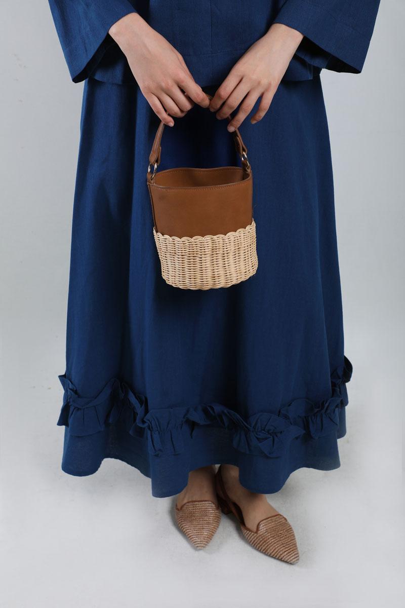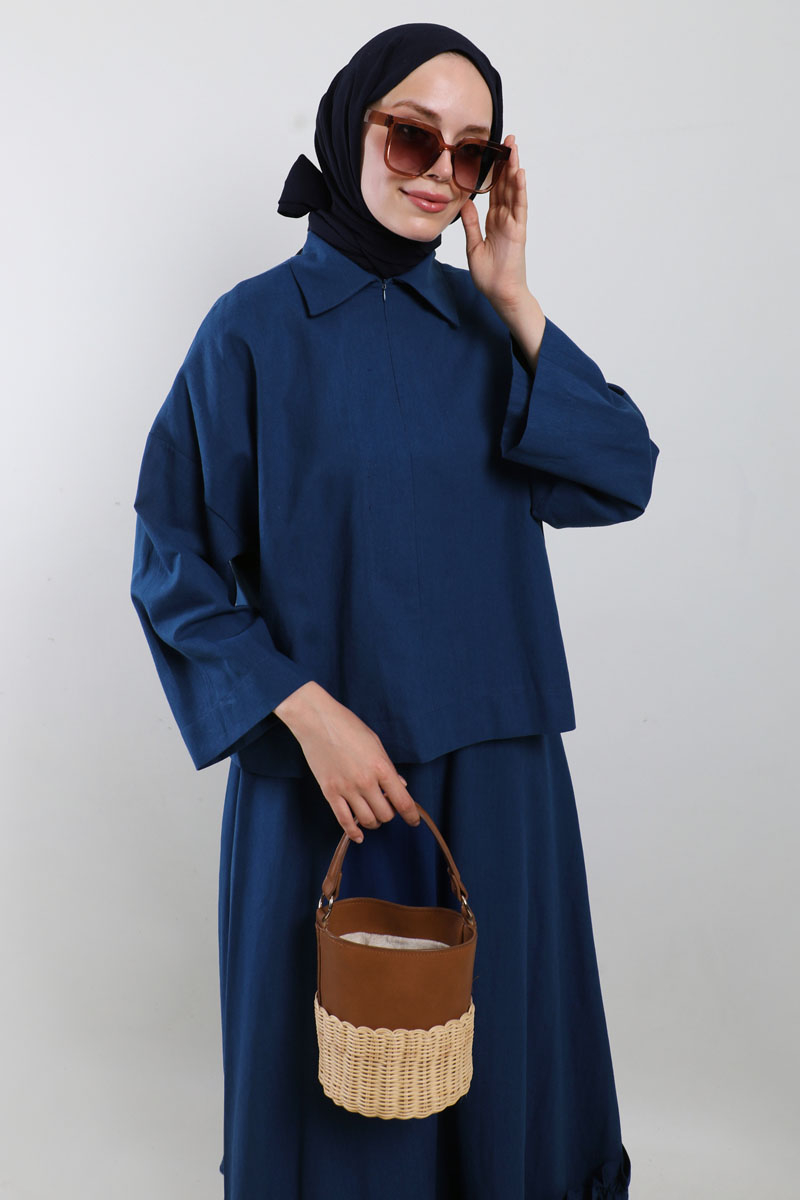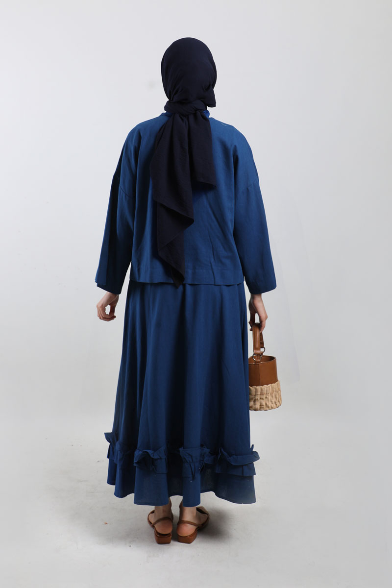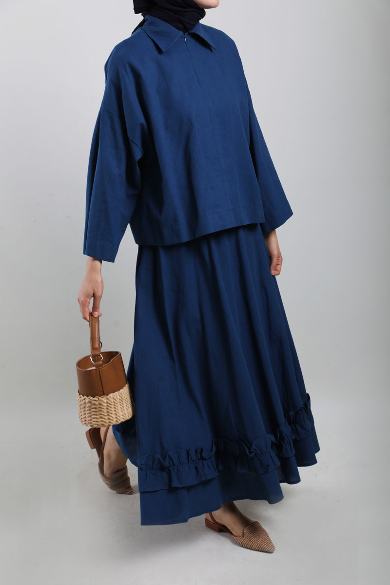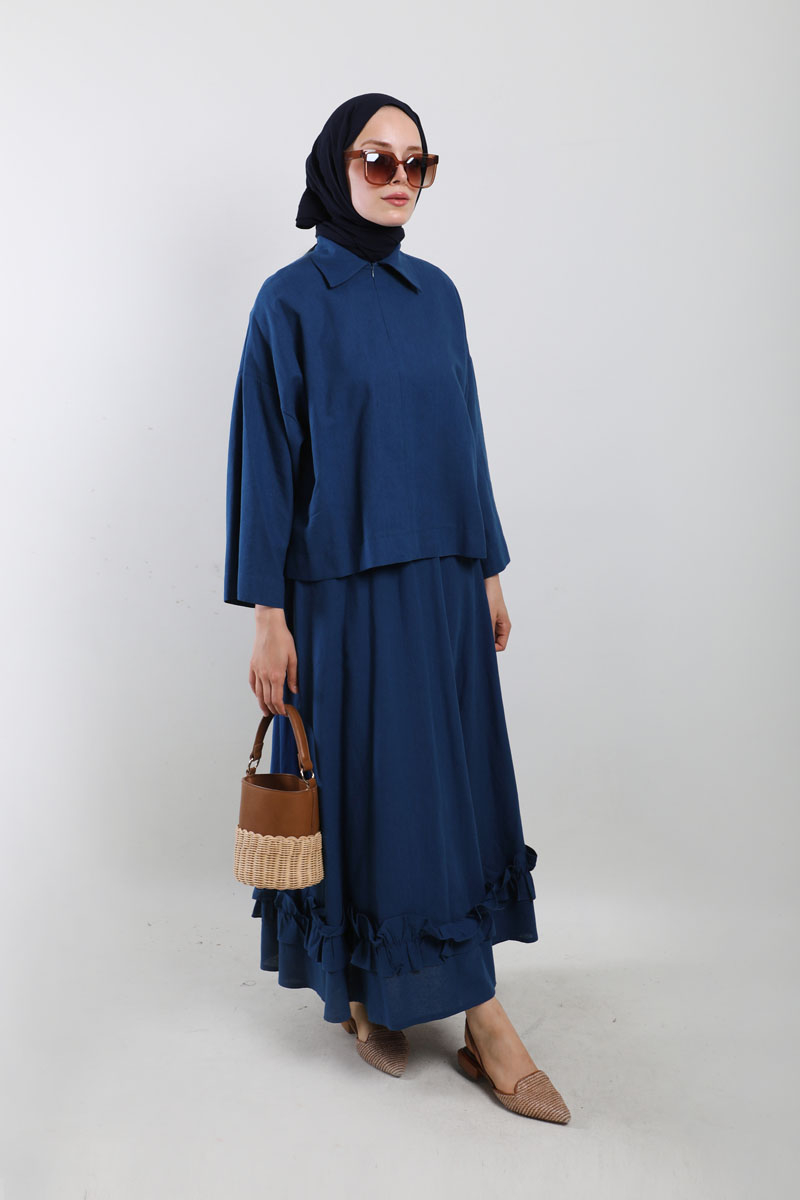 Fırfırlı Takım Saks Mavisi. Düşük omuzludur, gömlek yakalıdır, önden yarı fermuarlıdır, geniş kolludur, etek beli lastiklidir, yandan ceplidir, etek ucu fırfırlıdır, astarlıdır.