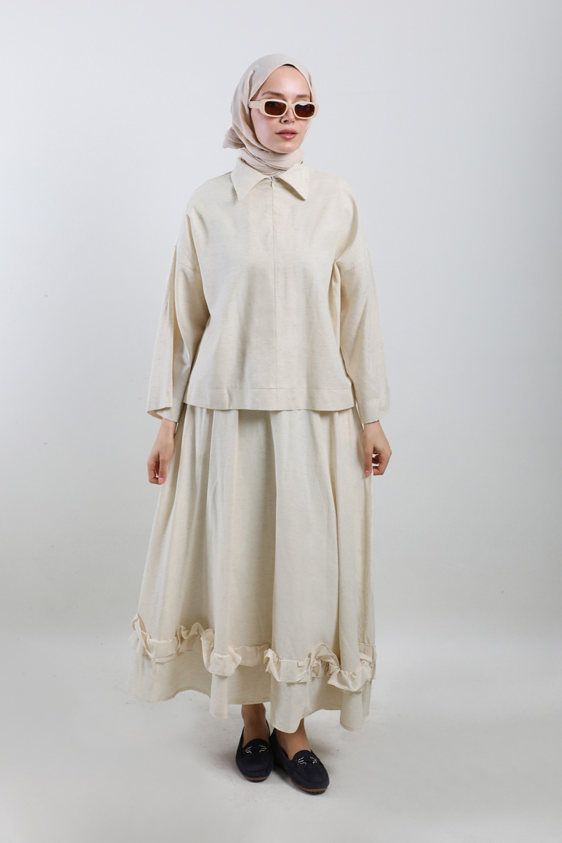 Fırfırlı Takım Taş. Düşük omuzludur, gömlek yakalıdır, önden yarı fermuarlıdır, geniş kolludur, etek beli lastiklidir, yandan ceplidir, etek ucu fırfırlıdır, astarlıdır.