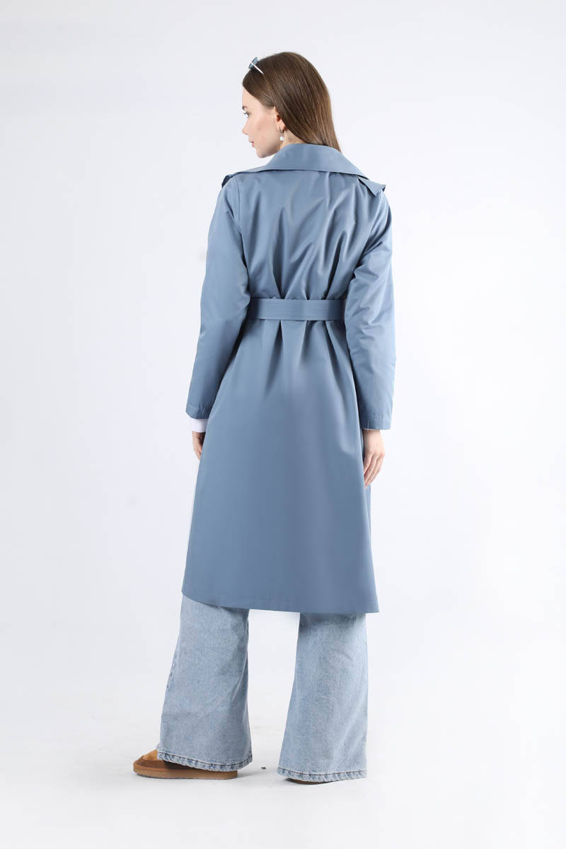 Frilly Trench İndigo is an English collar and double-breasted closure. There are frill details on the sides of the collar. The trench coat is belted at the waist and has pocket details. The product is lined.