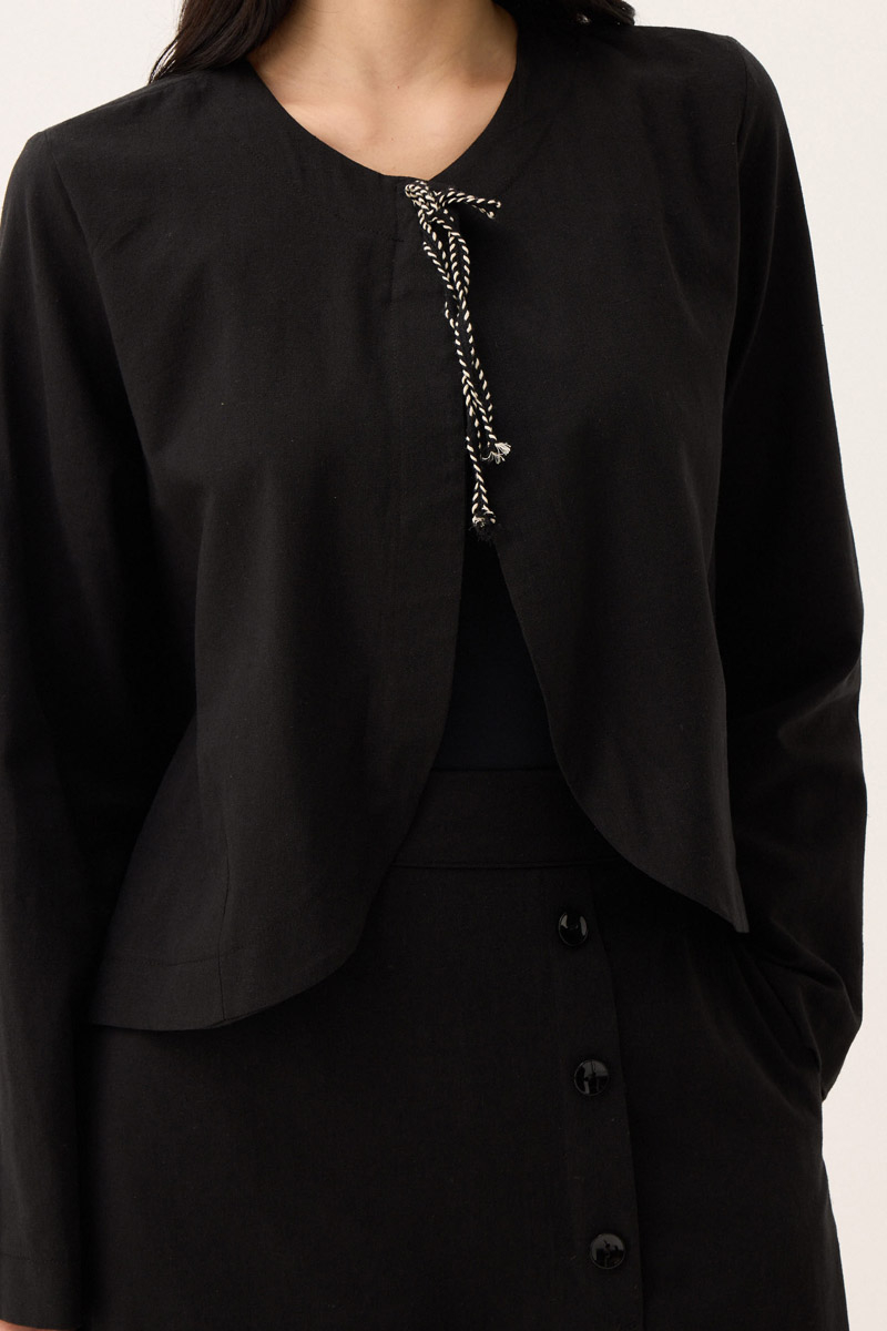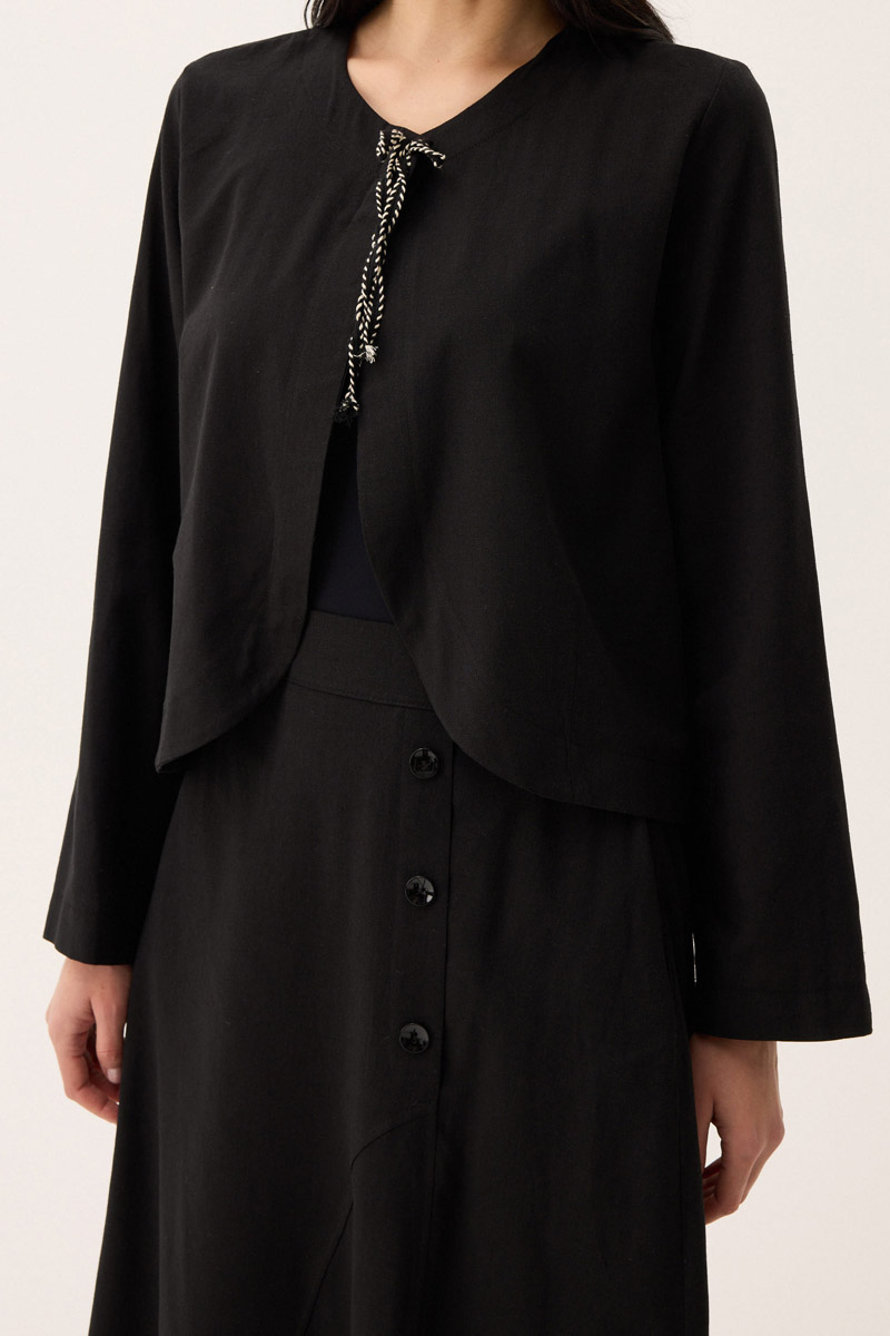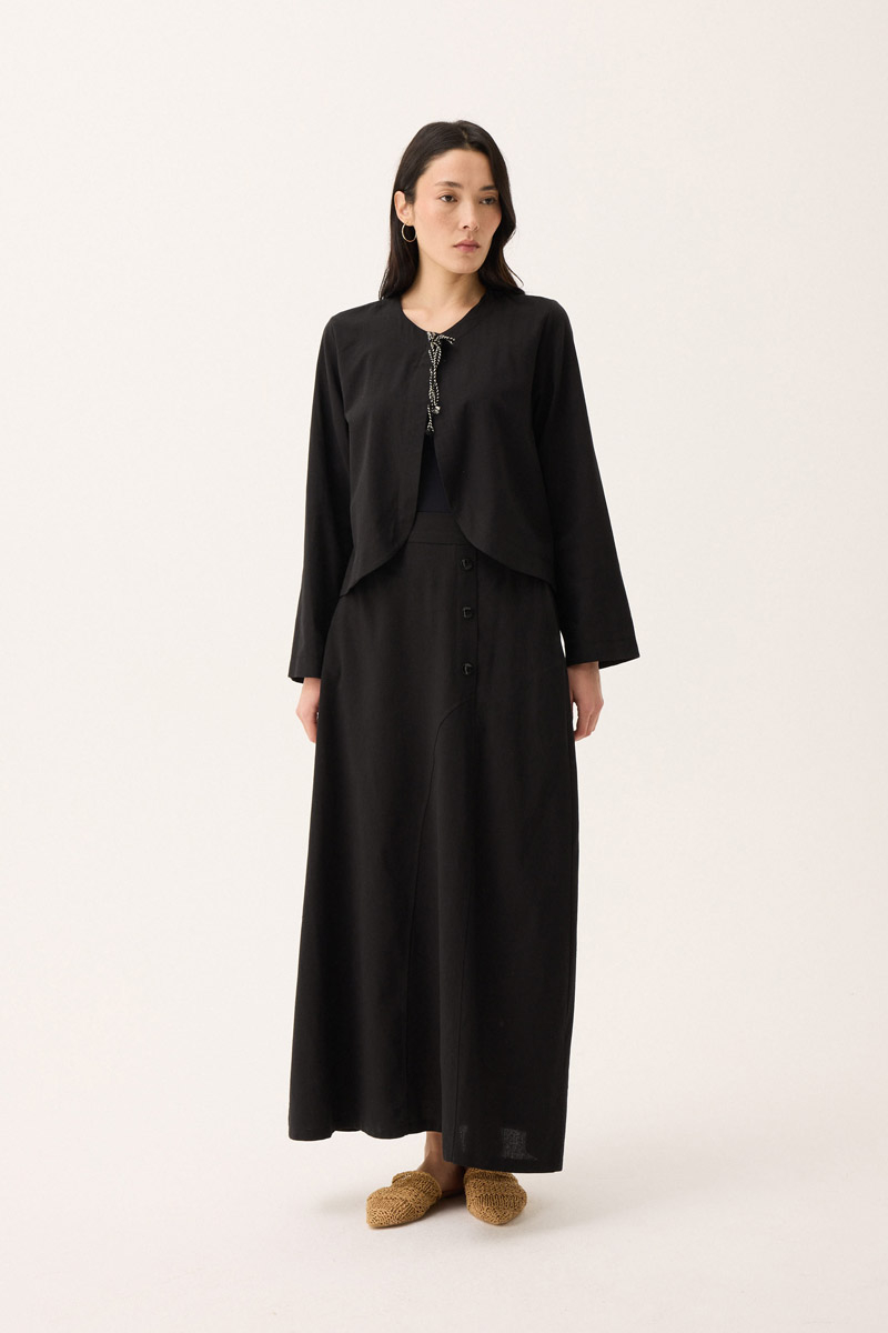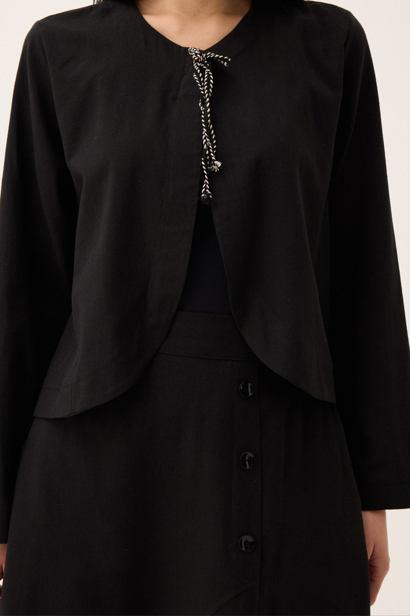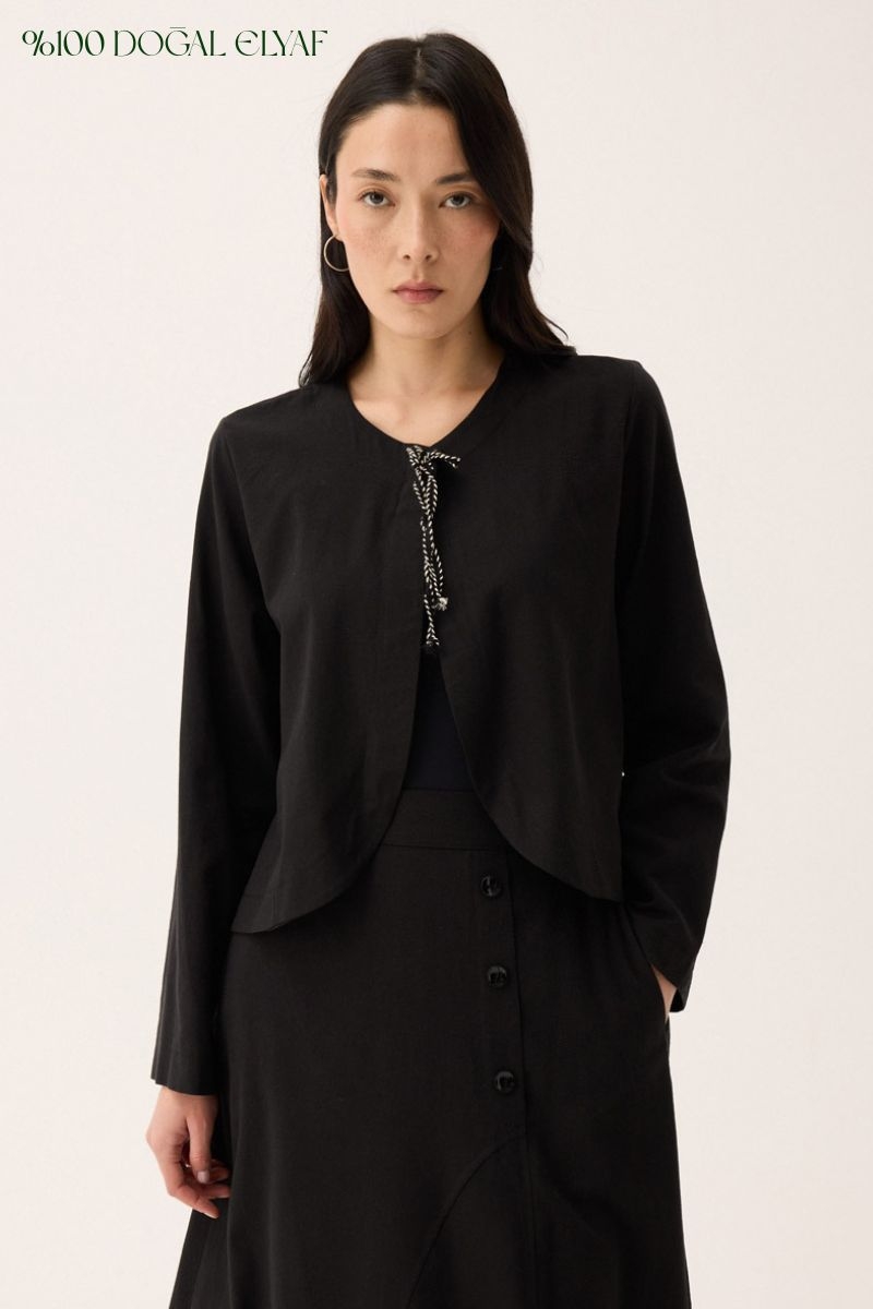 Fiyonklu Sayina Etek Takım Siyah. Bisiklet yakadır, düşük omuzludur, önden kurdela detaylıdır. Etek asimetrik kuplu süs pat ve düğme detaylıdır, yandan ceplidir, arka bel lastiklidir, astarsızdır. Günlük kullanım ve özel günlerinizde tercih edebilirsiniz.