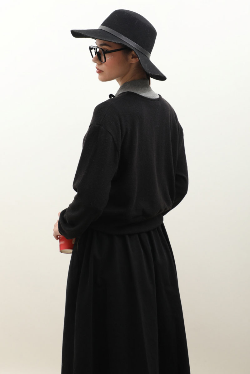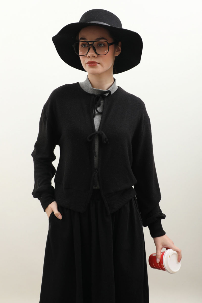Fiyonklu Triko Hırka Siyah. bisiklet yakadır, düşük omuzludur, önden fiyonk detaylıdır, cepsizdir, bilek ve eteği ribanalıdır, cepsizdir. Günlük kullanım ve özel günlerinizde tercih edebilirsiniz.