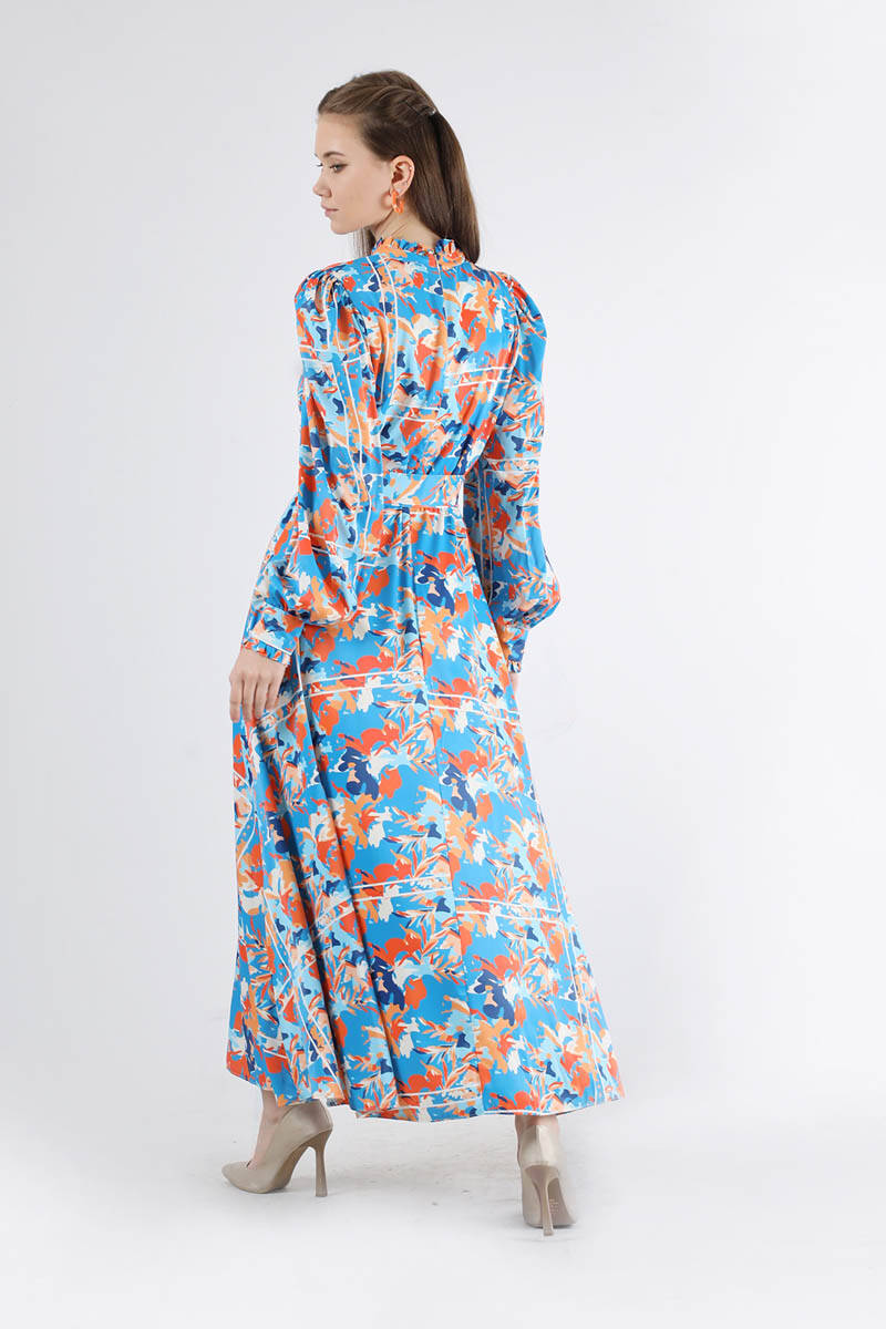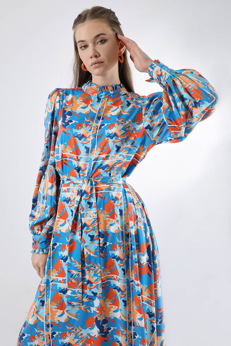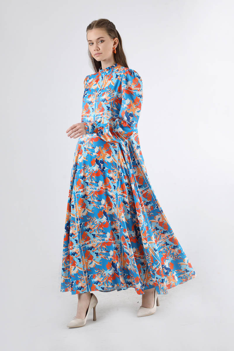 Flora Pattern Floral Dress Blue, Ruffled. The cuff is ruffled. His shoulder is shirred. It has a back zipper. is belted. It is unlined. It's a normal pattern. You can choose it for your daily use and special days.