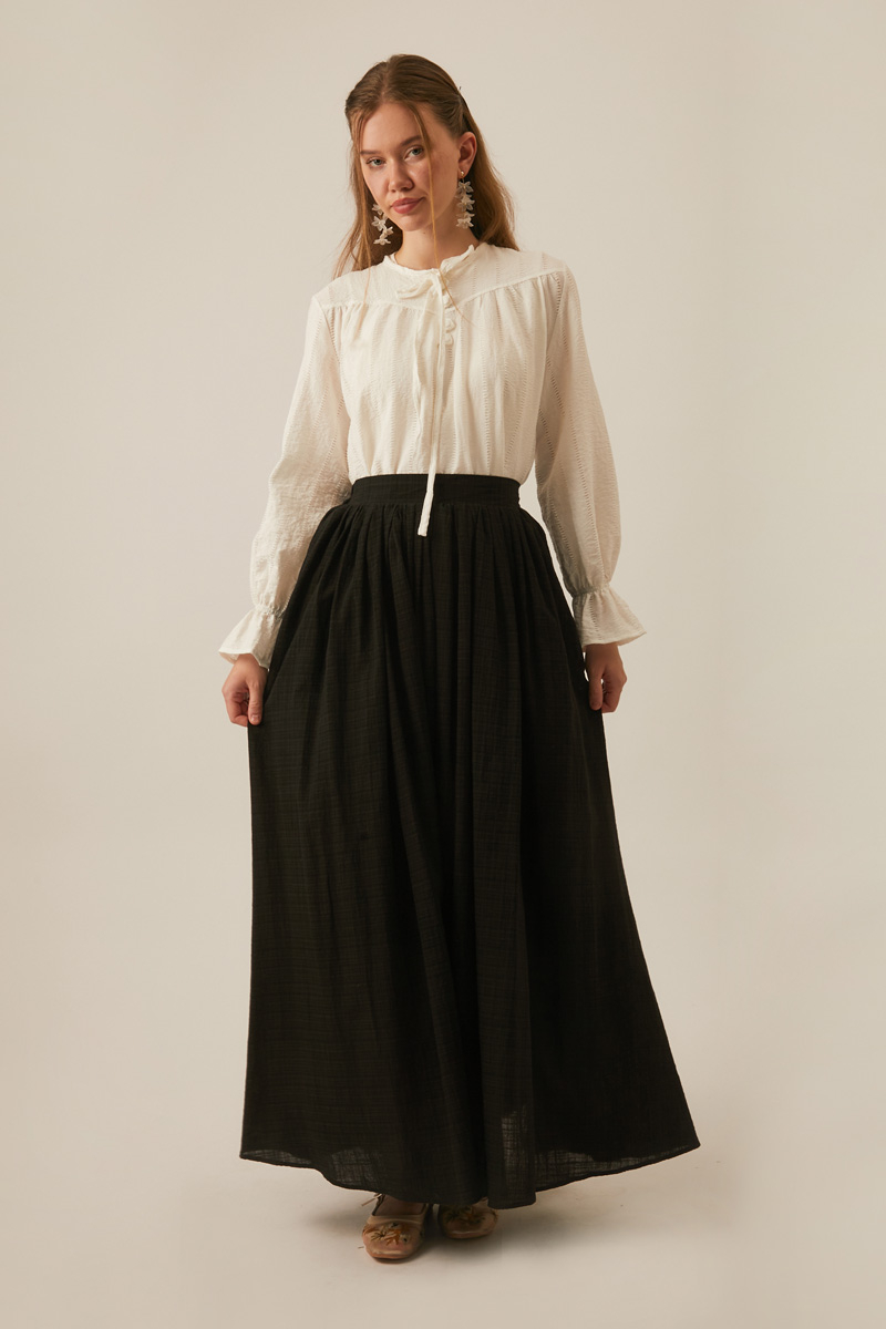 Flora Etek Siyah, Doğal ve otantik bir tarz arayanlar için tasarlanmış bu pamuk dokulu etek, gardırobunuza rahat ve sofistike bir dokunuş katıyor. %100 pamuk içeriği ve özel flamlı dokusu sayesinde gün boyu nefes alabilirlik ve eşsiz bir konfor sunarken, bol kesimi ve büzgülü detaylarıyla modern ve şık bir görünüm sağlar.